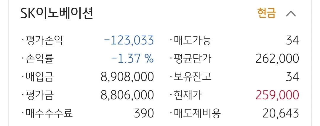 사진 2. SK이노베이션. 12만 원 손실 중이다.