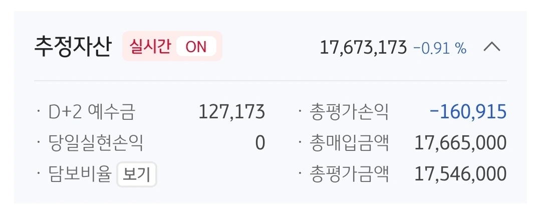 사진 1. 추정자산. 1767만 원. 원금 이천에서 233만 원 손실 중이다.