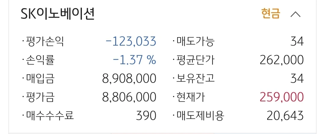 사진 2. SK이노베이션. 12만 원 손실 중.