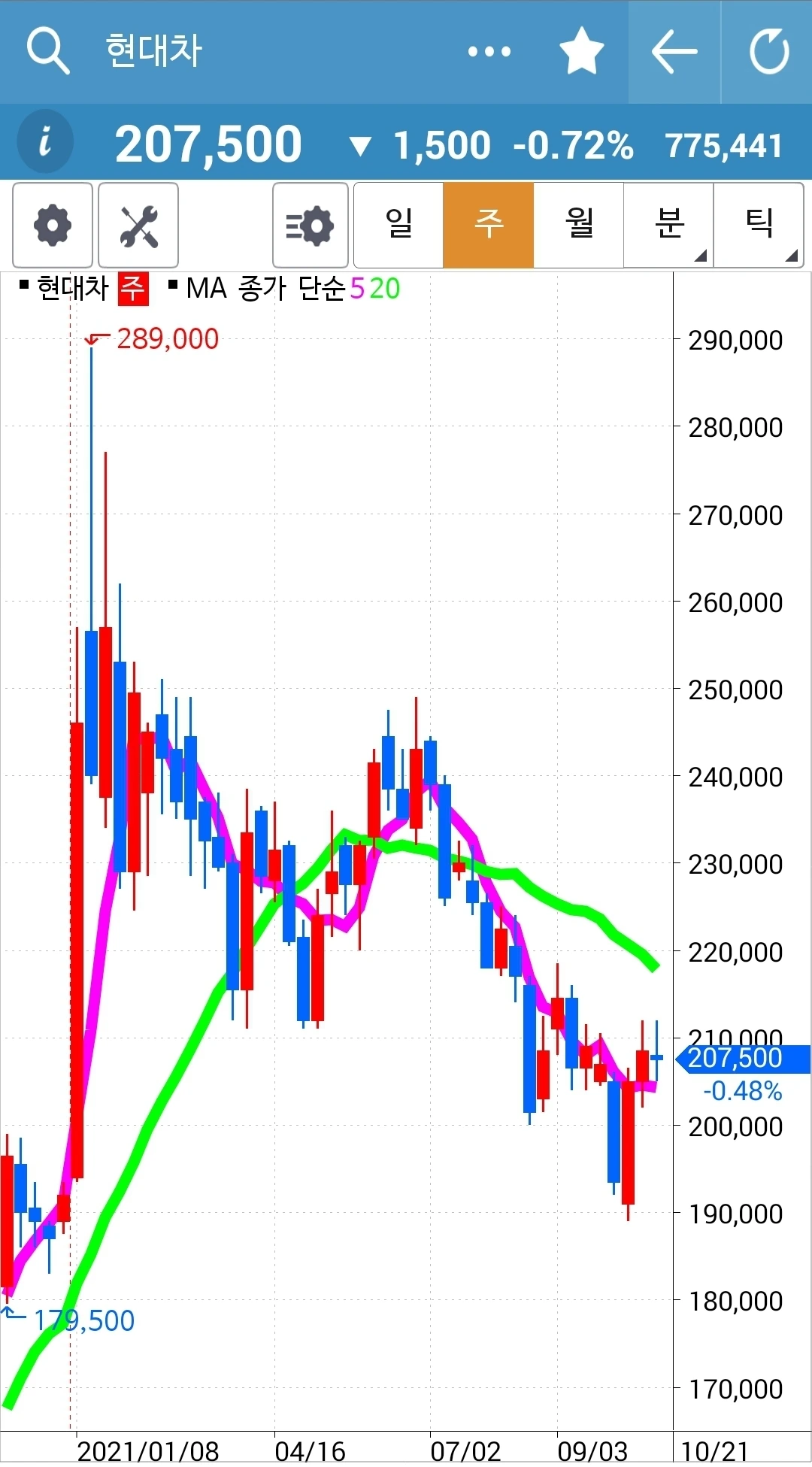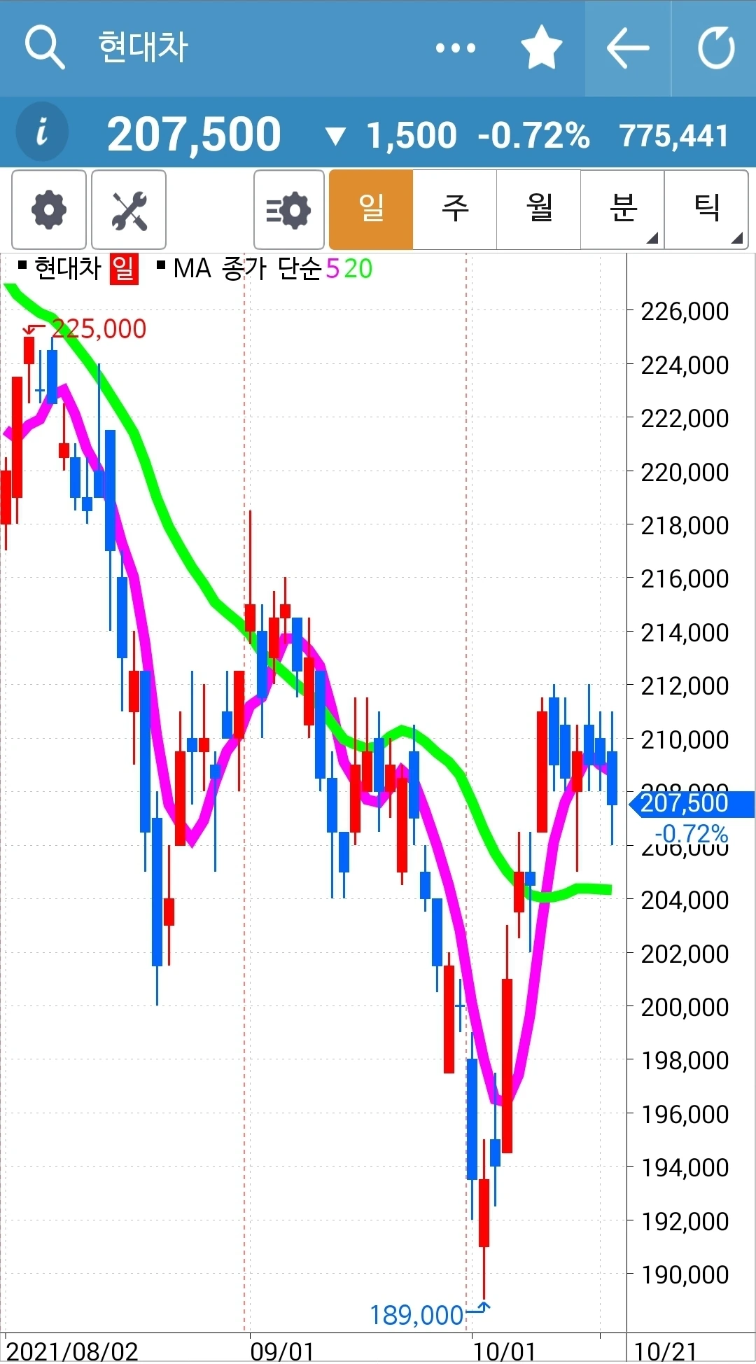 아직 5일선이 20일선 위에 있어 아무 행동 안 했다. '난 아무것도 몰라요~ 5일선이 20일선 아래로 가면 매도할뿐야요~'