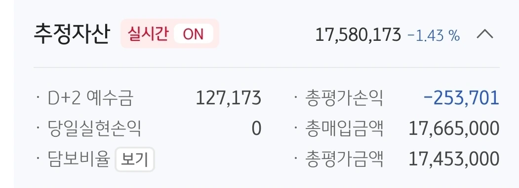 사진 1. 추정자산. 1758만 원. 이천만 원 원금에 242만 원 손실 중.