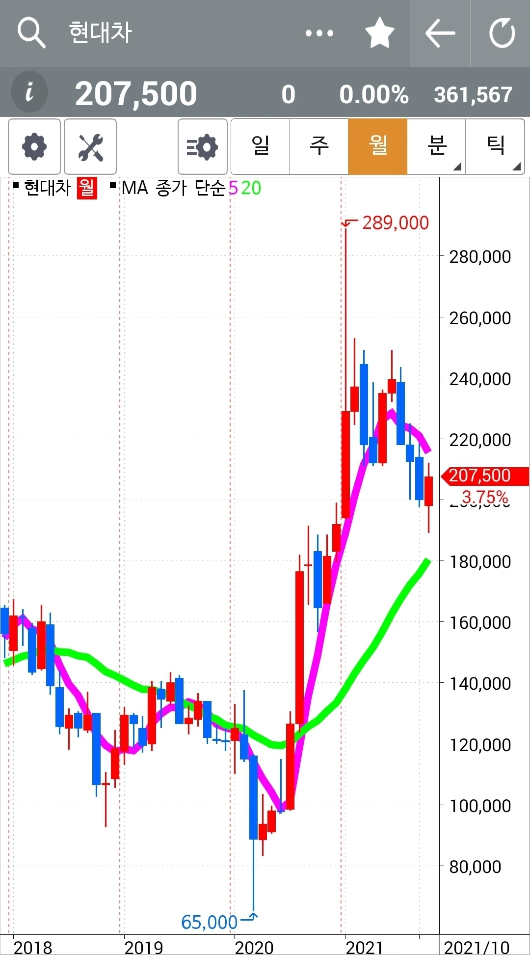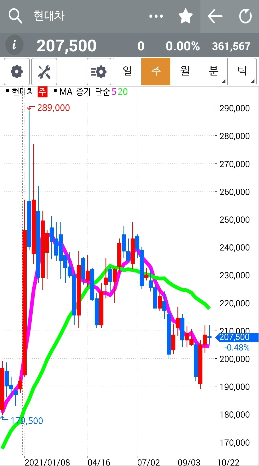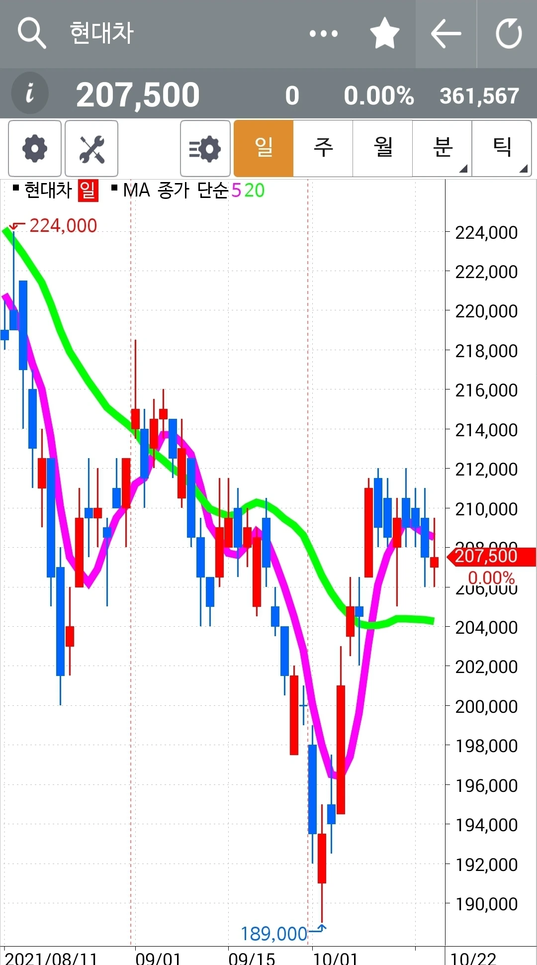 5일선이 20일선 아래로 내려오기 직전 그야말로 아슬아슬이다. 확실히 내려오는 순간 그대로 탈락이다. 난 요것만 할 줄 아니까. '난 아무것도 몰라요~ 5일선이 20일선 아래로 내려가면 매도할 뿐야요~'