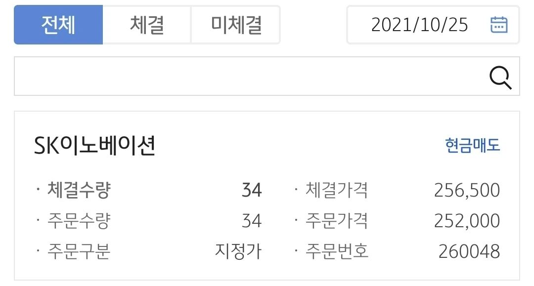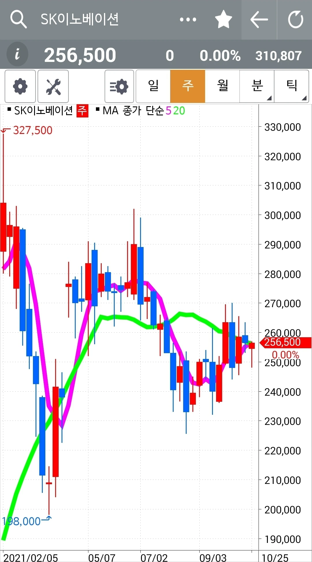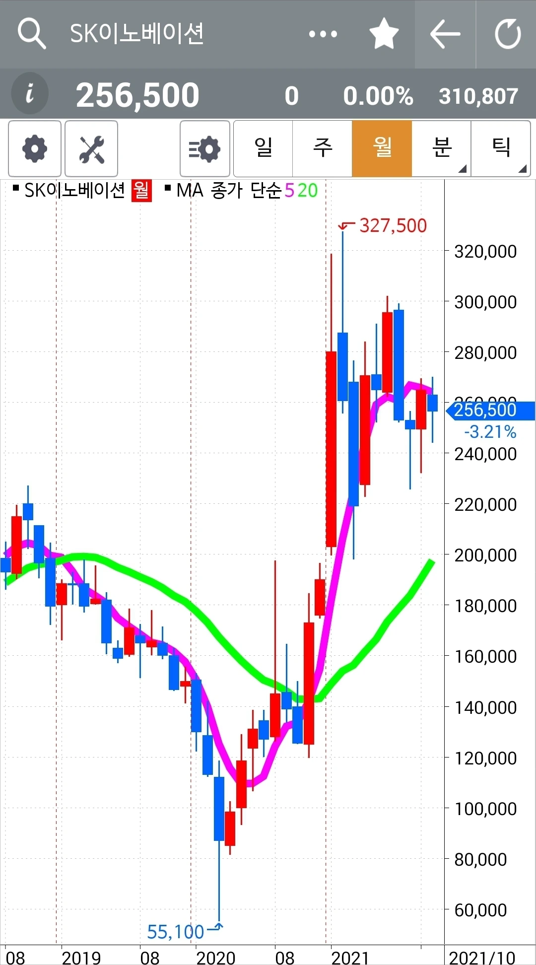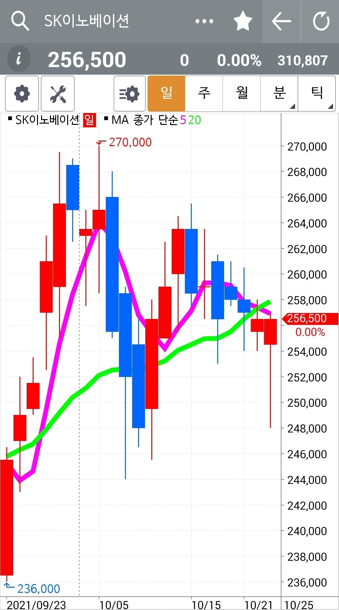 사진 2. SK이노베이션. 5일선이 20일선 아래로 내려가 몽땅 매도한 모습.