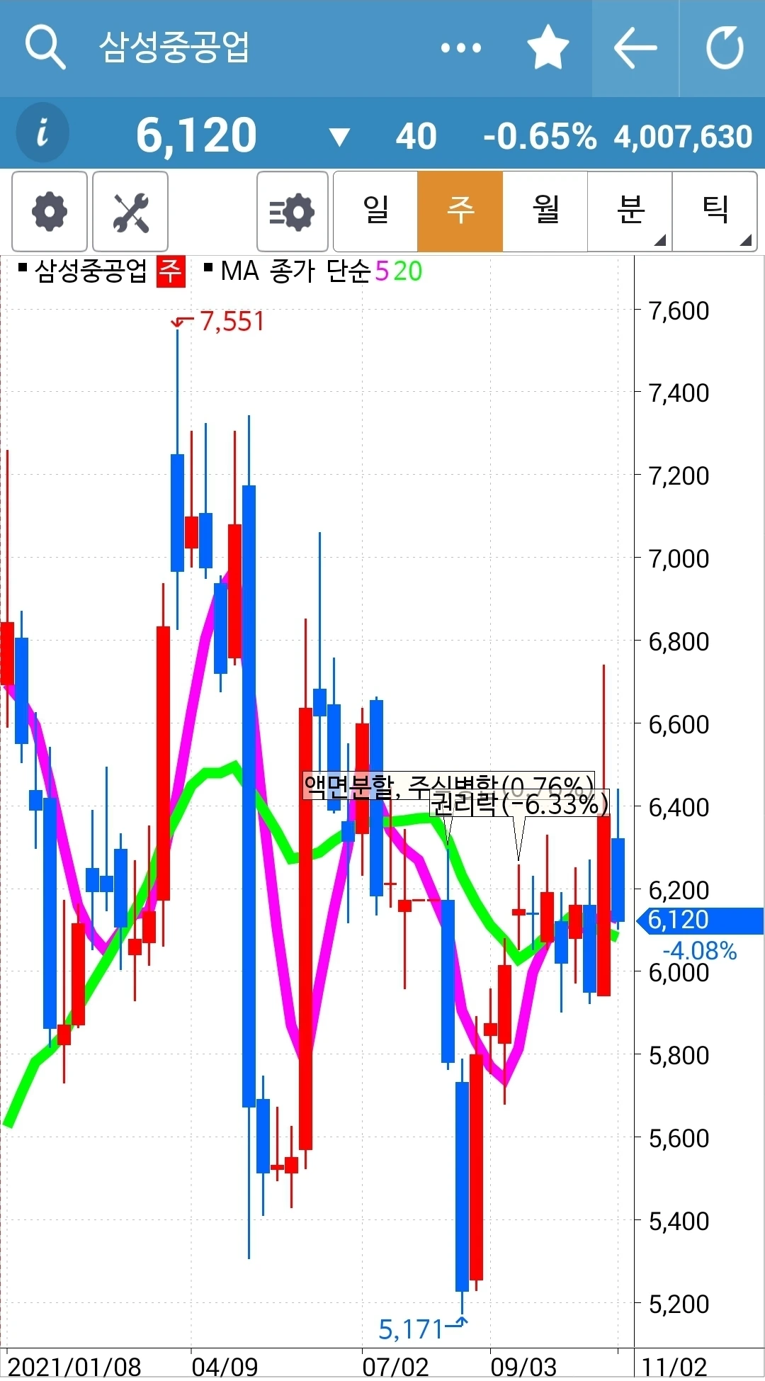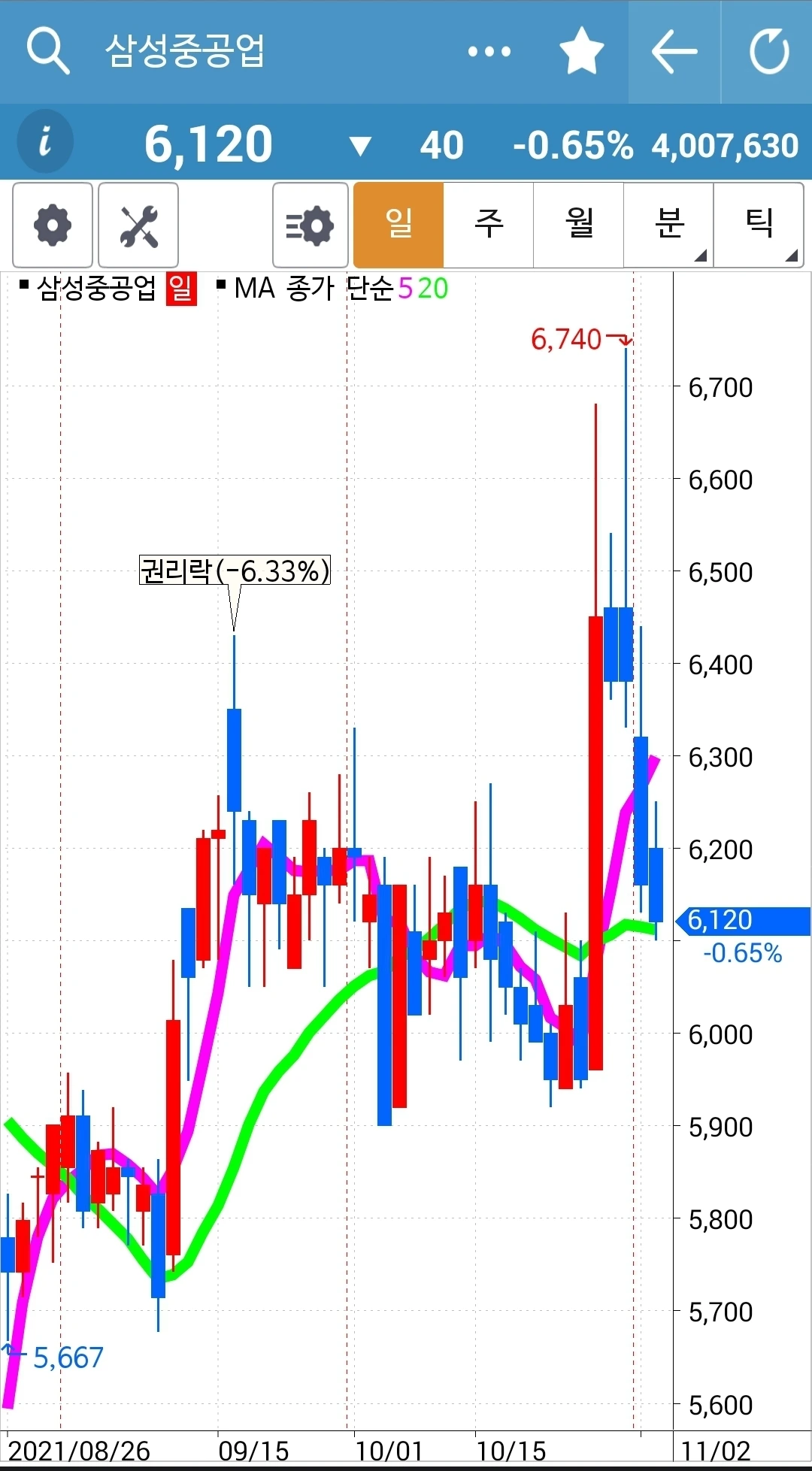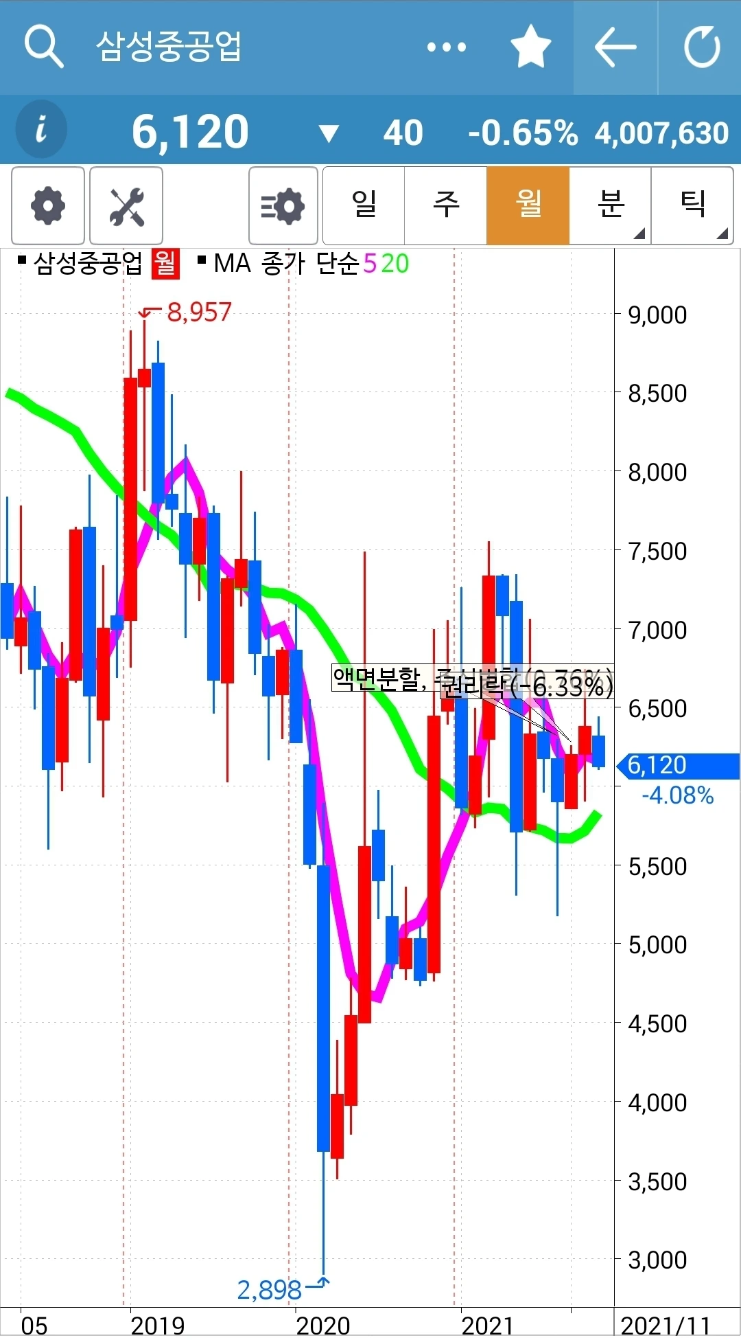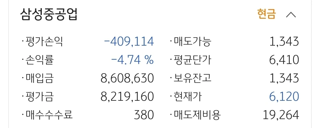 사진 3. 삼성중공업. 40만 원 손실 중.