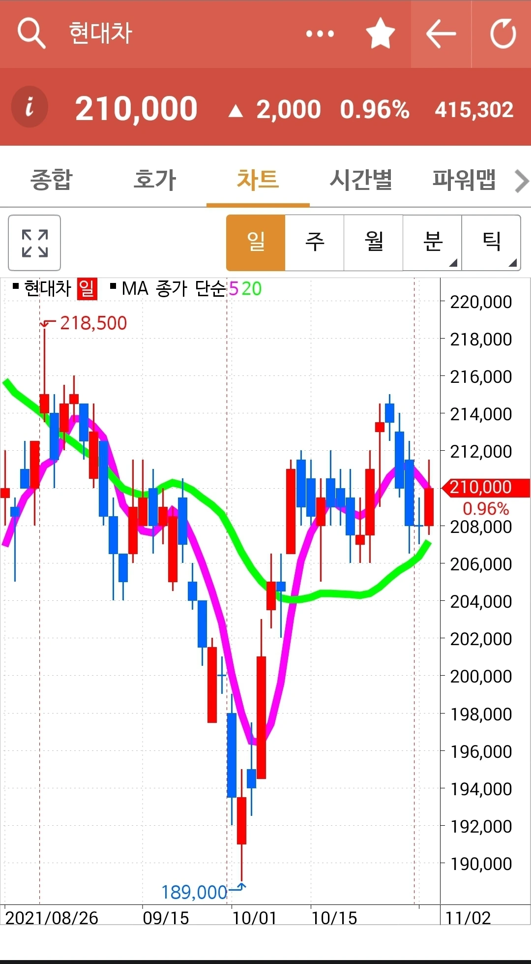 역시 20일선에 꽝 부딪고는 올라오는구나. 파이팅! 아직 살아있네~