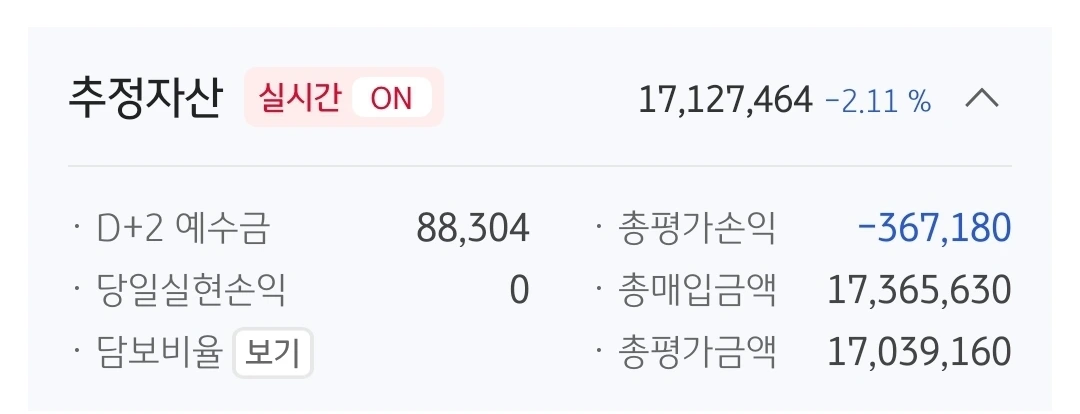 사진 1. 추정자산. 1712만 원. 288만 원 손실 중.