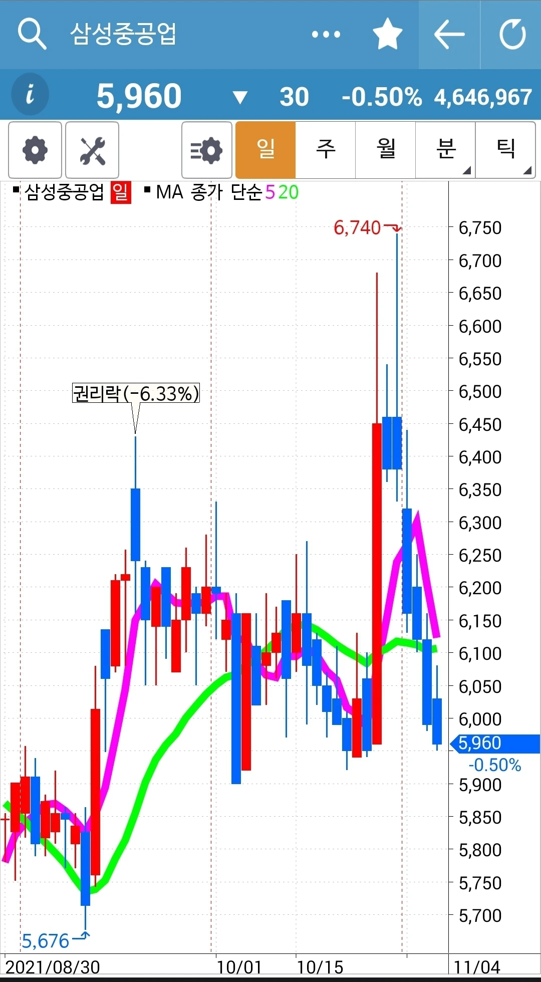 조만간 5일선이 20일선 뚫고 내려오게 생겼다. 아직은 아니라 그냥 있었다. 에휴.