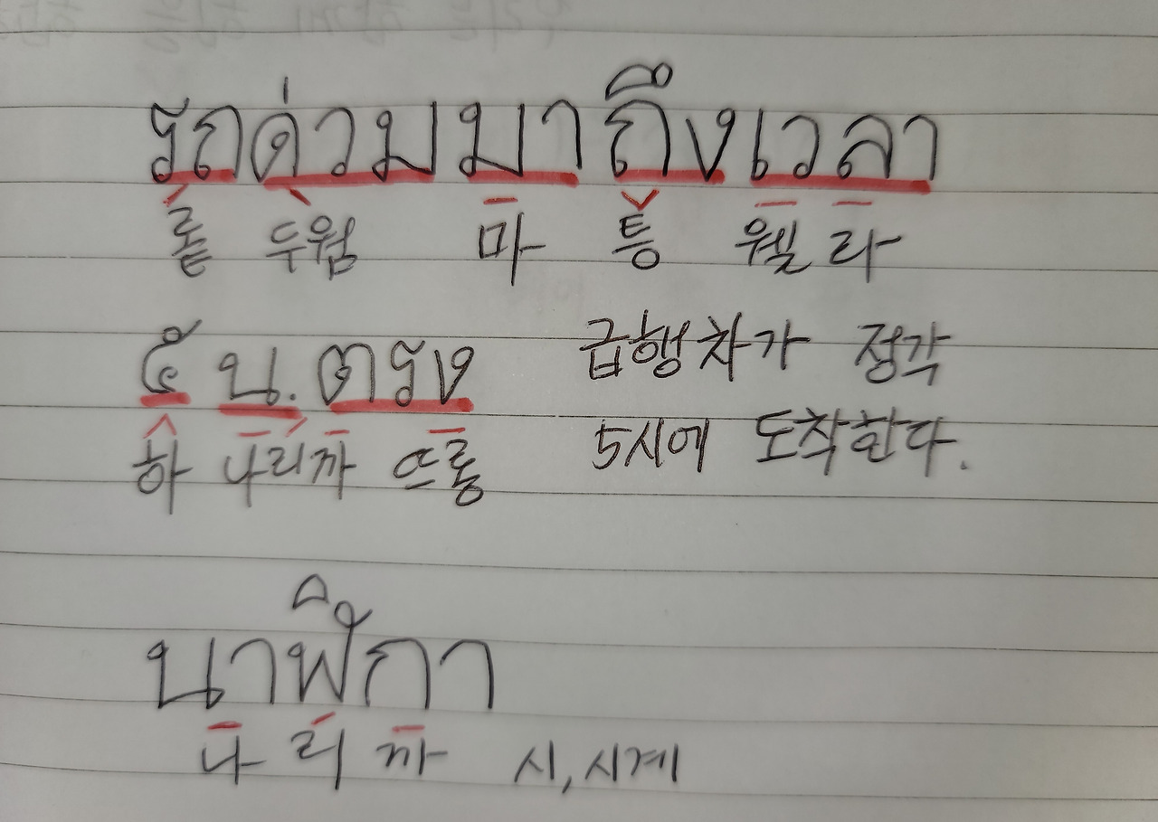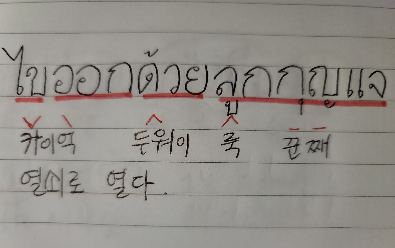 가장 많이 쓰이는 1. ไป 빠이 가다 2. มา 마 오다 3. ขึ้น 큰 오르다 4. ลง 롱 내리다 5. ไว้ 와이 해두다 6. เสีย 씨야 상하다 잃다 7. ให้ 하이 주다 8. อยู่ 유 존재하다 9. 기타 부동사 ออก 억 나가다 เข้า 카오 들어가다 จบ 쫍 끝나다 ถึง 틍 도착하다 เสร็จ 쎗 끝내다를 차례로 공부한다. 오늘은 그 아홉번째 시간으로 9. 기타 부동사 ออก 억 나가다 เข้า 카오 들어가다 จบ 쫍 끝나다 ถึง 틍 도착하다 เสร็จ 쎋 끝내다를 한다.