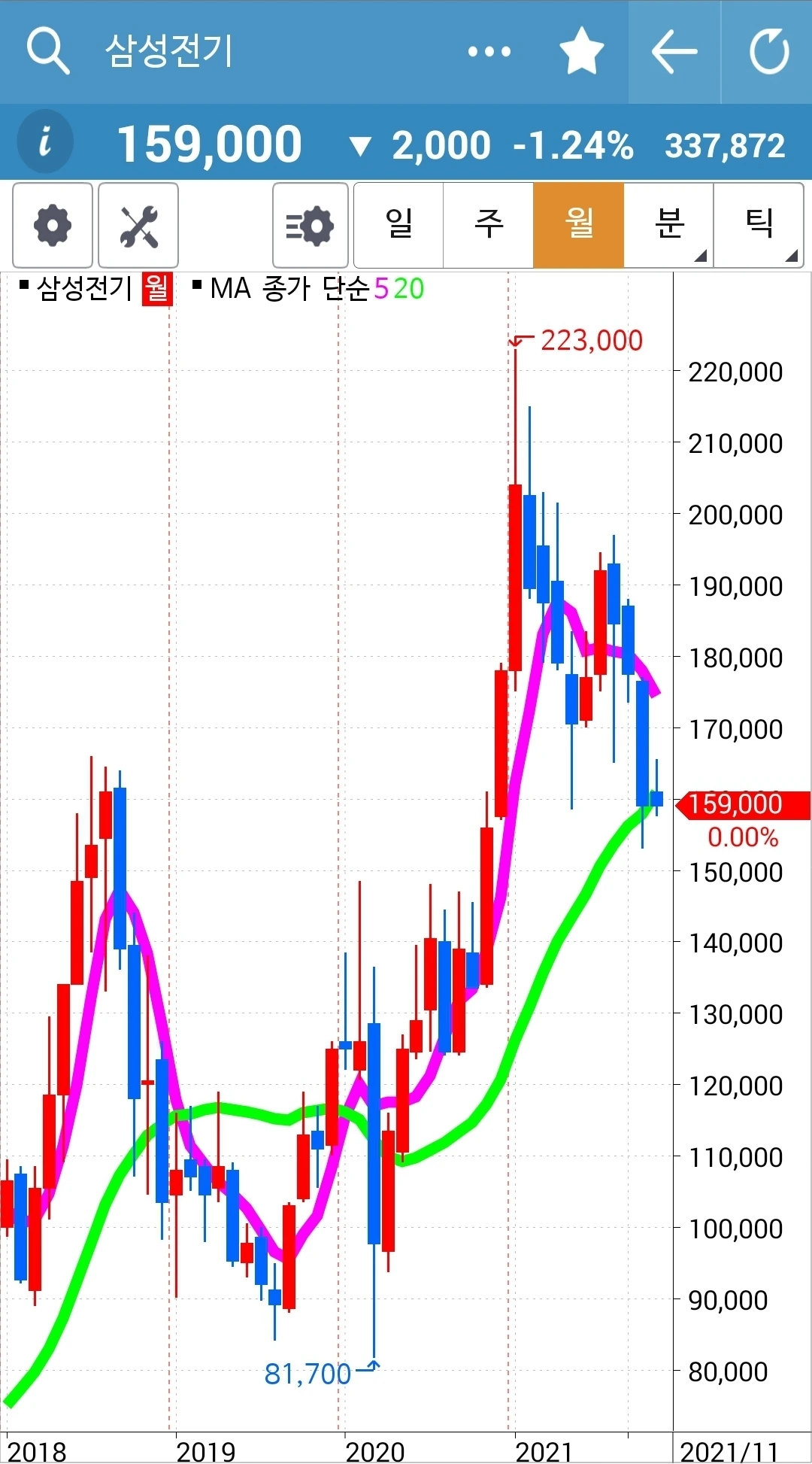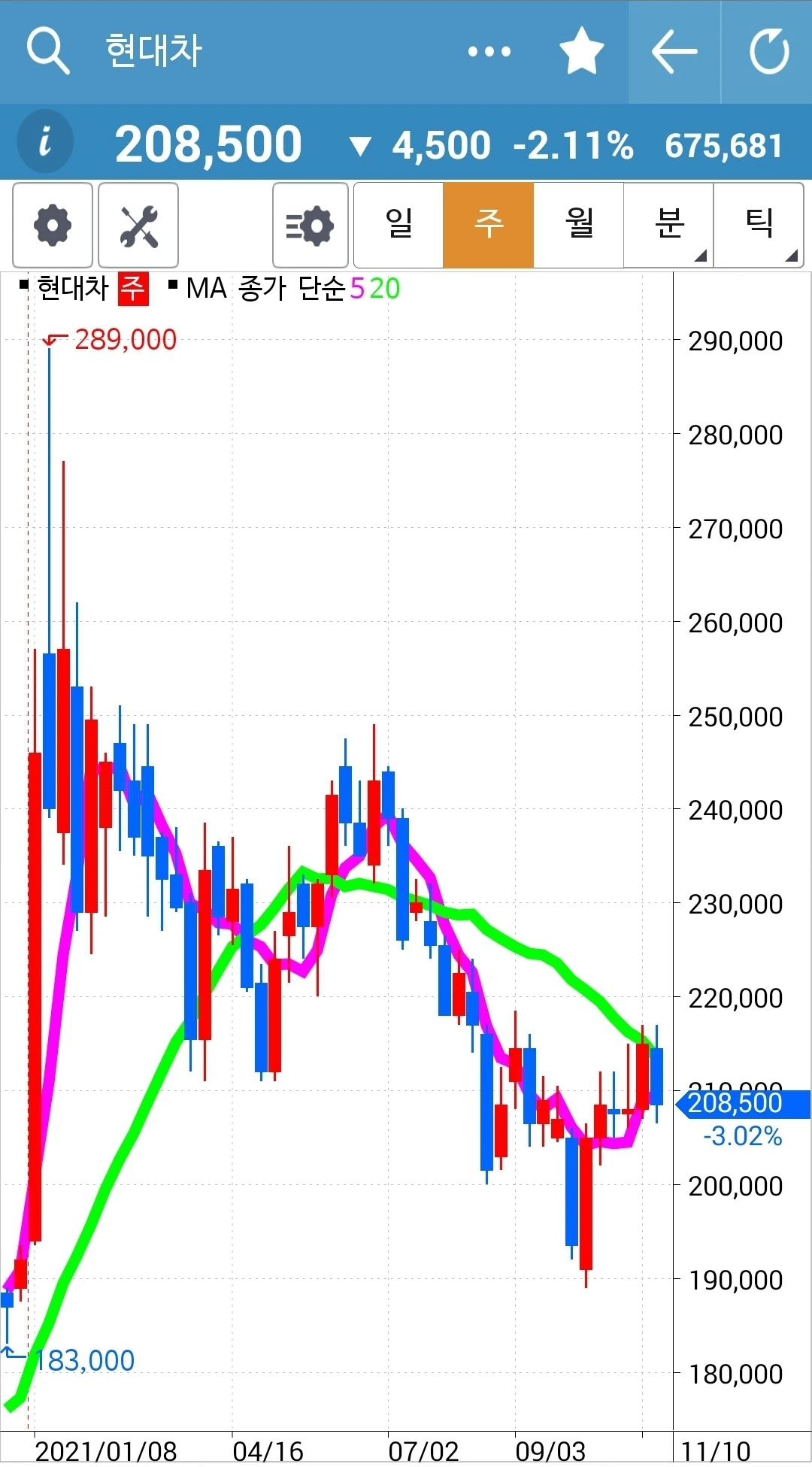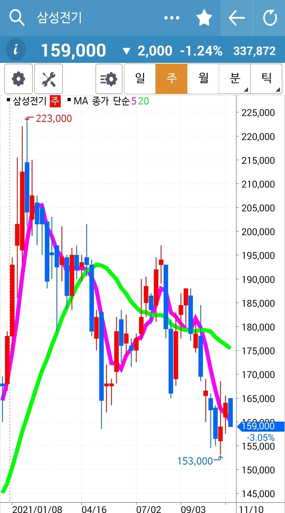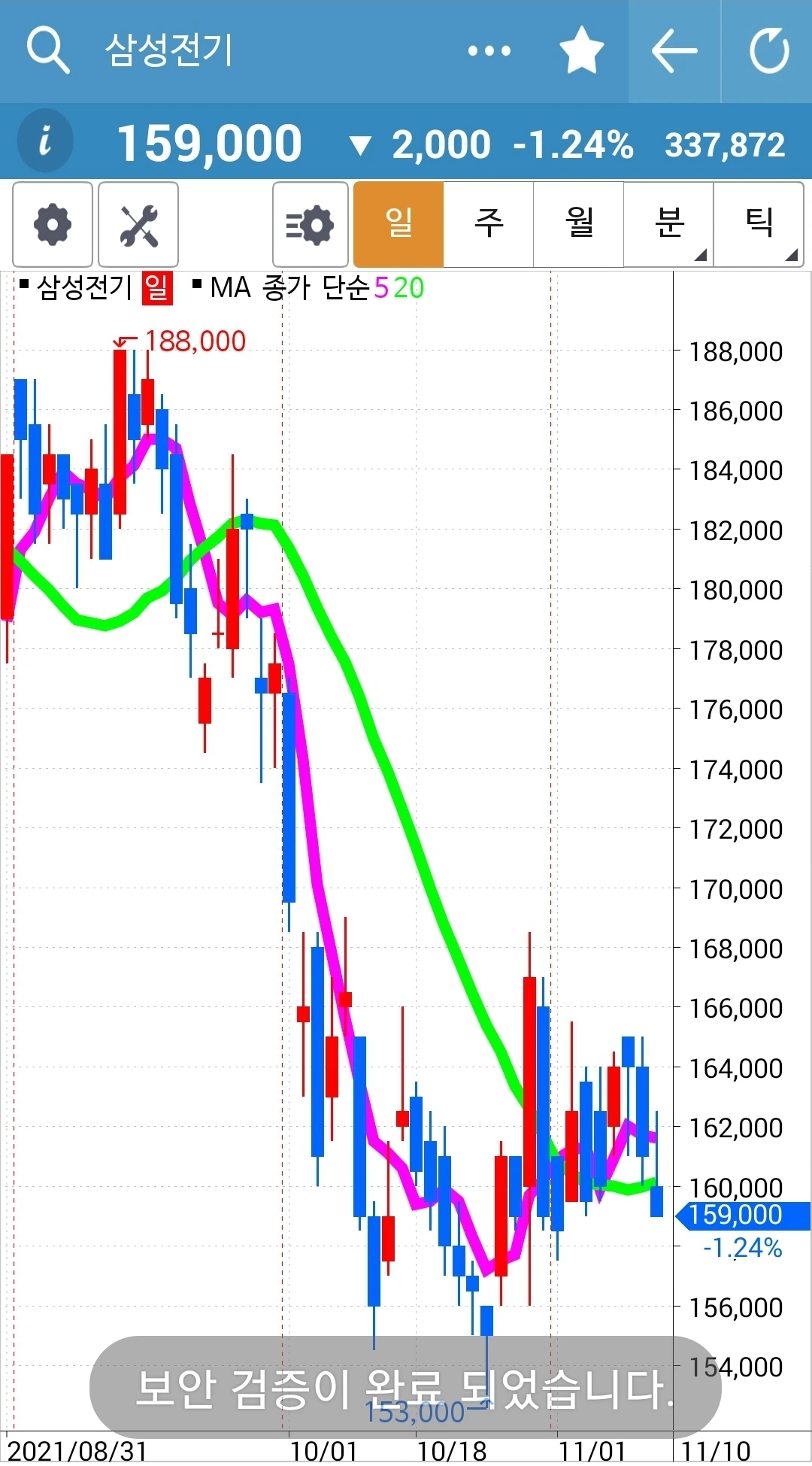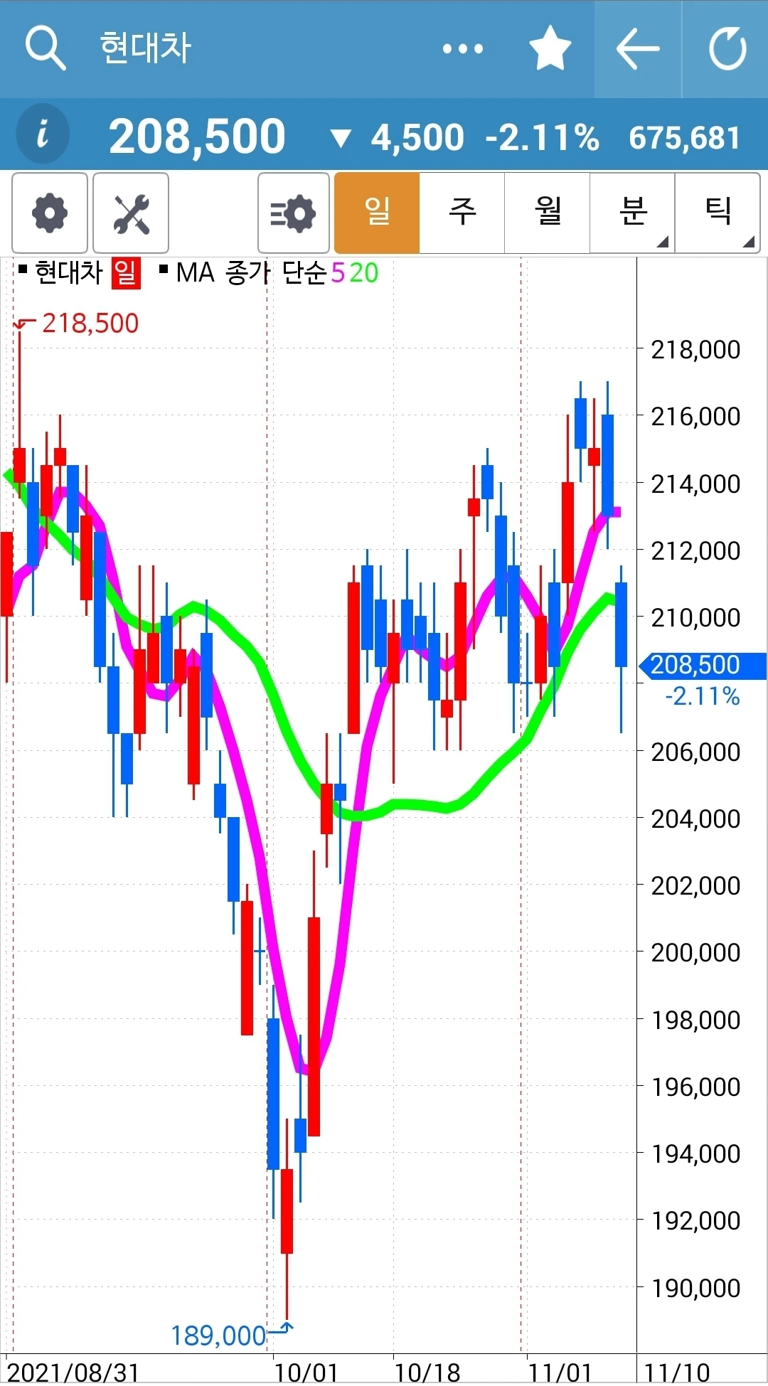 파팍 떨어졌다. 큰일이다. 그래도 5일선이 20일선 위에 있으므로 그대로 매수 유지다. 난 요것 밖에는 할 줄 아는 게 없으니까. '난 아무것도 몰라요~ 5일선이 20일선 아래로 내려가면 매도할 뿐야요~'