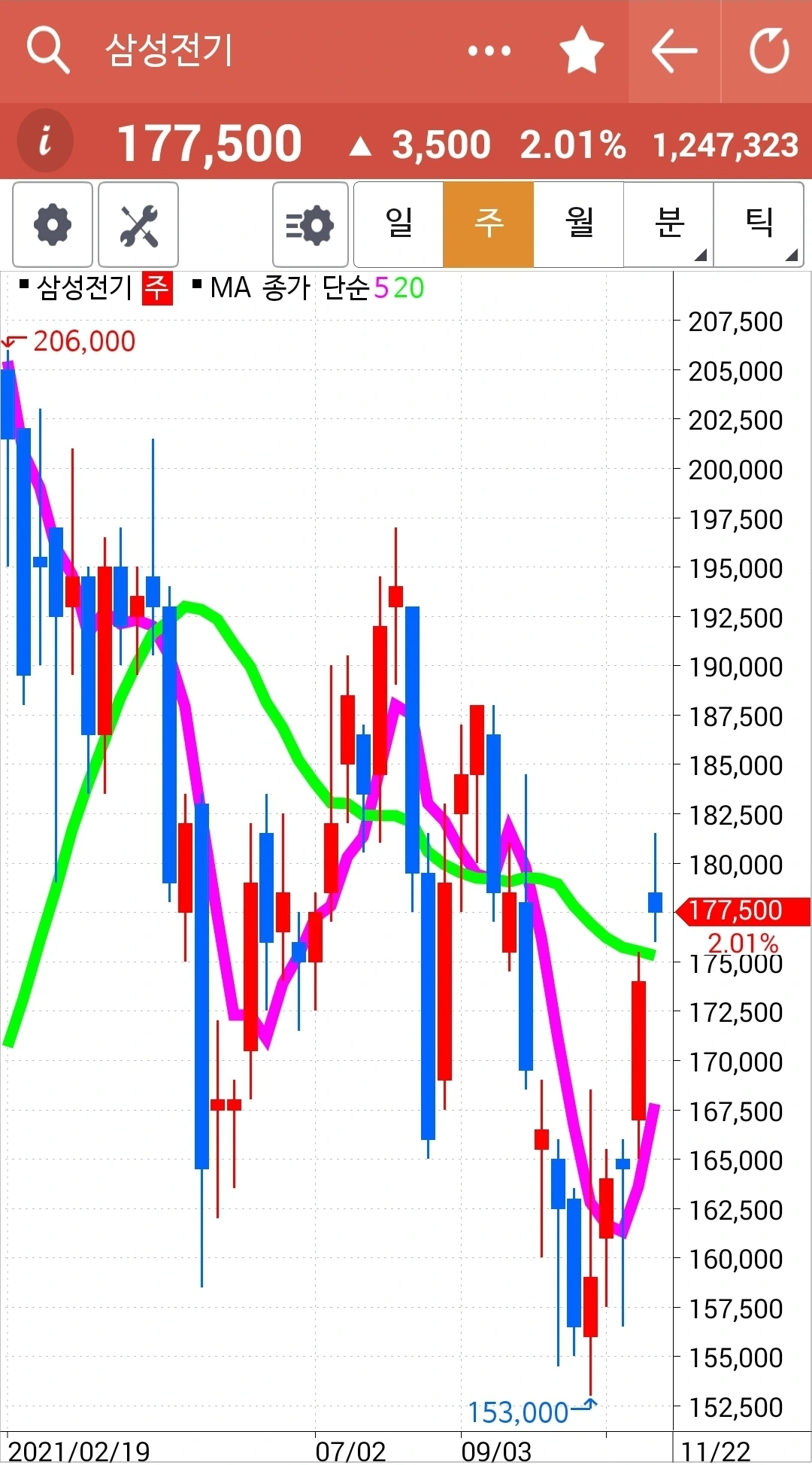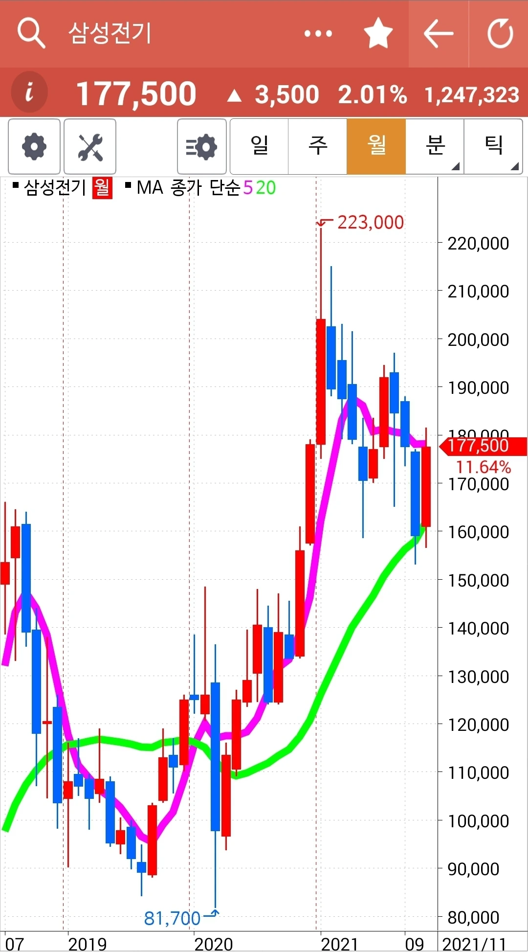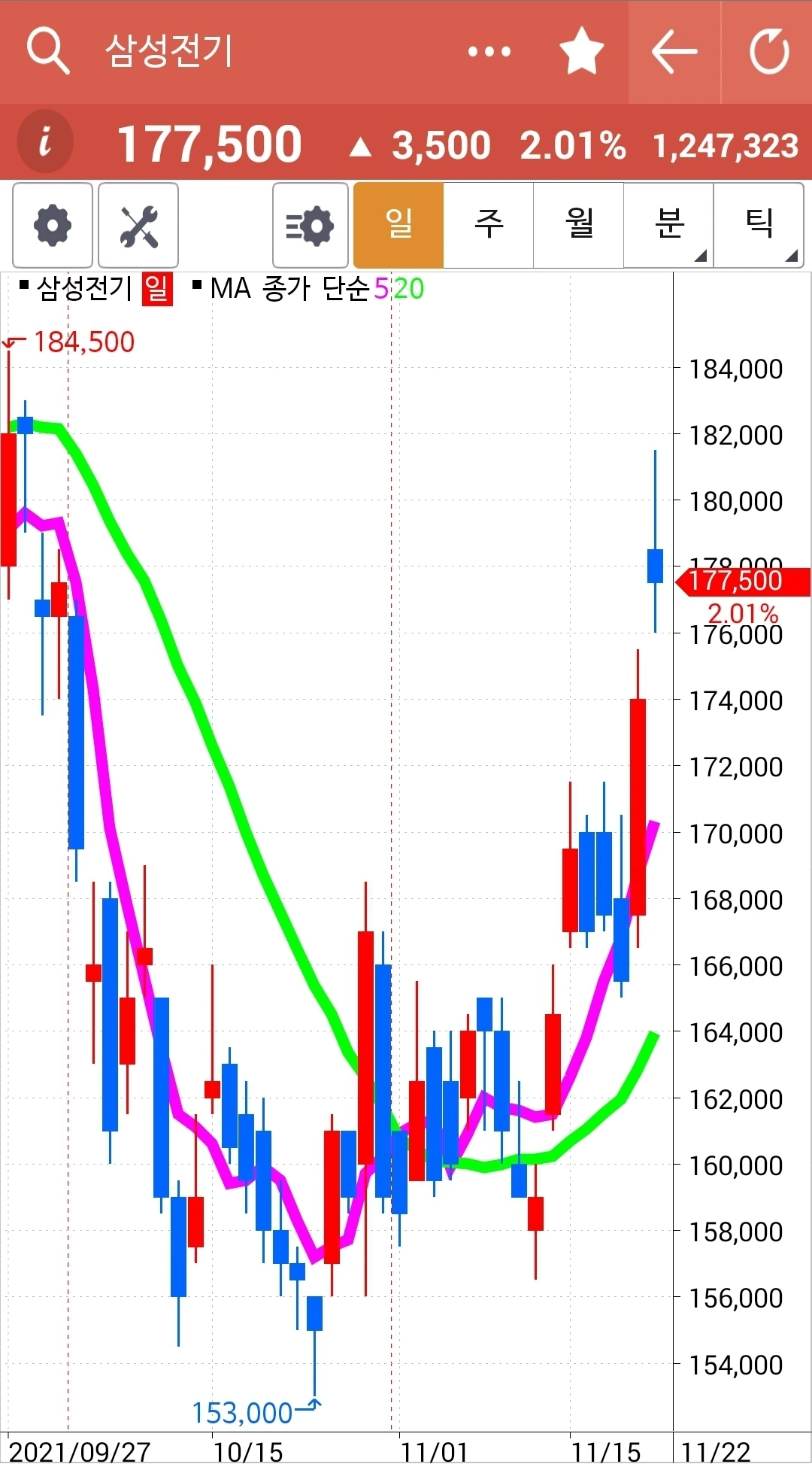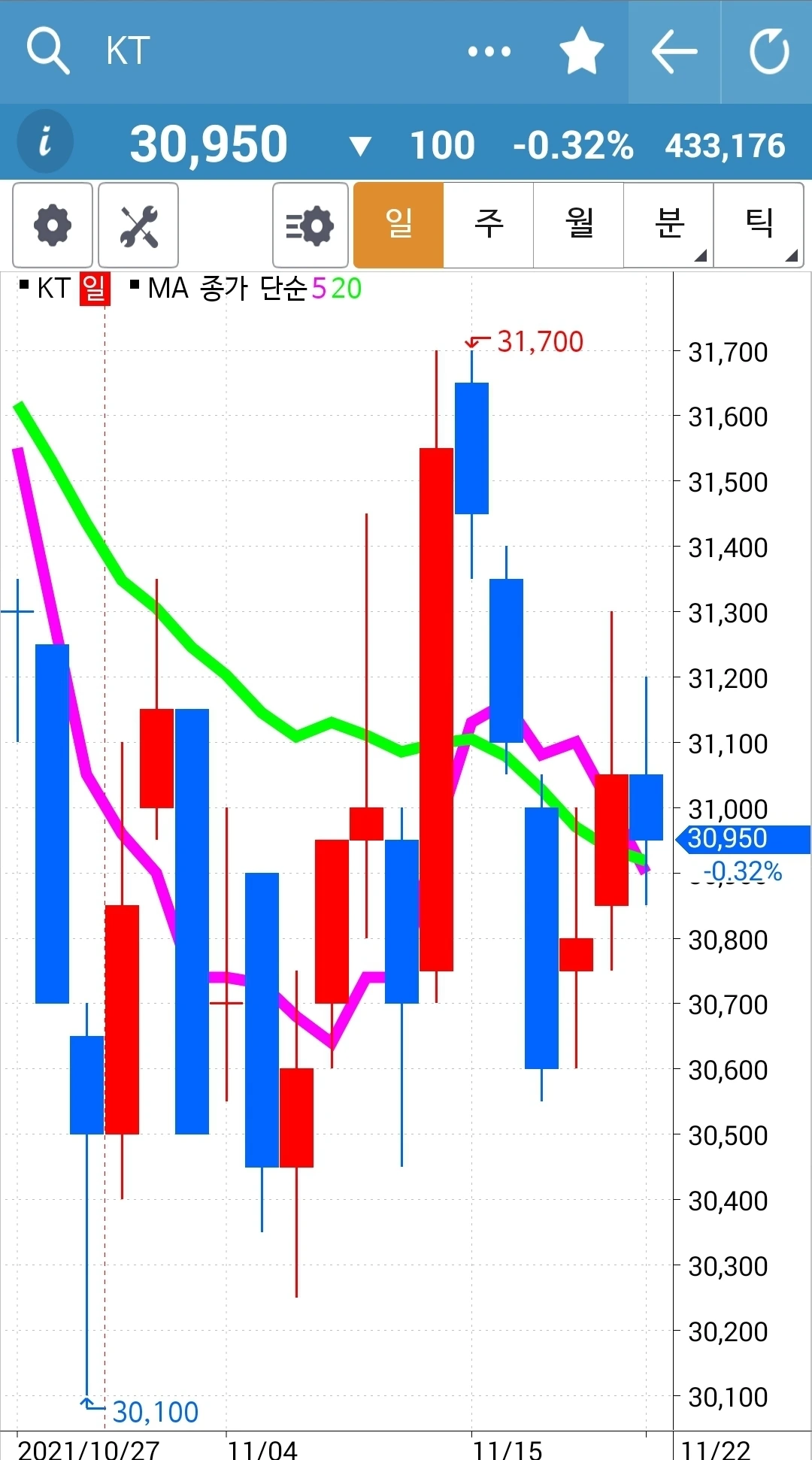 사진 1. KT의 5일선이 20일선 이탈한 모습.