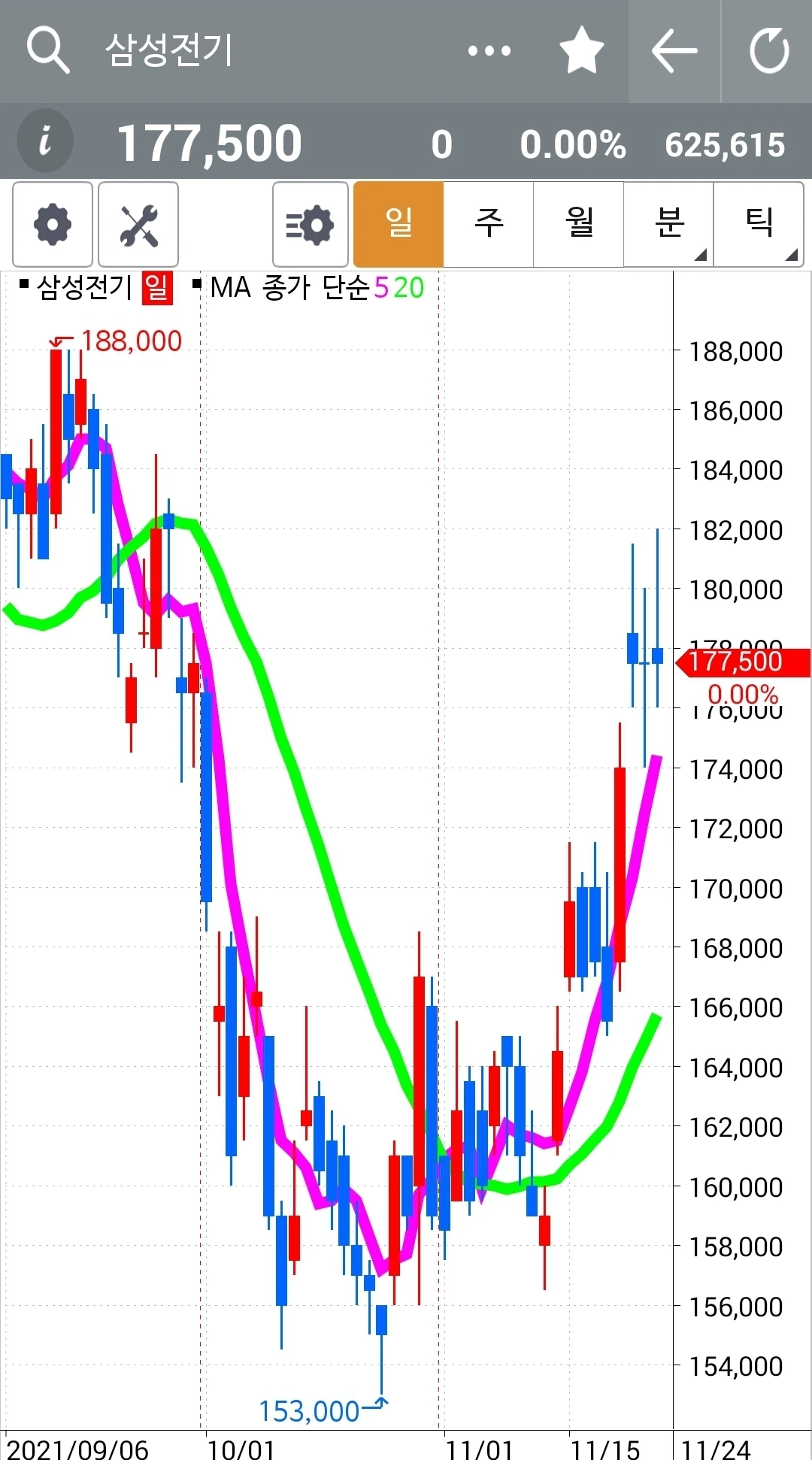 5일선이 20일선 위에 있으니 내가 걱정할 것도 매매할 것도 없다. 파이팅! 하하