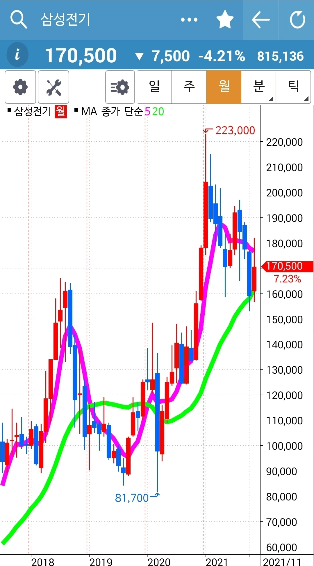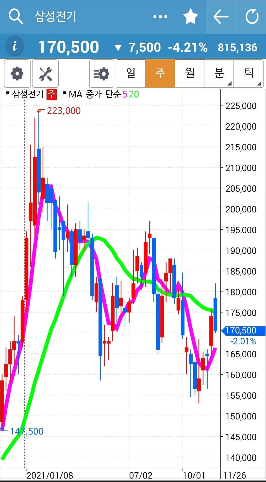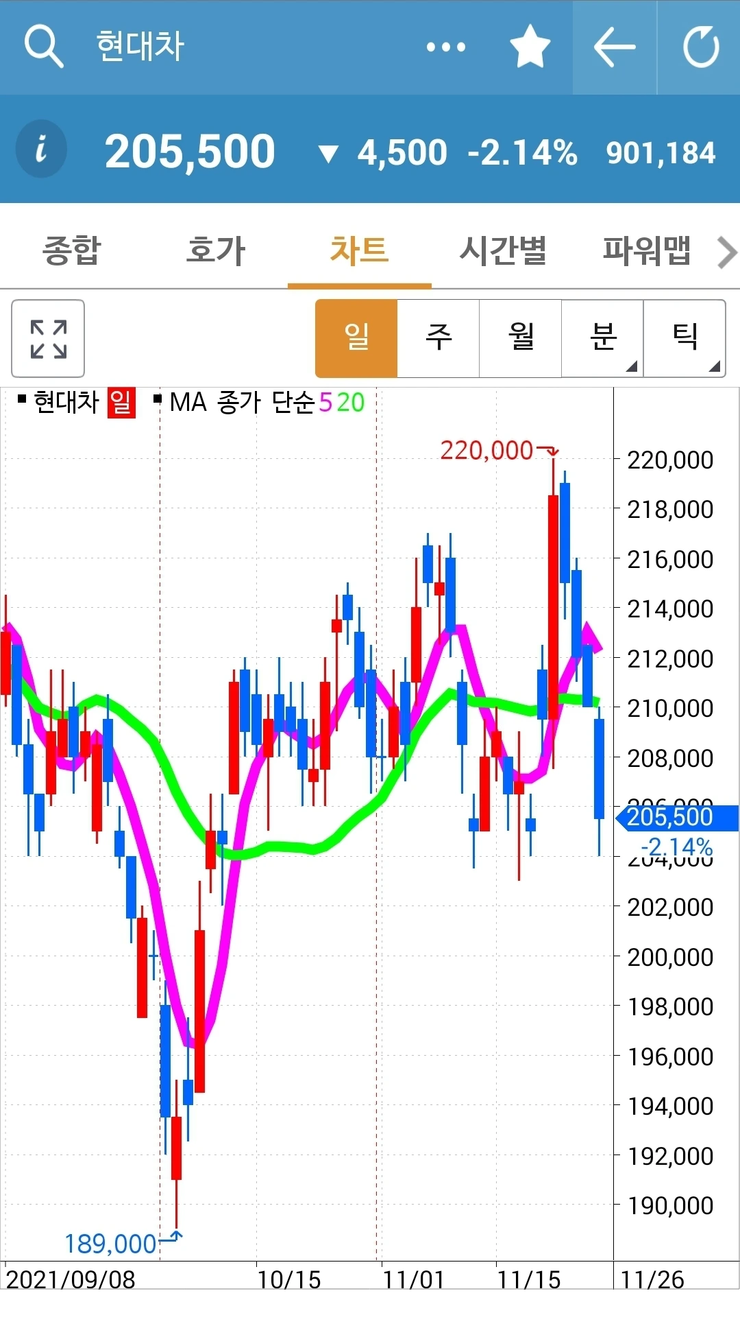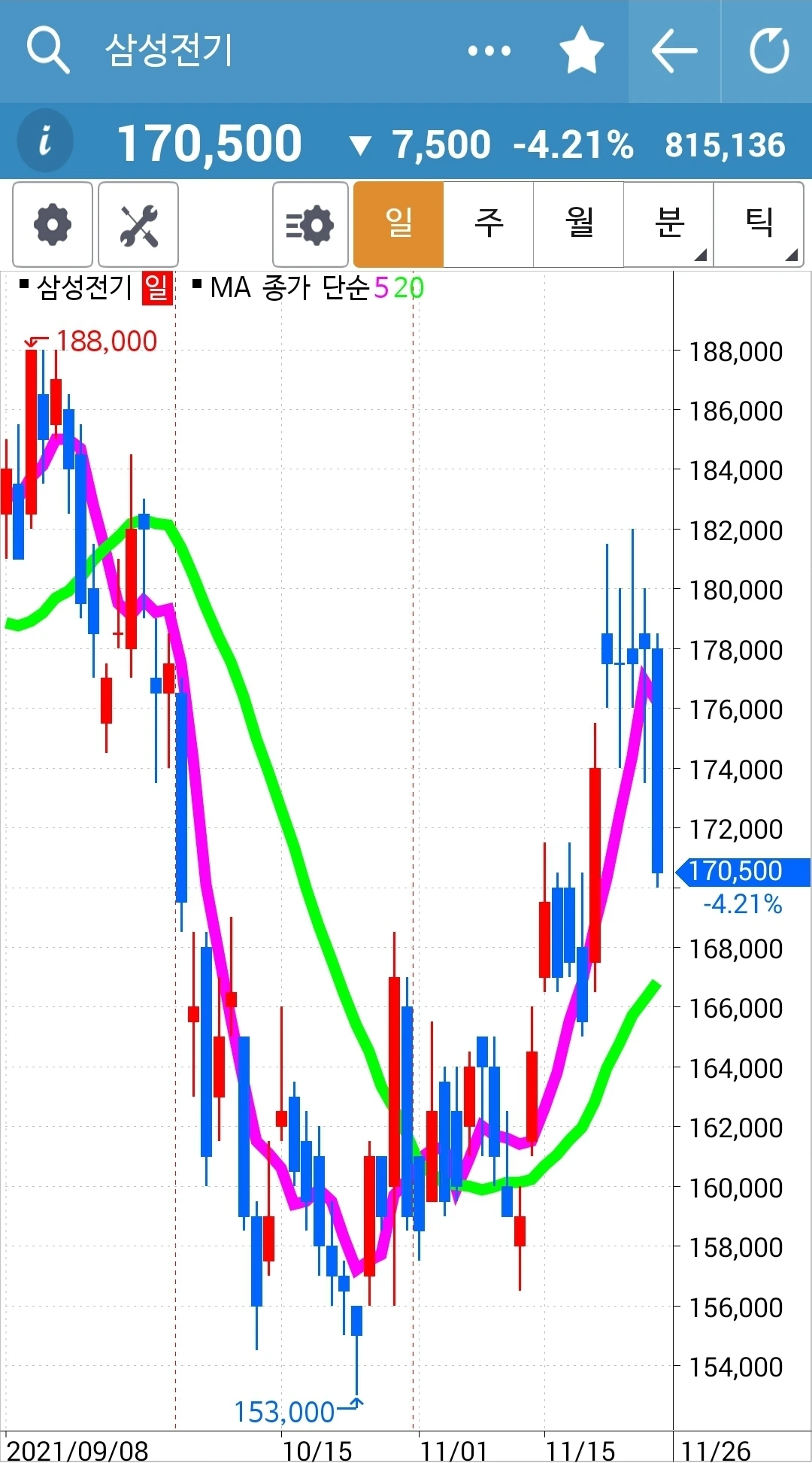 아. 이렇게 무지막지 떨어지다니. 그러나 아직 5일선이 20일선 위에 있어서 아무 행동 안 했다.