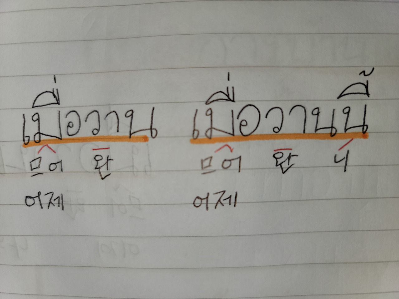 어제(เมื่อวาน 므어완),
