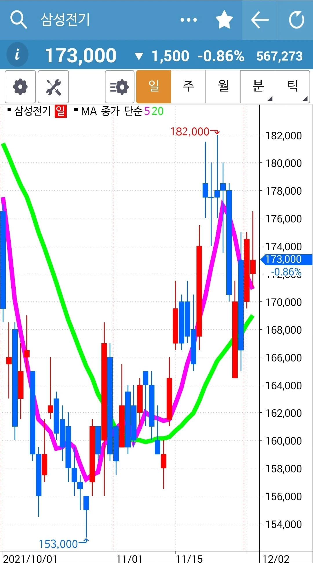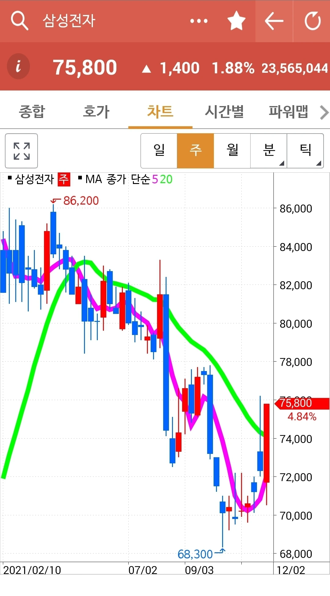 잘 올라가다가 왜 밀렸을까? 주봉의 20 주선 저항에 걸린 것일까. 어쨌든 아직 5일선이 20일선 위를 지키고 있으므로 매수 유지다. 난 요것만 할 줄 아니까. '난 아무것도 몰라요~ 5일선이 20일선 아래로 내려가면 매도할 뿐야요~' 오늘도 새 하루가 밝아온다. 요놈을 어떻게 멋지게 요리할까? 푸하하하 힘차게 씩씩하게 앞으로 앞으로~