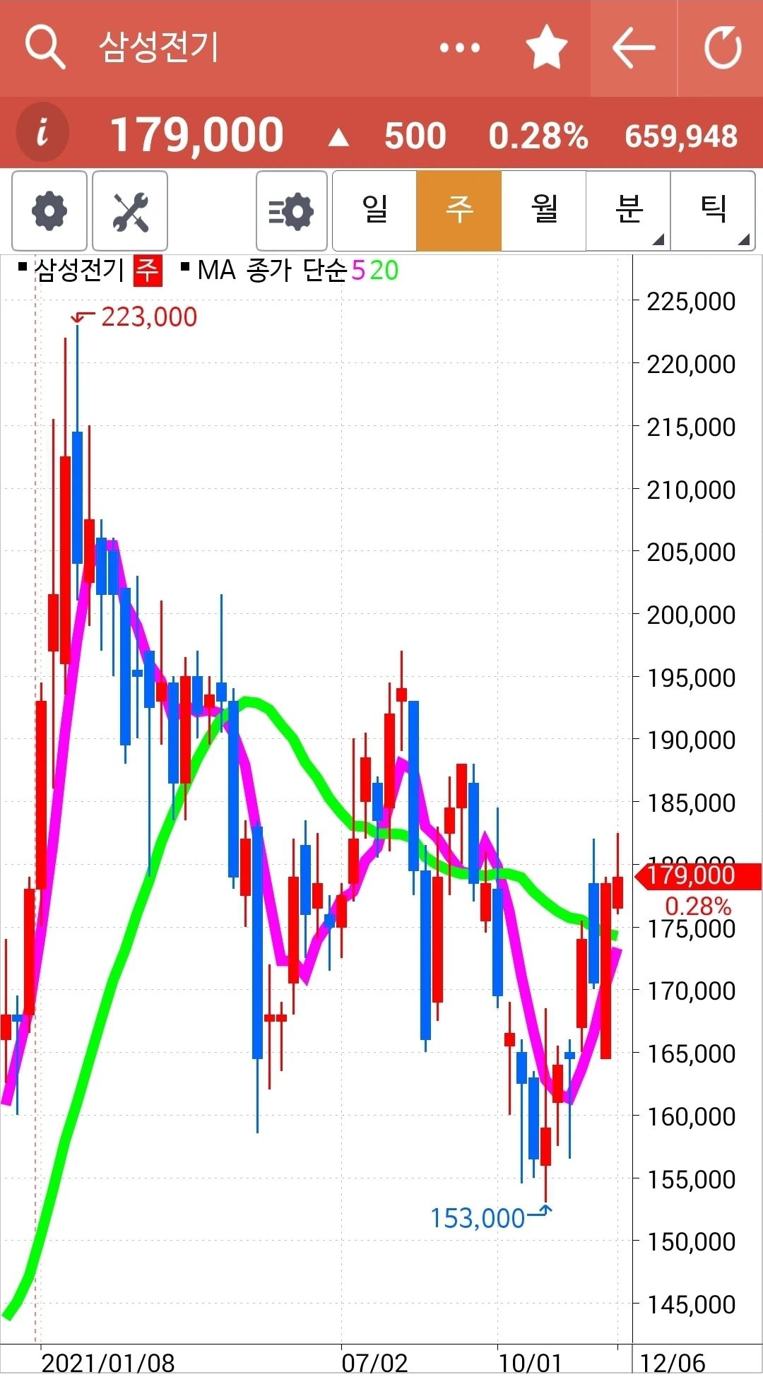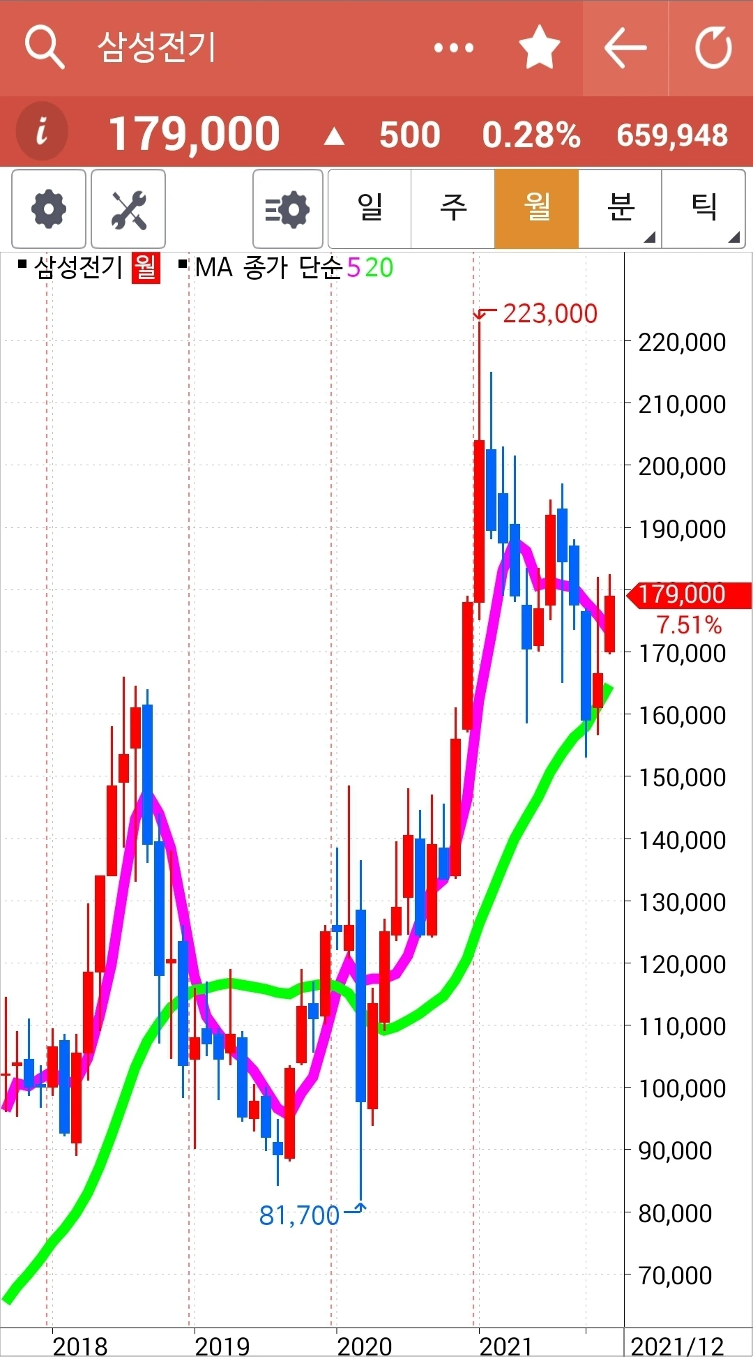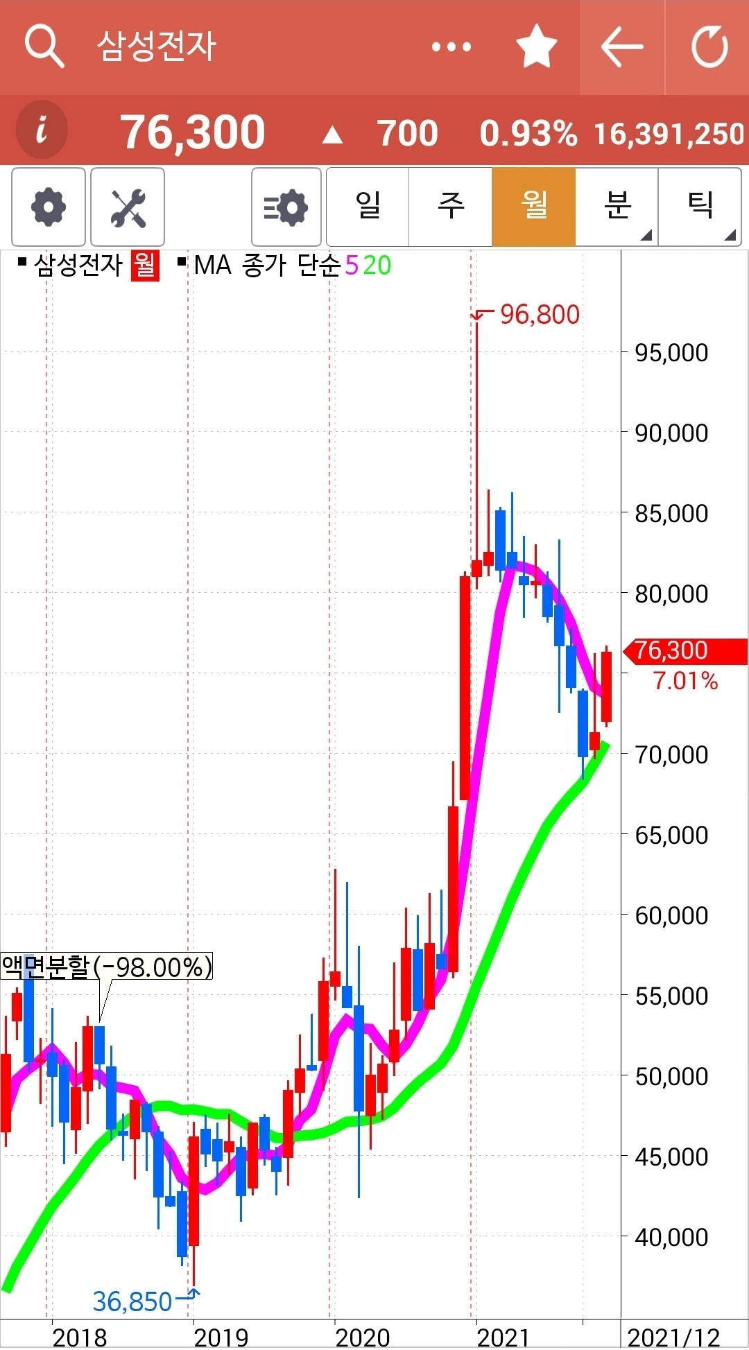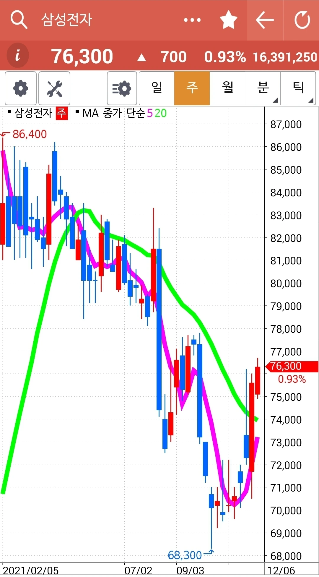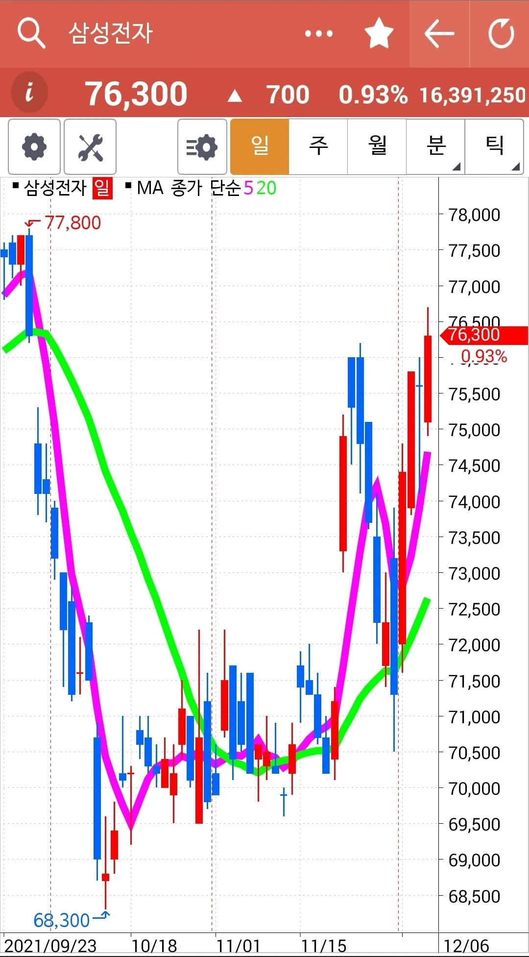 오홋 가볍게 전고점을 뚫고 고우 고우. 전고점 77,800원을 향하여 더욱 씩씩하게 앞으로 앞으로. 푸하하하 파이팅! 내가 할 줄 아는 건 딱 요거 하나. '난 아무것도 몰라요~ 5일선이 20일선 아래로 내려오면 매도할 뿐야요~'