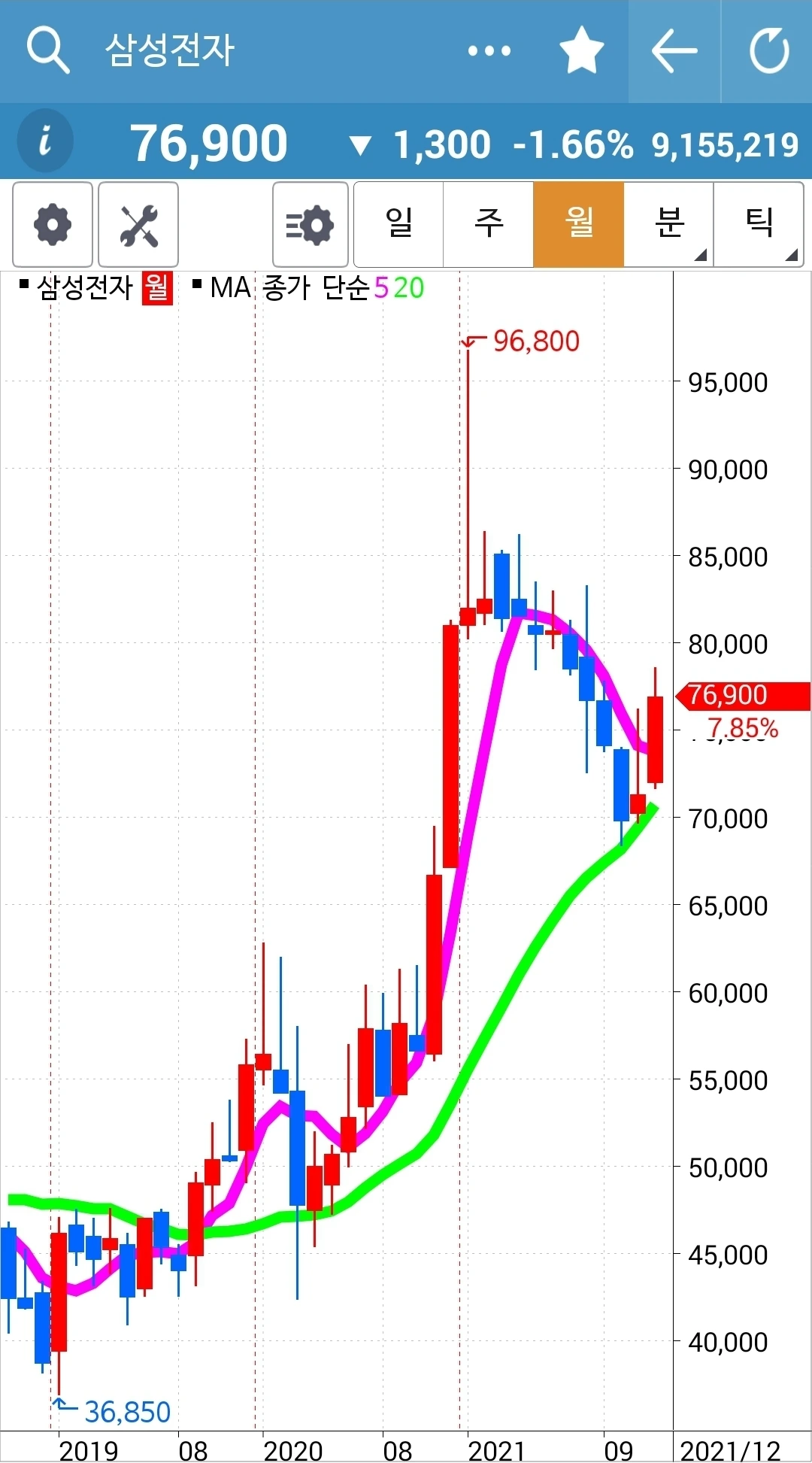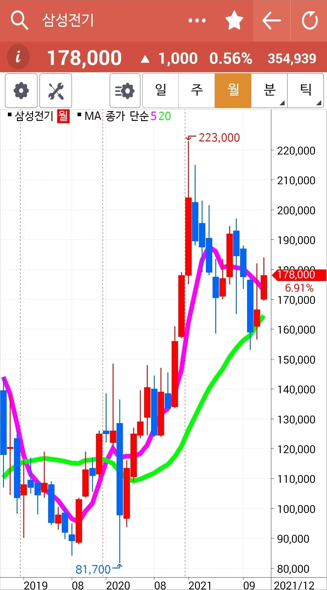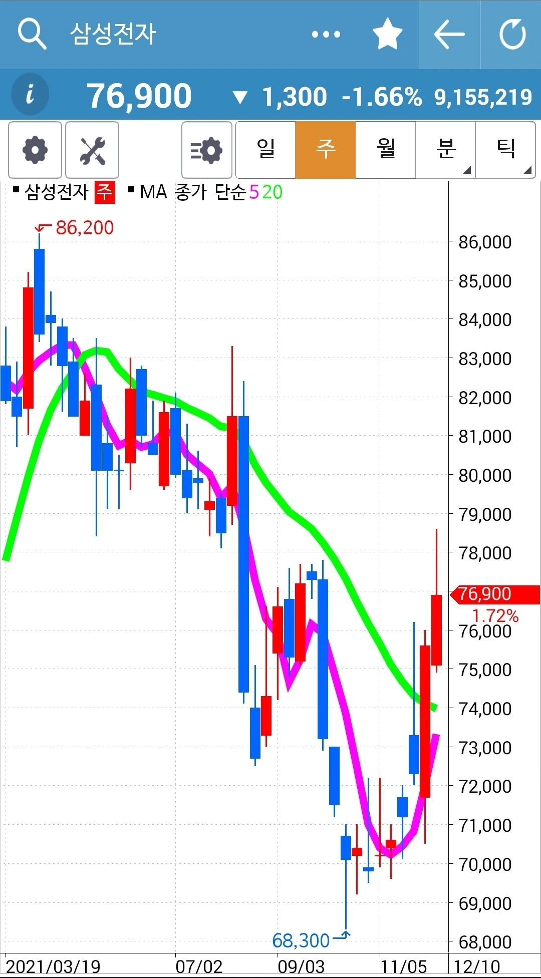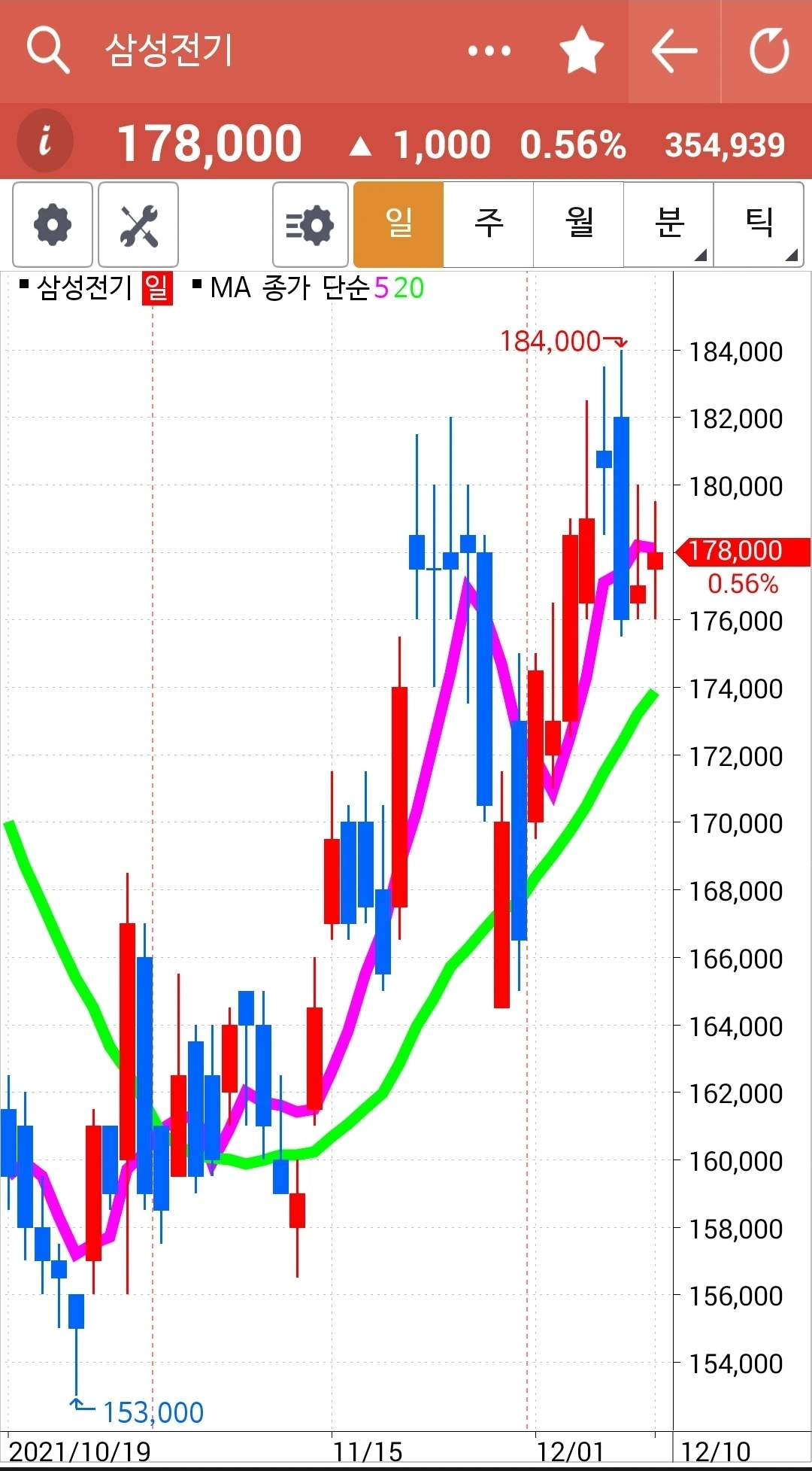 전일 저점을 다 뚫고 내려가는 음봉이 나왔지만 5일선이 20일선 위에 있으므로 매수 유지다.
