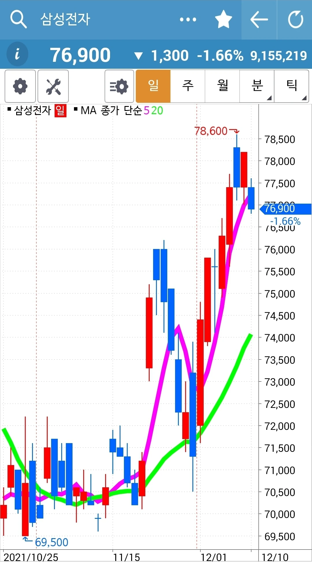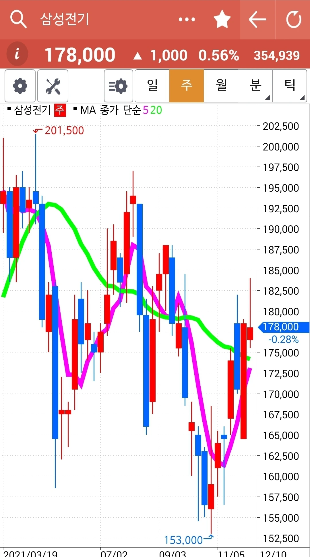 전일 고점을 뚫지는 못했지만 양봉이니 기분이 좋다. 여하튼 이것 역시 5일선이 20일선 위에 있으므로 매수 유지다. 다시 한번 지극히 단순한 나의 원칙을 외치며 오늘 새 하루를 시작한다. 파이팅! '난 아무것도 몰라요~ 5일선이 20일선 아래로 내려가면 매도할 뿐야요~'