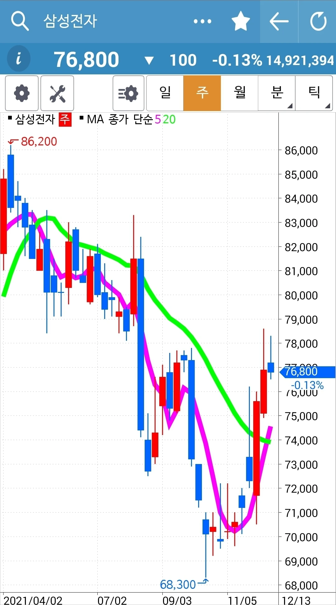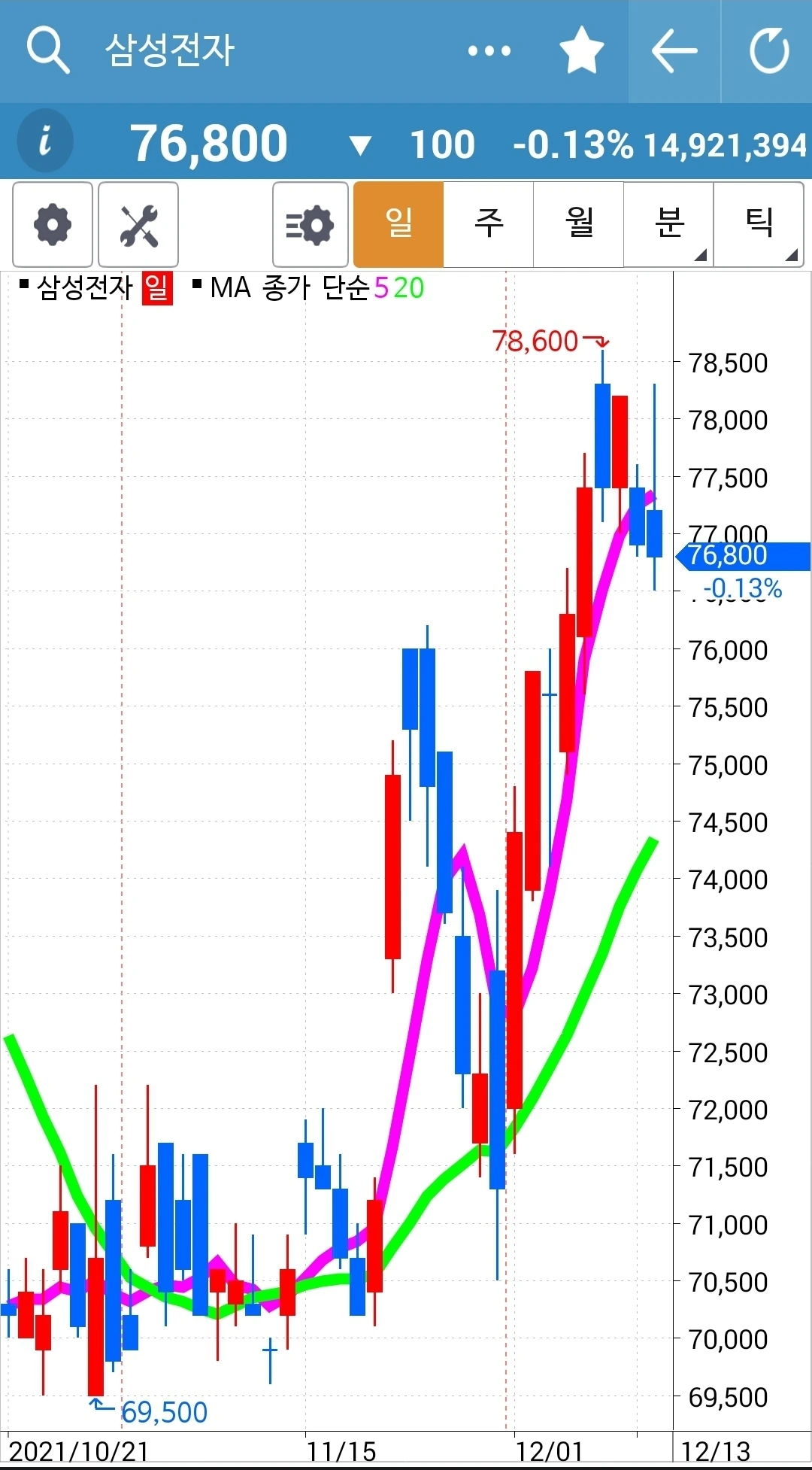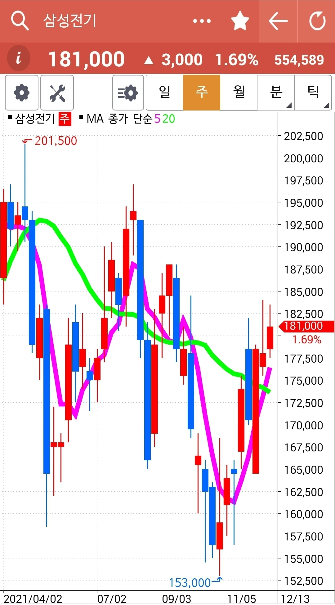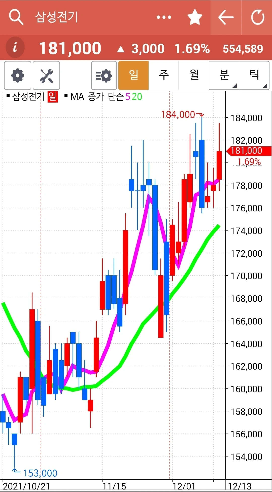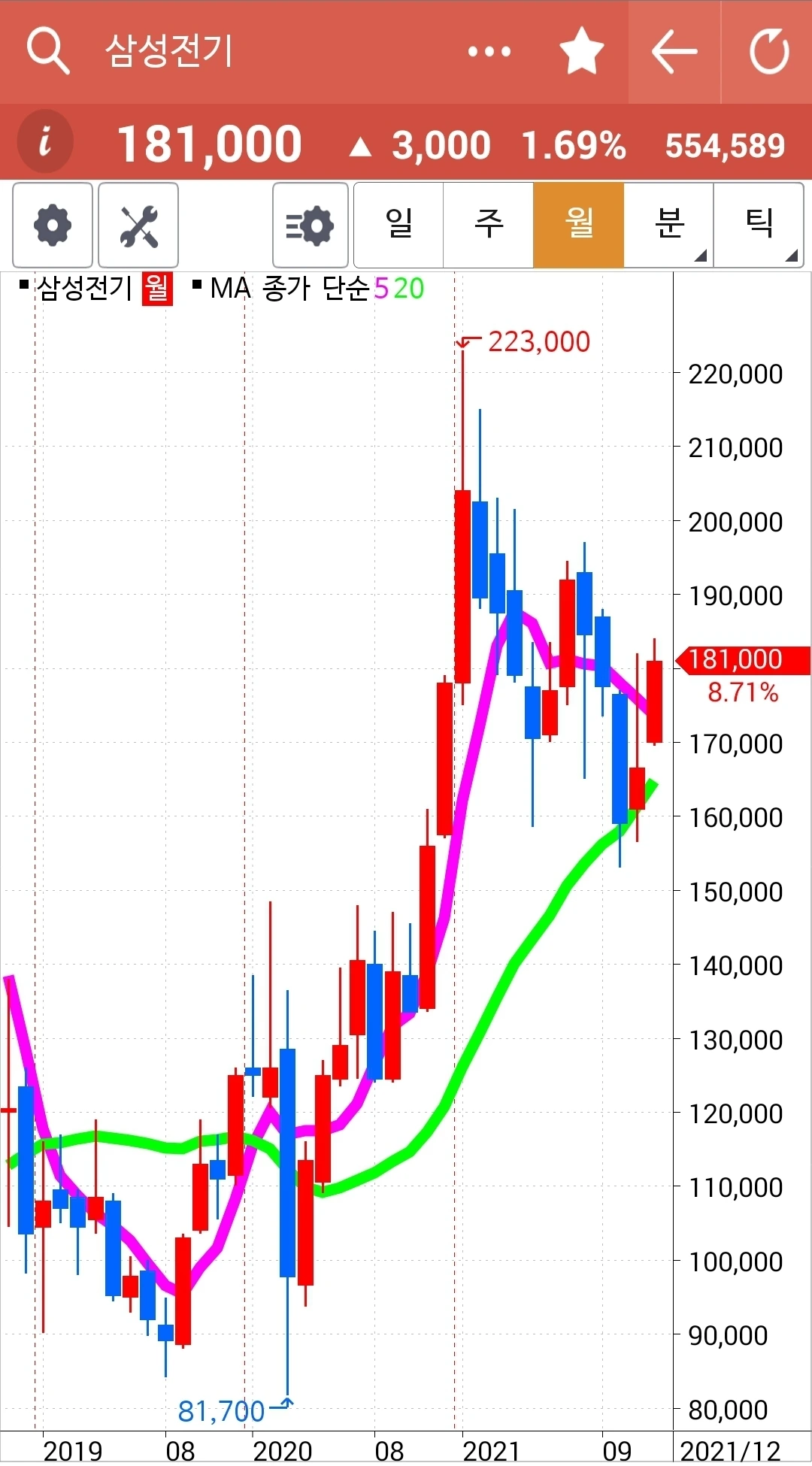 전일 고점 저점을 다 건드리며 음봉. 20일선을 향해 내려가겠다는 신호일까. 오늘이 궁금하다. 그러나 주봉도 5 주선이 20 주선 위로 고개를 빠꼼히 내밀고 있고 월봉 또한 20개월 선에 부딪고 깡총 위로 뛰어오르는 모습이니 걱정일랑 노노노! 내가 할 수 있는 건 요거 하나. '난 아무것도 몰라요~ 5일선이 20일선 아래로 내려오면 매도할 뿐야요~'