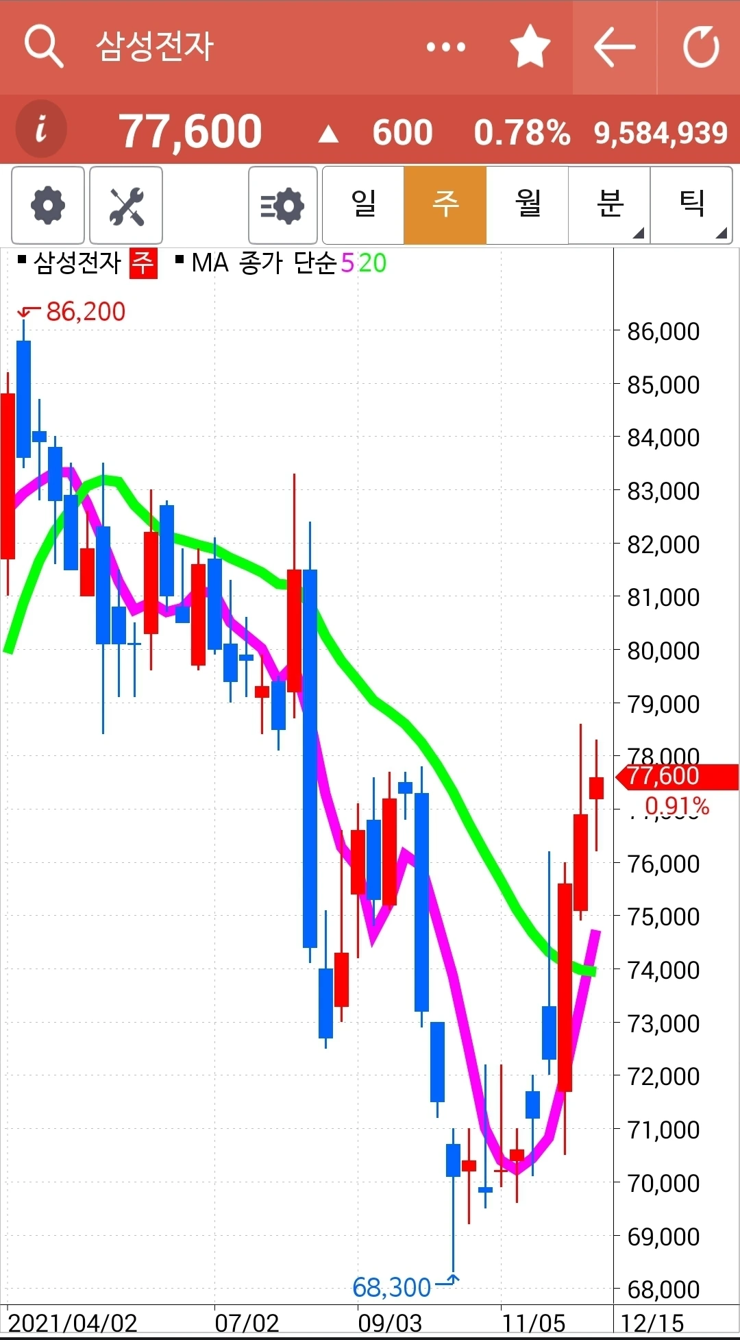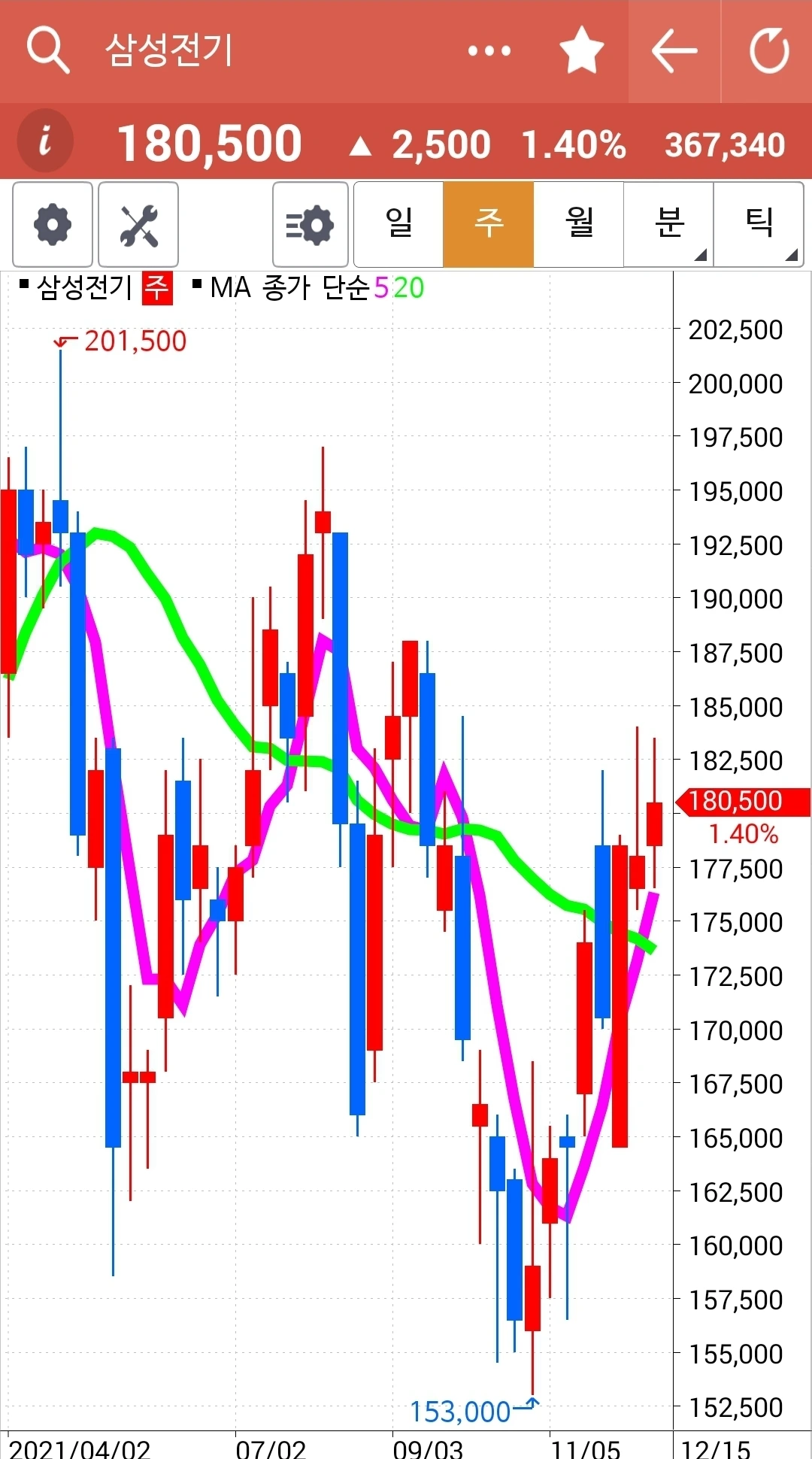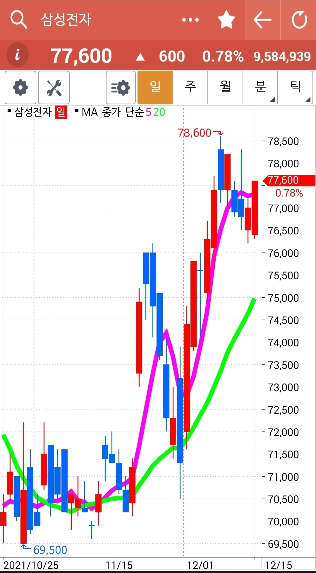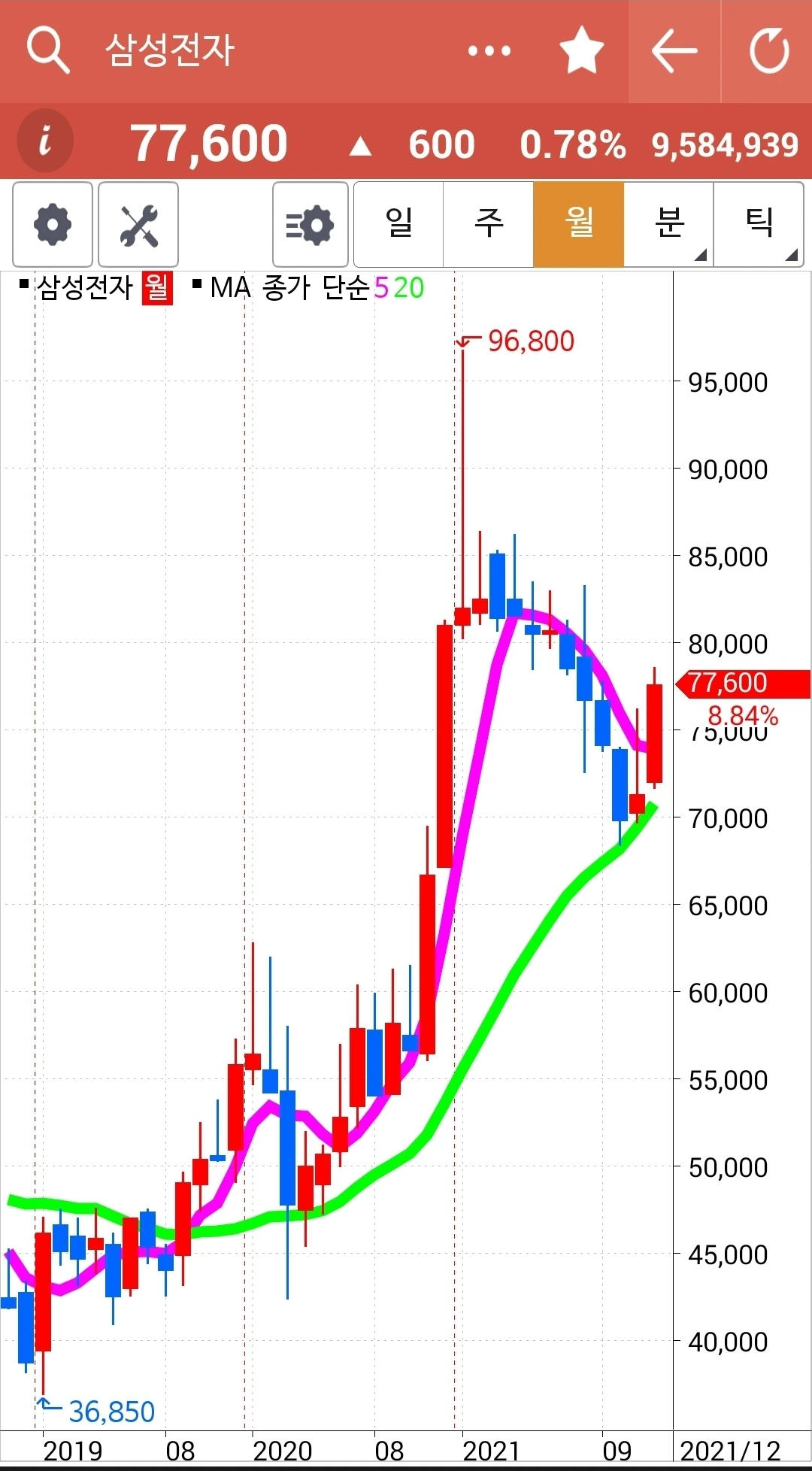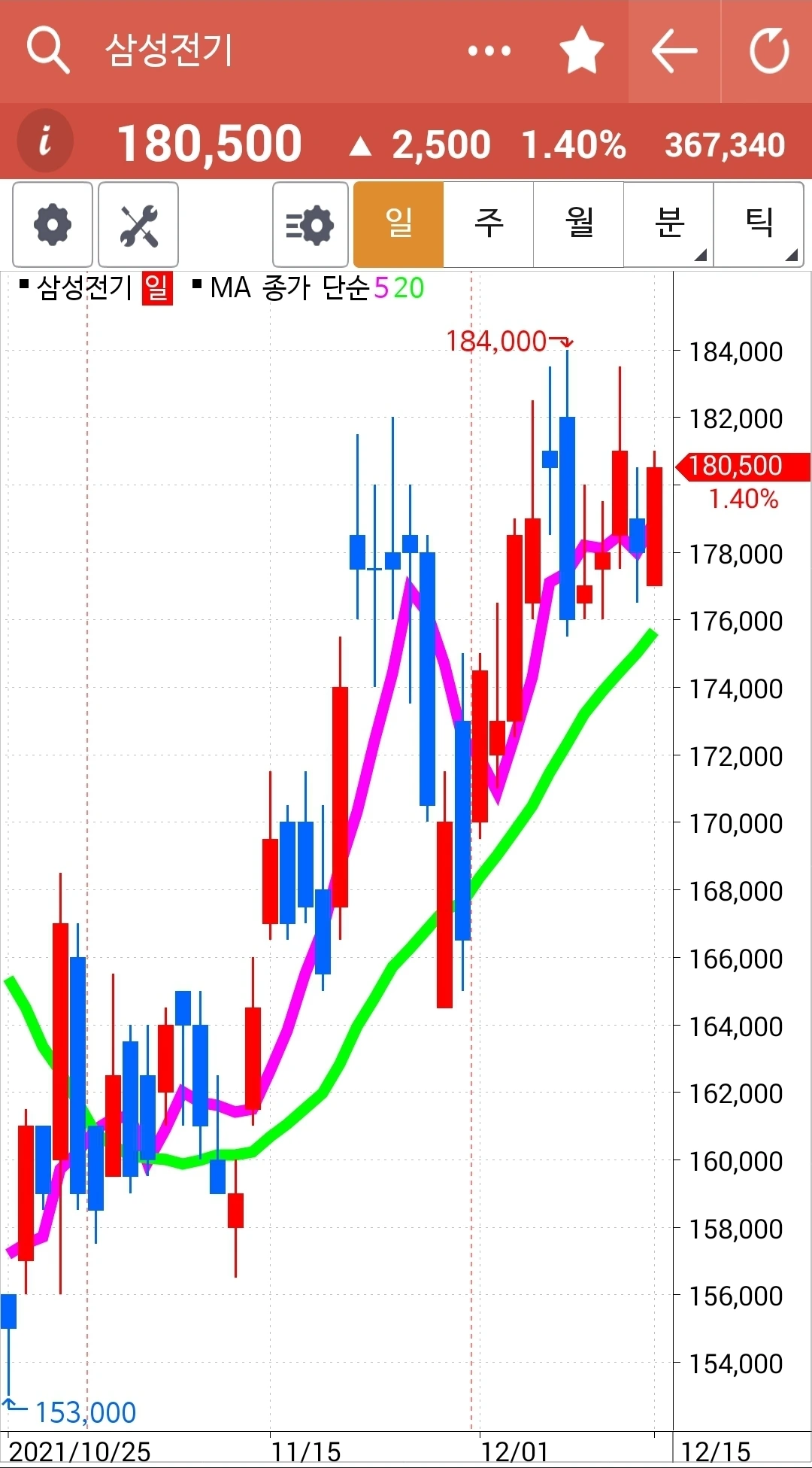 오홋. 요것 역시 전일 고점을 훌쩍 넘기는 긴 양봉. 게다가 주봉 월봉 모두 빨간 선이 초록 선 위에 있다. 다시 한번 나의 원칙을 되뇌는 것으로 오늘을 마감한다. '난 아무것도 몰라요~ 5일선이 20일선 아래로 내려가면 매도할 뿐야요~' 파이팅!
