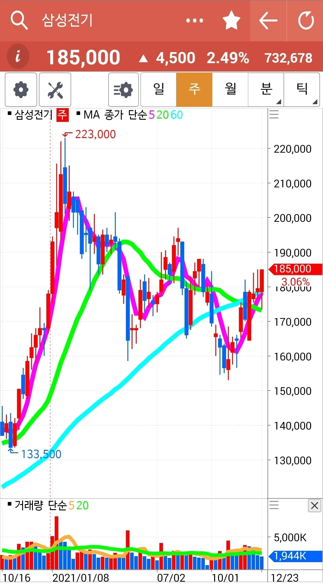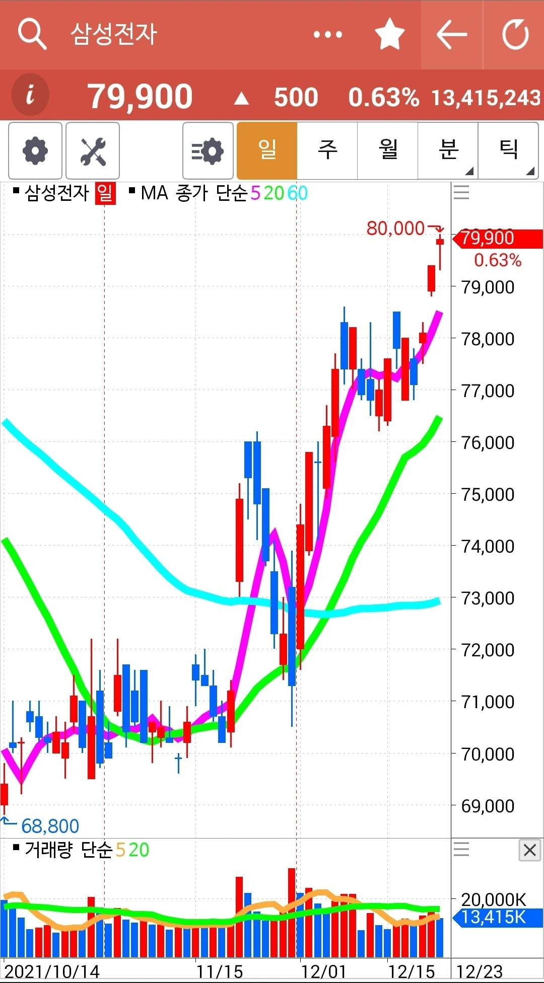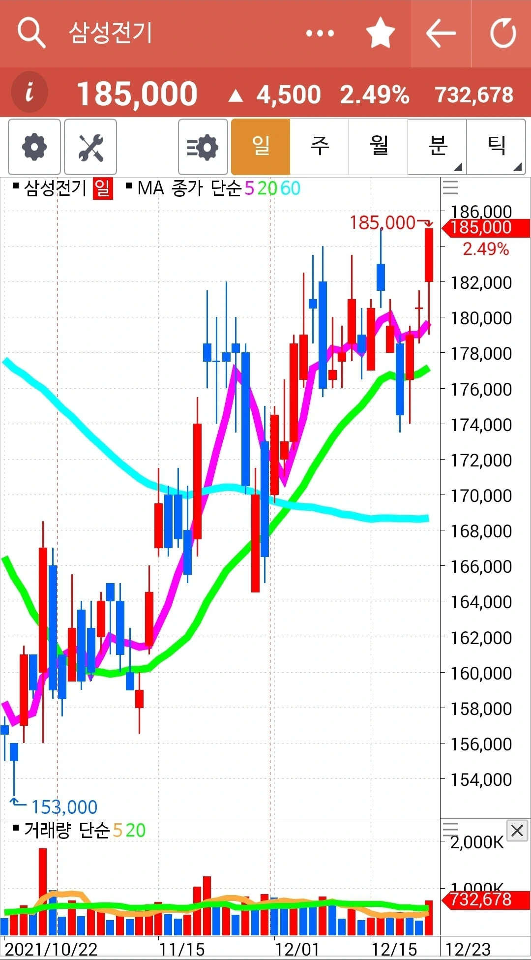 요즘 읽고 있는 책에서 60일선을 중요하게 이야기해 추가했다. 기존의 핑크가 5일선 연두가 20일선 거기 하늘색 60일선을 추가했다. 게다가 난 일봉이면 5일선 주봉이면 5 주선 월봉이면 5개월선 이런 식으로 말했는데 어디서나 5일선이라고 말하면 되는 거였다. 60일선의 우상향이 중요하다는데 여기 차트는 모두 우상향이다. 다행이다.
