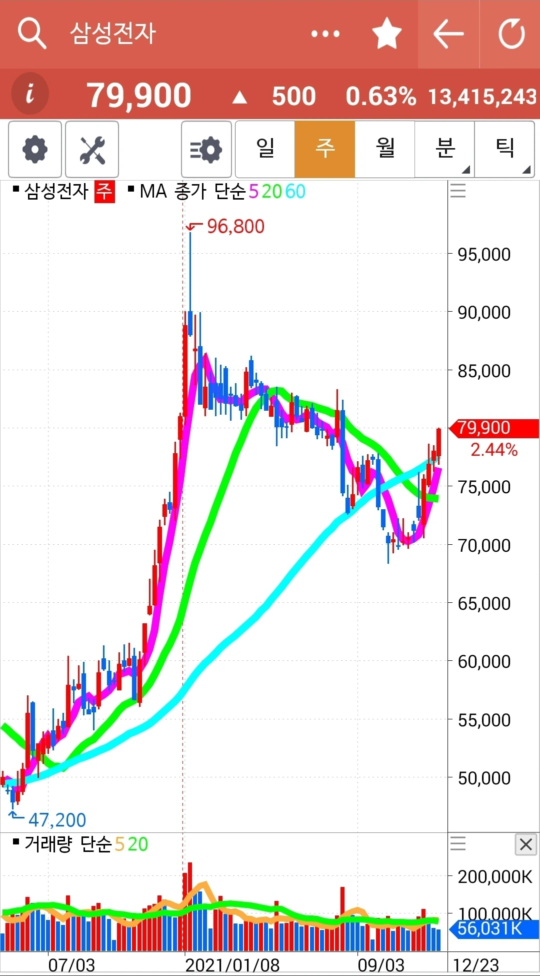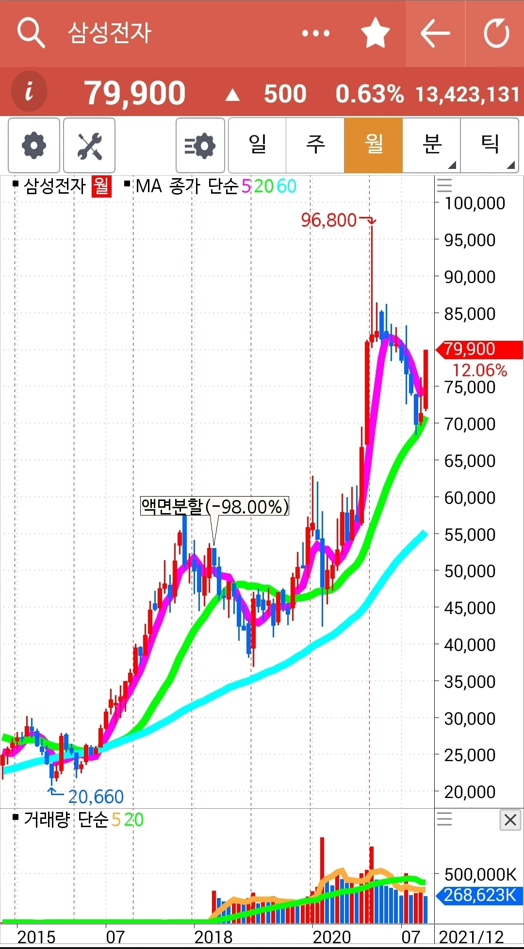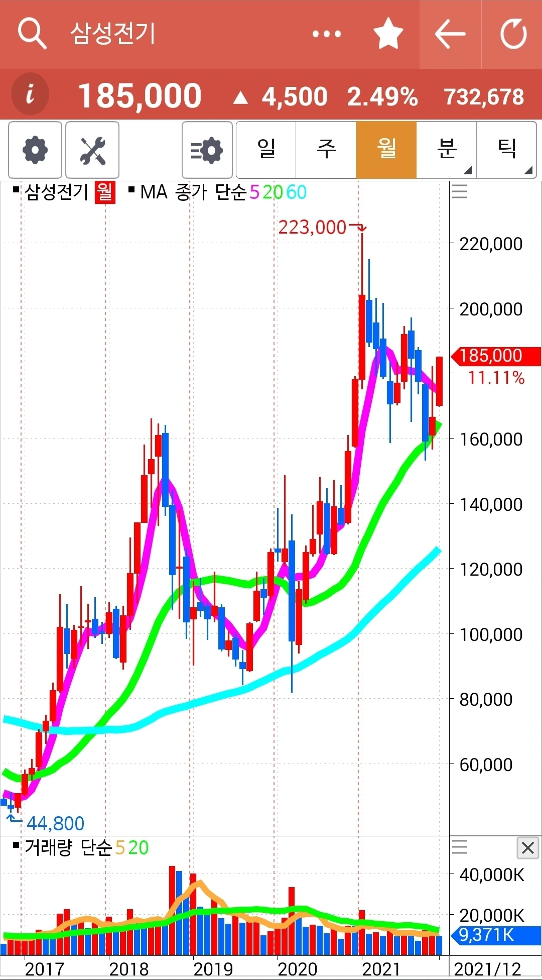 요즘 읽고 있는 책에서 60일선을 중요하게 이야기해 추가했다. 기존의 핑크가 5일선 연두가 20일선 거기 하늘색 60일선을 추가했다. 게다가 난 일봉이면 5일선 주봉이면 5 주선 월봉이면 5개월선 이런 식으로 말했는데 어디서나 5일선이라고 말하면 되는 거였다. 60일선의 우상향이 중요하다는데 여기 차트는 모두 우상향이다. 다행이다.