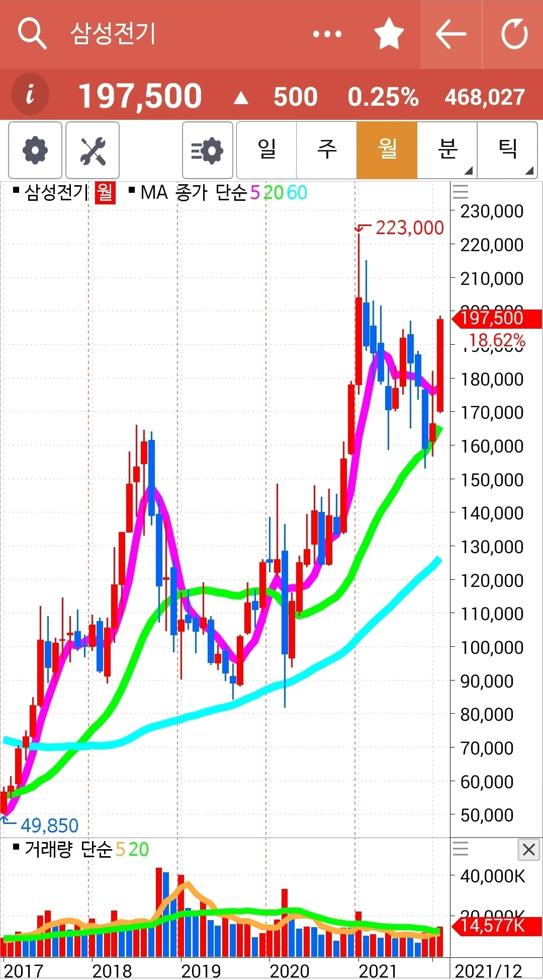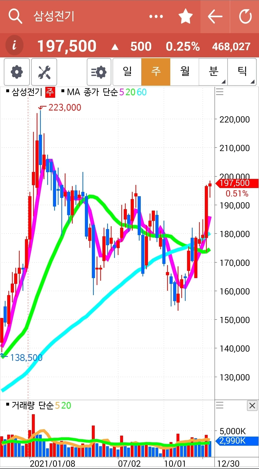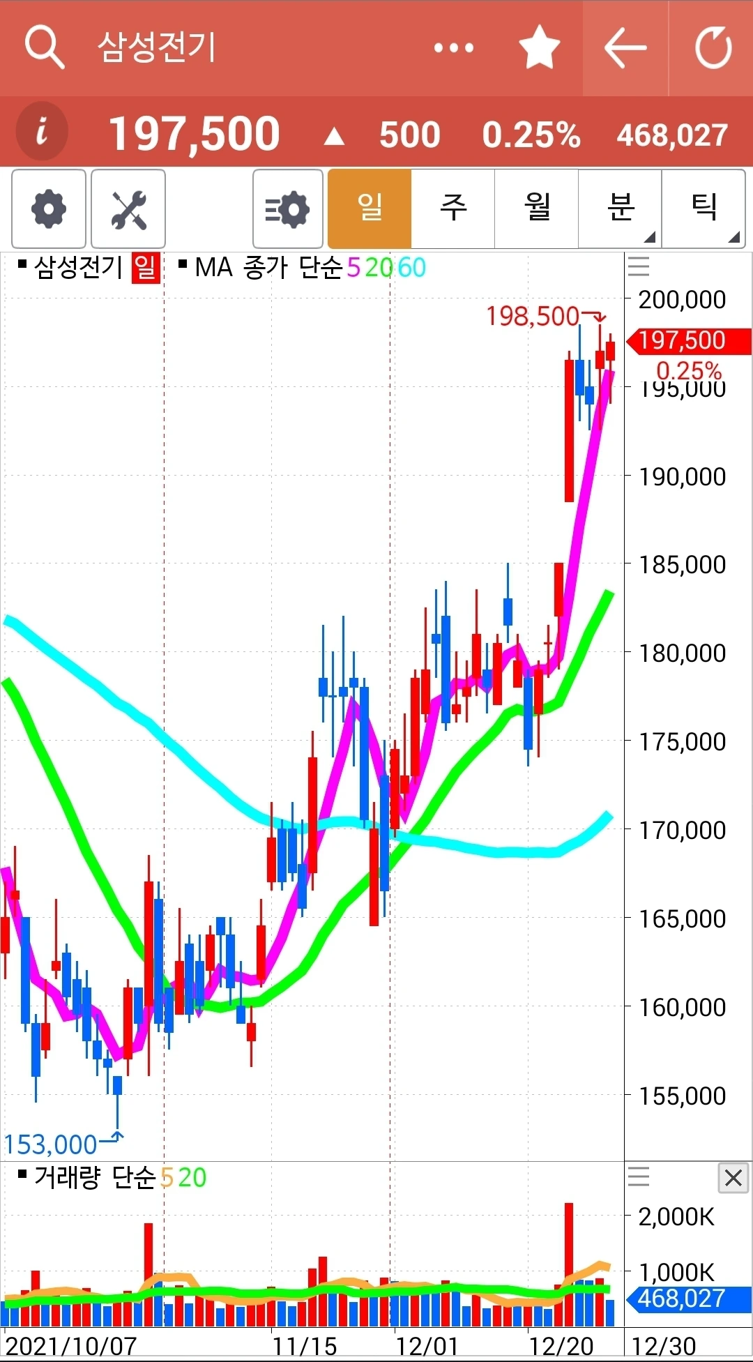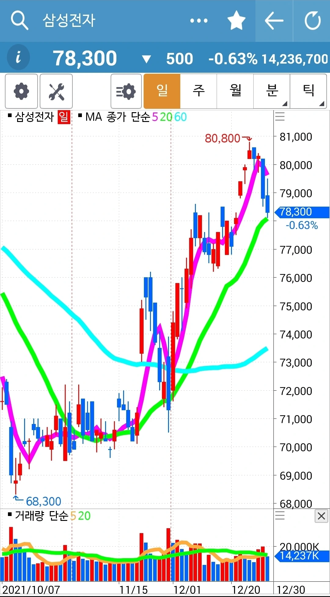 5일선이 위로 쭉 뻗어있다. 난 요것만 할 줄 알면 된다. '난 아무것도 몰라요~ 5일선이 20일선을 뚫고 내려오면 매도할 뿐야요~' 오늘도 파이팅!