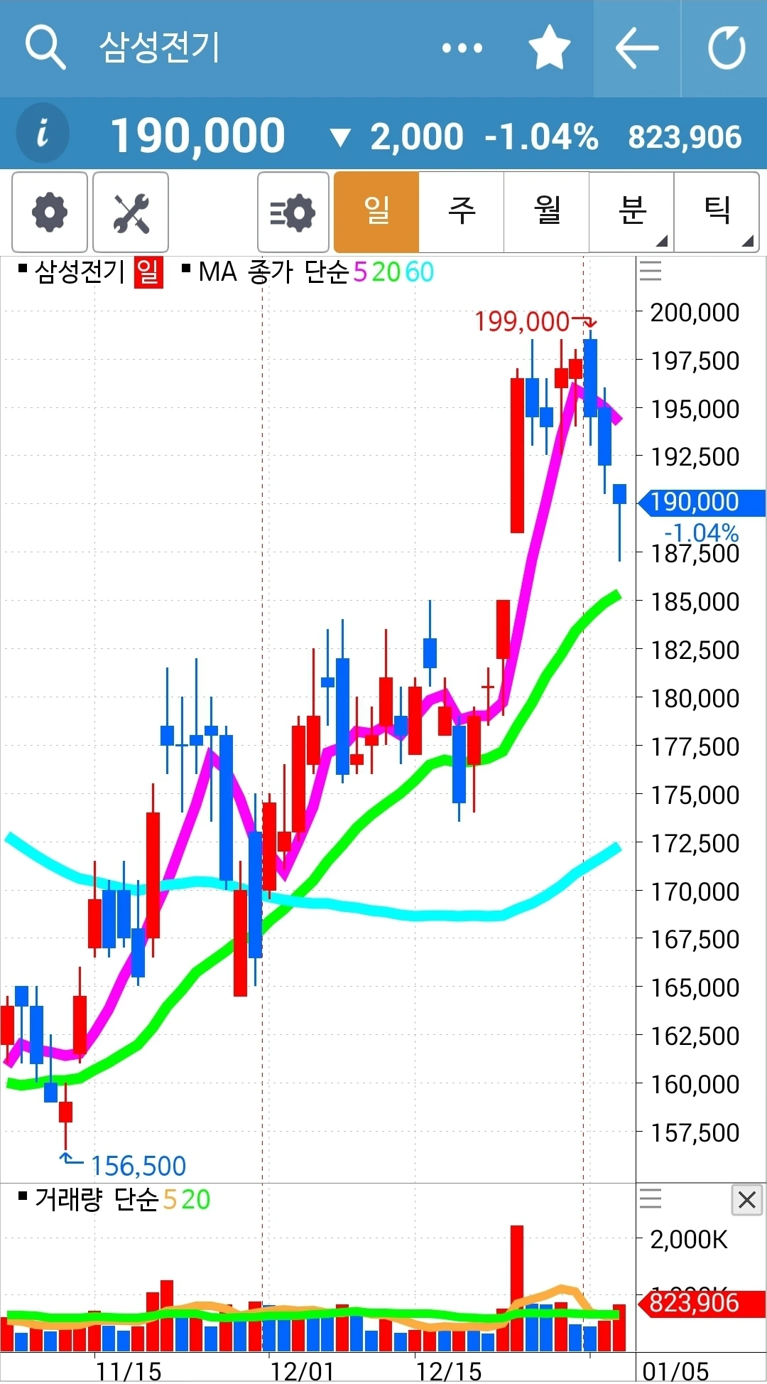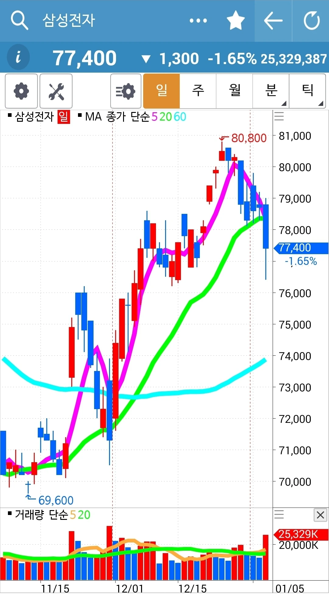 20일선을 향해 달려 내려가고 있는 모습. 제발 위로 확 방향을 돌려라~ 희망사항일 뿐 난 냉정하게 지켜보다가 나의 원칙을 어기는 순간 칼같이 뚝 자를 뿐이다. 난 그건 해낼 수 있다. 두고 봐라. 5일선이 20일선 아래로 내려가는 순간 너를 내치리. 파이팅!