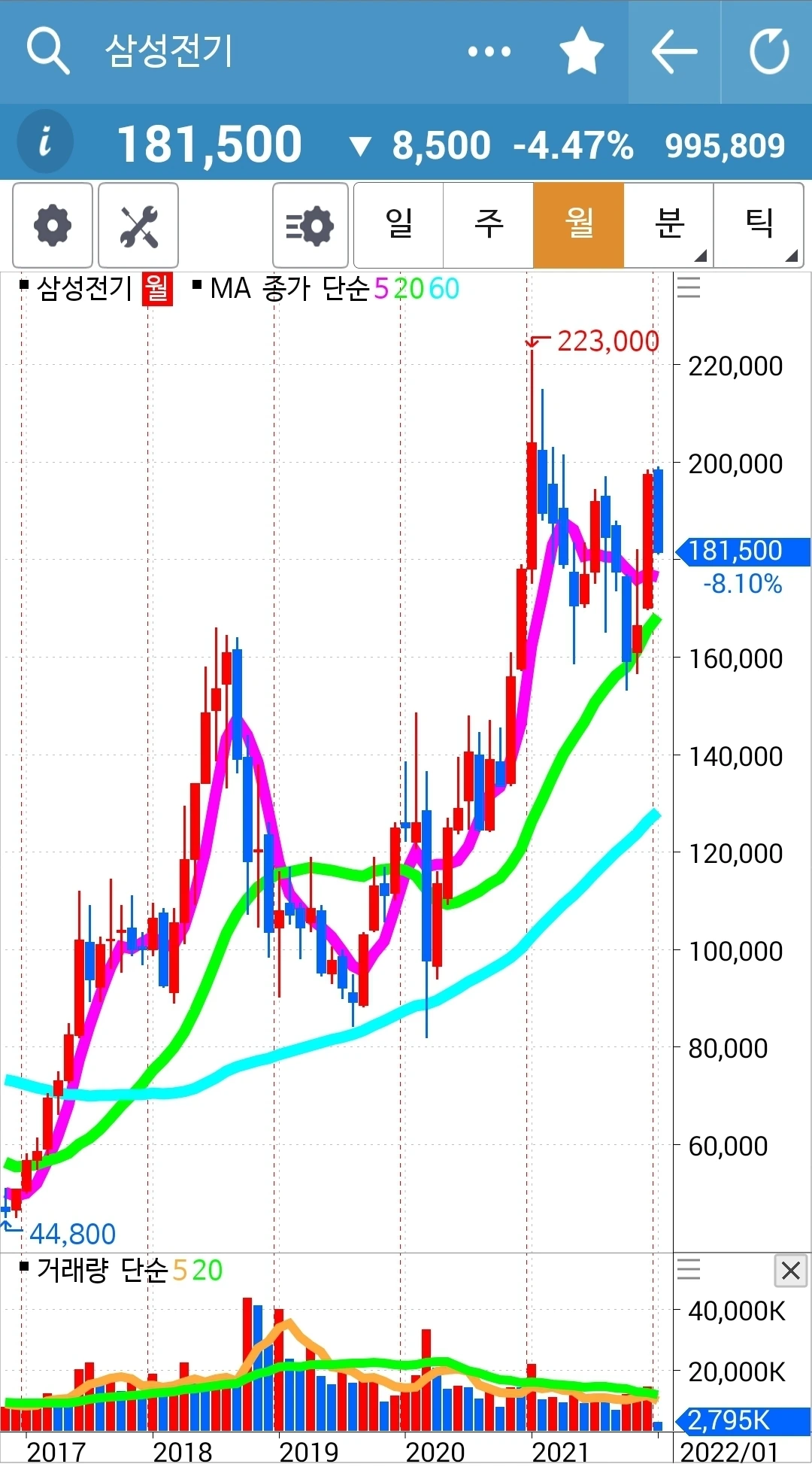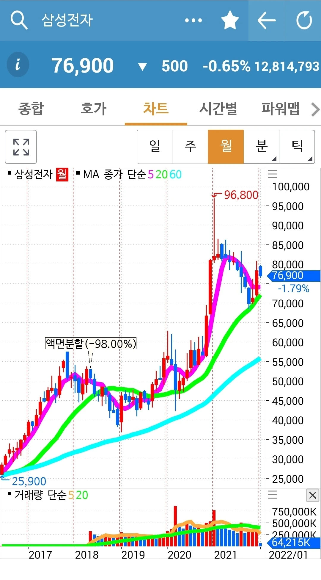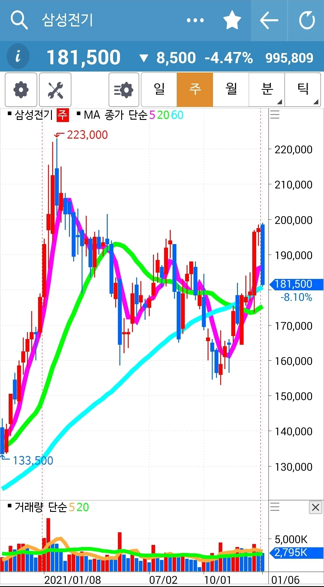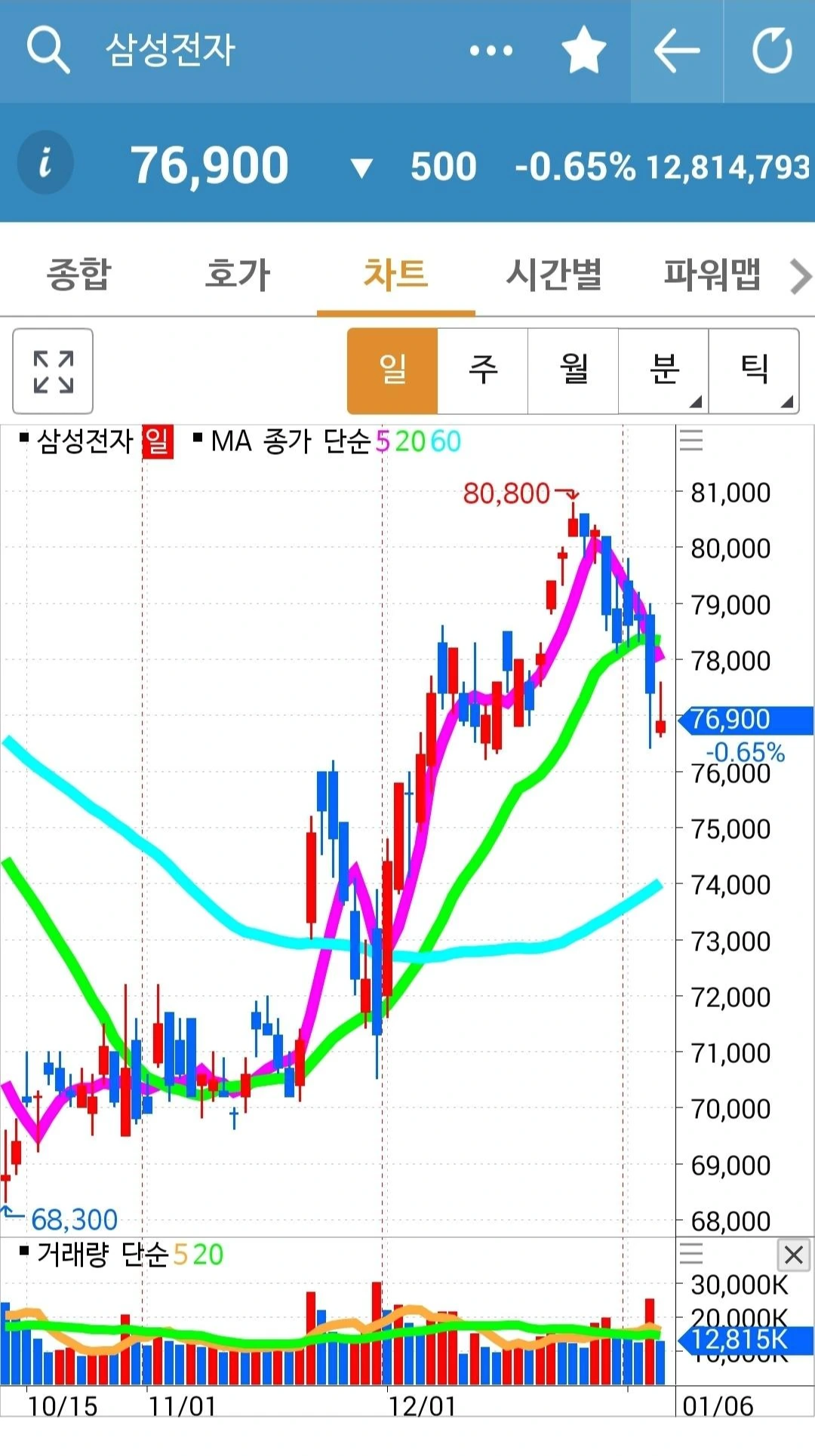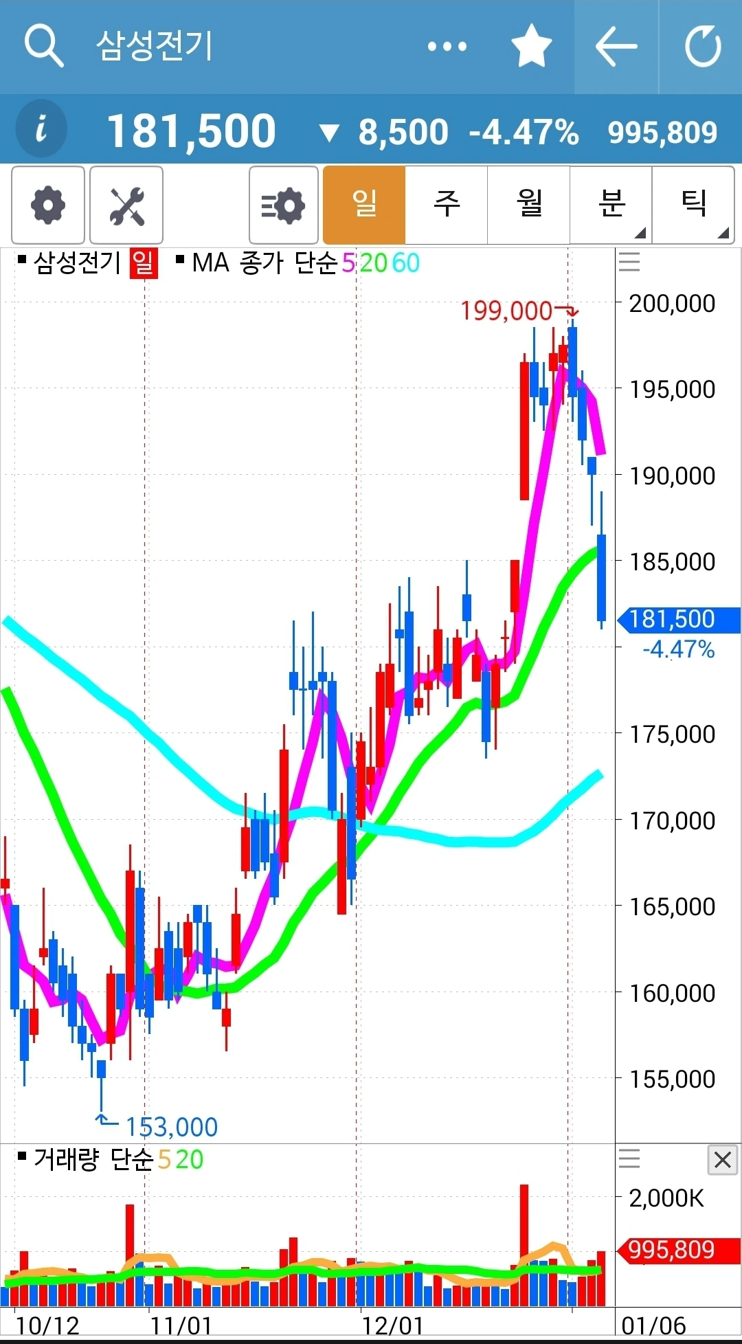 삼성전자의 5일선은 드디어 20일선 아래로 내려갔다. 종가 단일가에 정리했다. 나의 매매에 문제가 있는 것 같다. 수익이 나고 고점에서 횡보할 때 일단 나와주고 그리고 다시 시작하는 방법을 택했다면 수익을 챙길 수 있었을 텐데. 그러나 그 어떤 구체적인 방법이 서지 않아 그냥 나의 기본원칙만을 지키고 있다. 왜냐하면 횡보하는 듯하다가 올라가는 경우도 많으니까. 난 손실을 관리하면서 올라갈 때 끝까지 따라가는 게 목표니까. 그러기 위해선 주봉의 5일선 20일선으로 했어야 할까? 일봉의 5일선 20일선은 너무 자주 바뀌게 되는 것 같기도 하다. 그래도 새롭게 룰을 짜기 전까진 기본 나의 원칙에 충실하는 거다. 5일선이 20일선 아래로 내려가면 매도한다. 아주 쉽고 간단하기 때문에 난 지킬 수 있다. 최소환 리스크 관리는 되는 것이다. 그렇게 손실 관리를 하다 보면 결국엔 이길 수 있다. 당장 수익은 못 낼 지라도. 오케이 다시 잘 연구해보자. 시간이 없으면 하던 원칙만 지켜내고 시간이 나면 그때 좀 더 연구하면 된다. 파이팅!