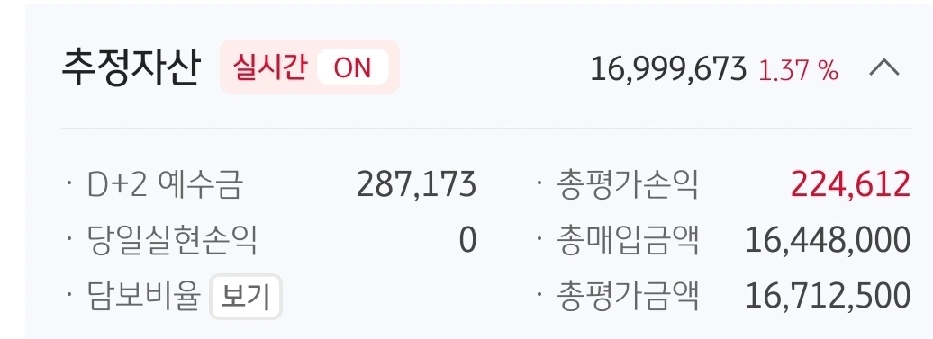 사진 1. 추정자산. 1699만 원. 301만 원 손실 중.