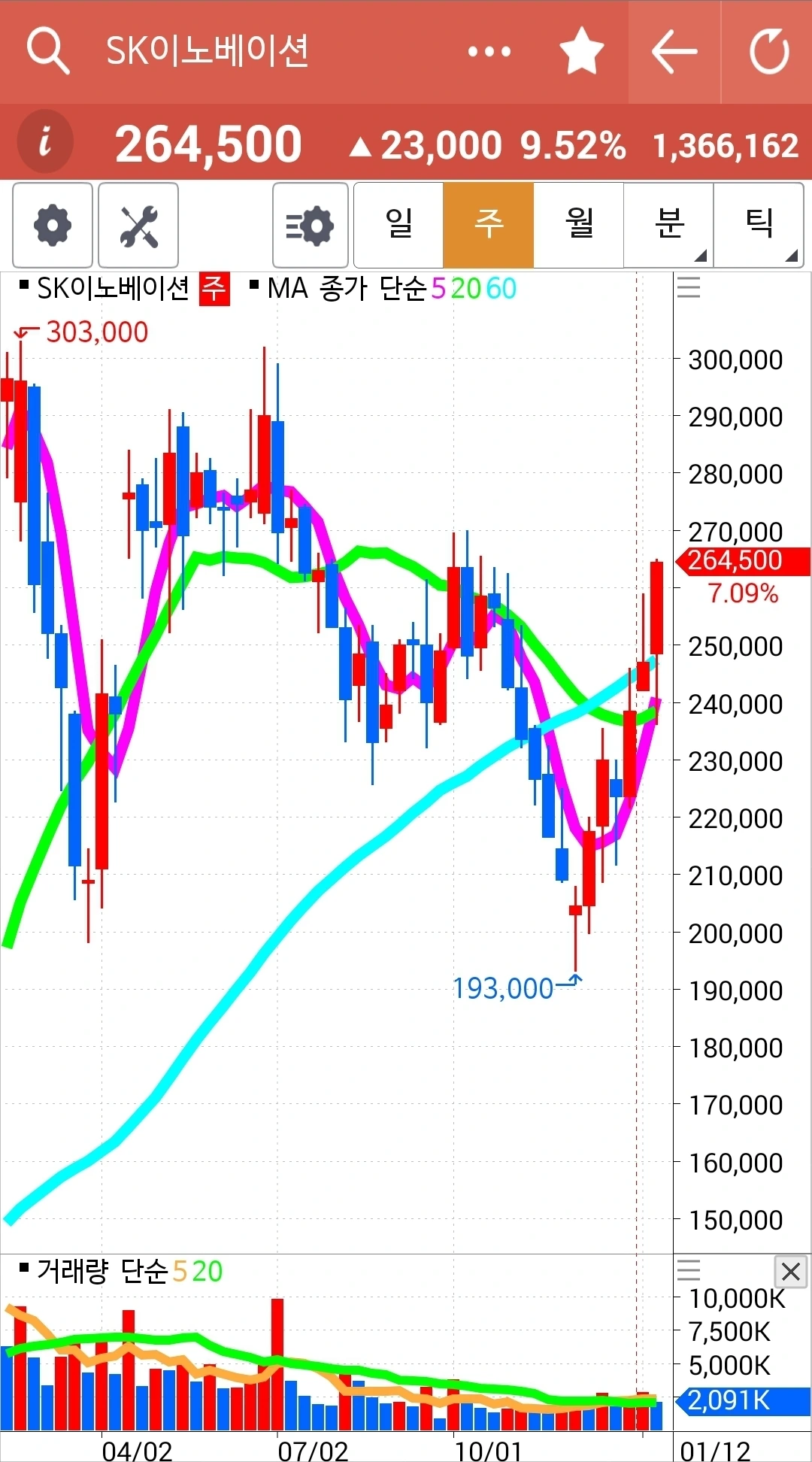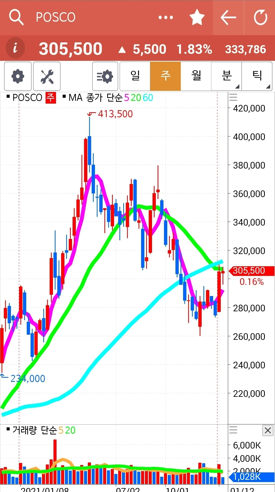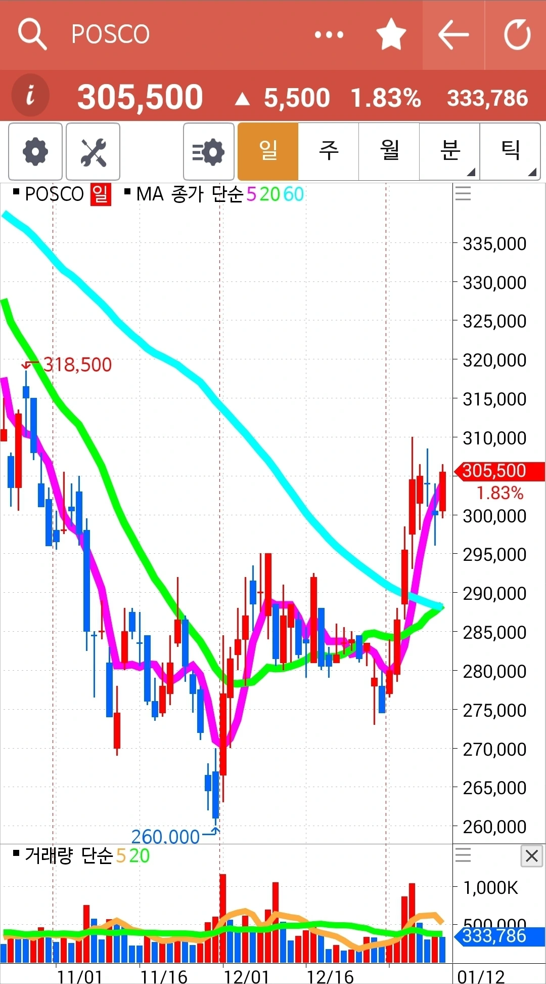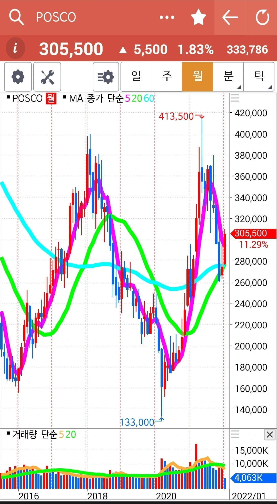현금도 투자라고 했지만 현금만 쥐고 빵빵 올라가는 것들을 구경하려니 영 심기가 불편하다. 나만 빼놓고! 특히 Sk이노베이션! 헉. 이게 얼마야? 무려 19,000원이 올라가고 있다. 시뻘건 기둥이 빵! 이렇게 높은데 어쩌려고. 이걸 따라간다고? 암. 힘센 놈을 잡아야지. 현금 쥐고 바라만 보라고? 노노노! 마음속에선 사라 아서라 두 소리가 너 잘랐다 떠들고 나의 손은 키보드 위에서 누를까 말까 왔다 갔다 한다. 차트를 보고 과감히 판단을 내리자. 일단 일봉의 5일선이 20일선 위에 있다. 주봉의 5일 선도 20일선 위를 살짝 뚫고 올라왔다. 월봉의 5일 선도 20일선 위에 있다. 헉. 일봉 주봉 월봉 모두 골든크로스잖아. 게다가 전고점을 빵! 뚫어버리는 신나는 장대양봉! 그래! 이런 걸 안 따라가고 무얼! 그래도 너무 올라있으니 불안하다. 그래? 그렇다면 반만! 해서 투자금액의 반을 따라붙었고 반은 일봉 5일선이 위에 있으나 갑자기 시뻘건 장대양봉은 아닌 좀 안전해 보이는 포스코를 택했다. 파이팅!