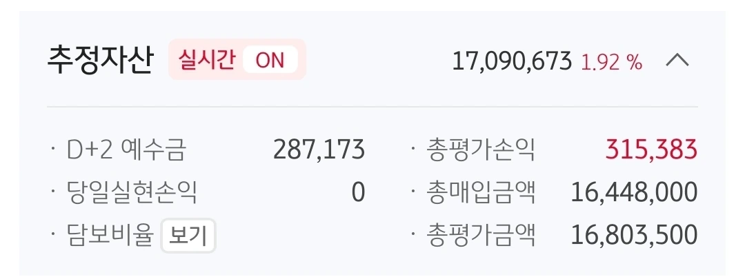 사진 1. 추정자산. 1709만 원. 291만 원 손실 중.