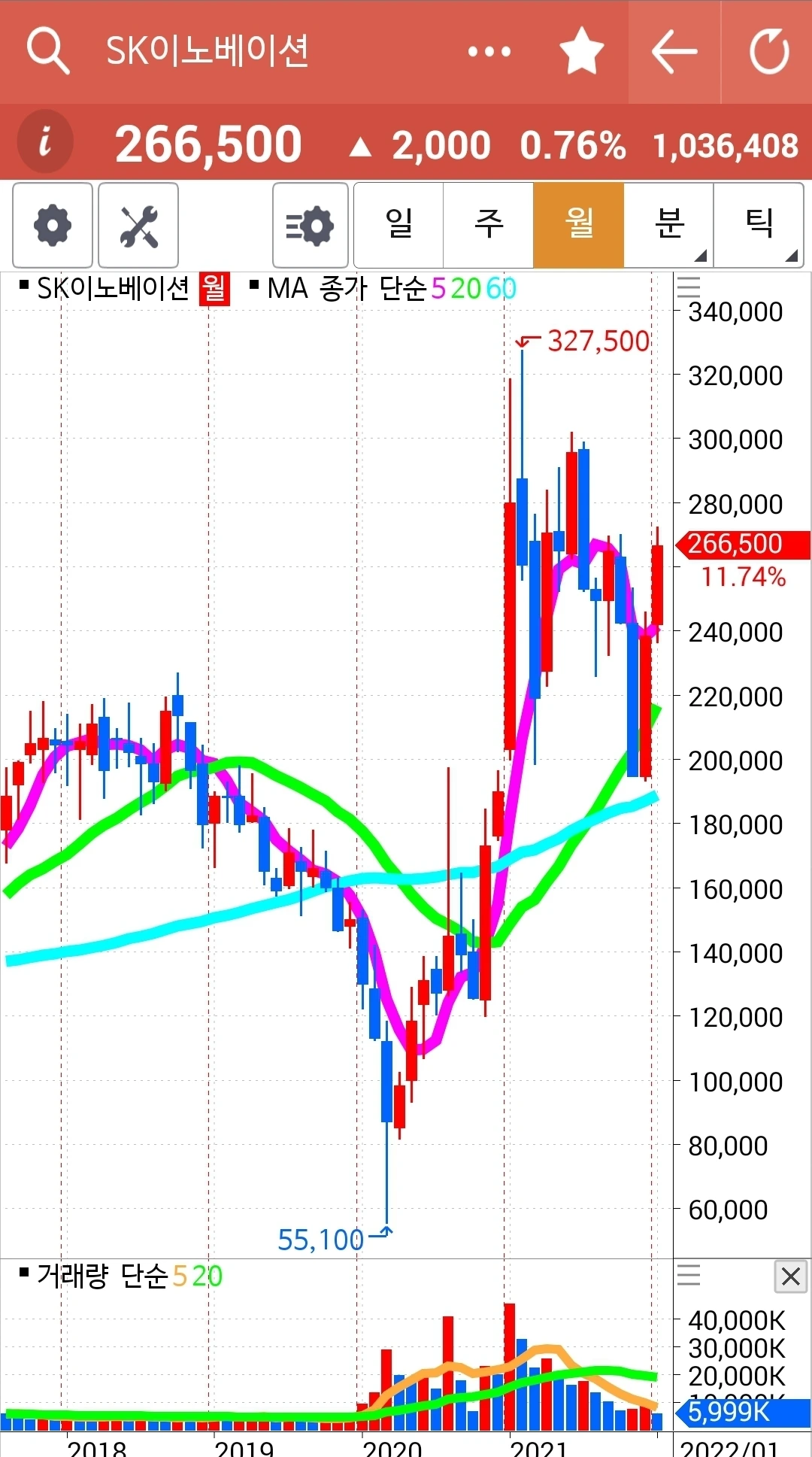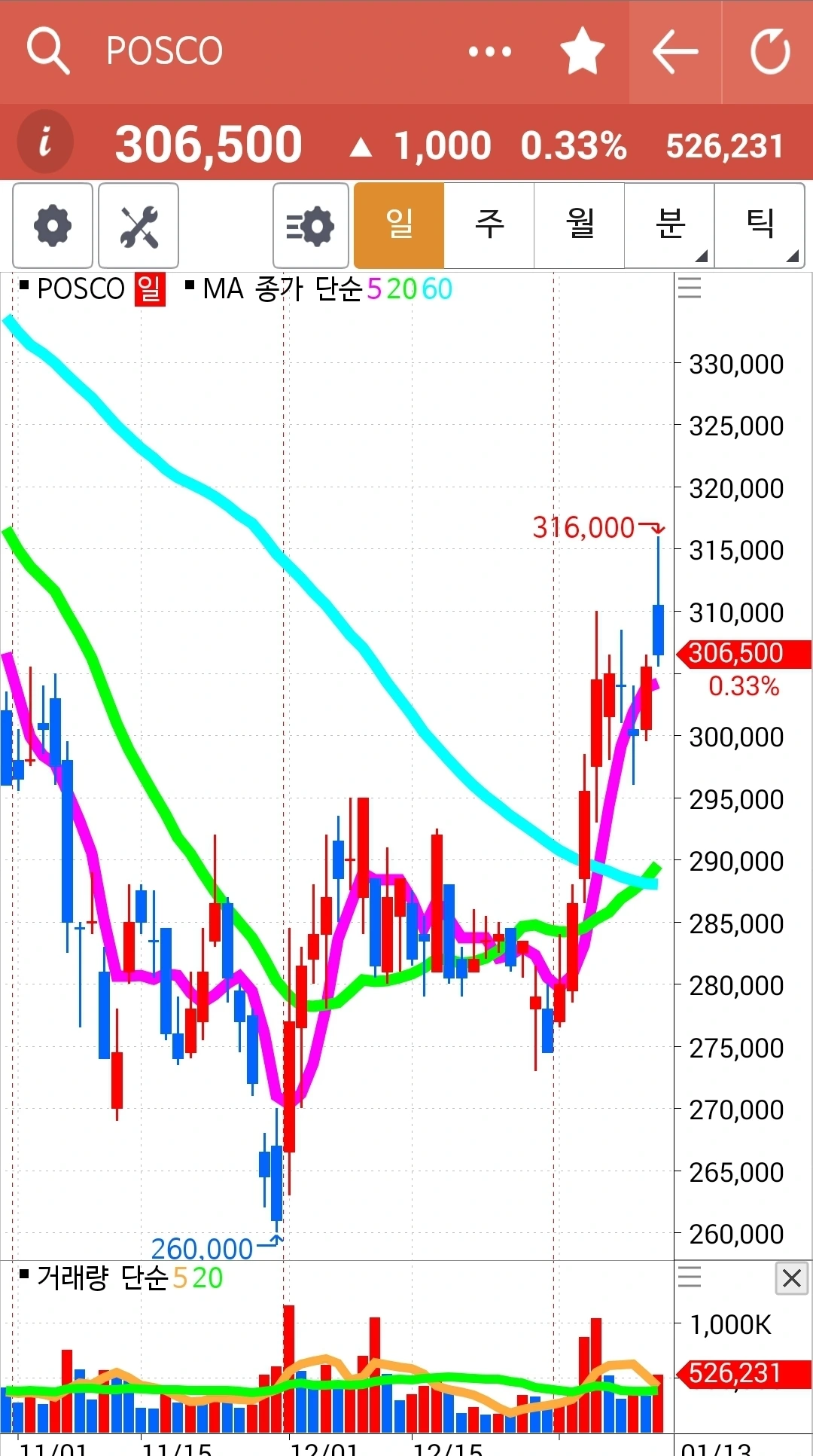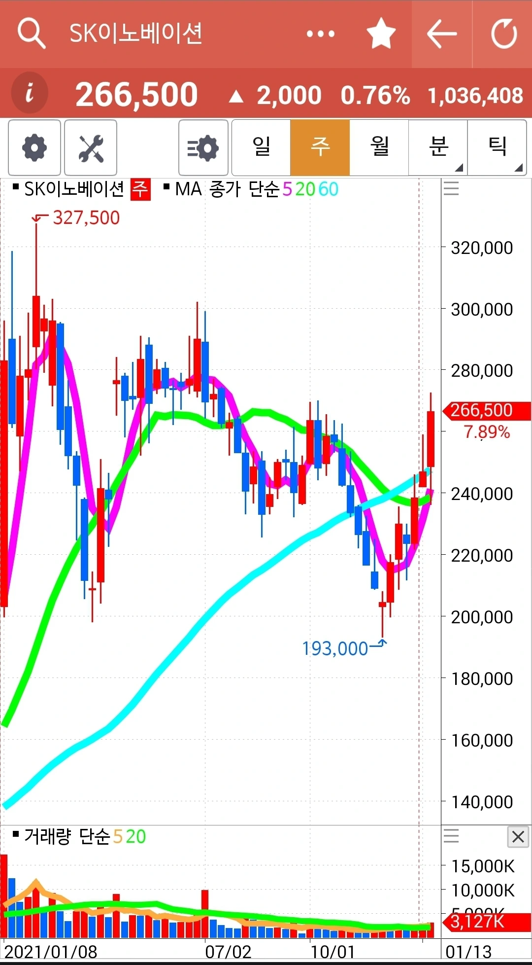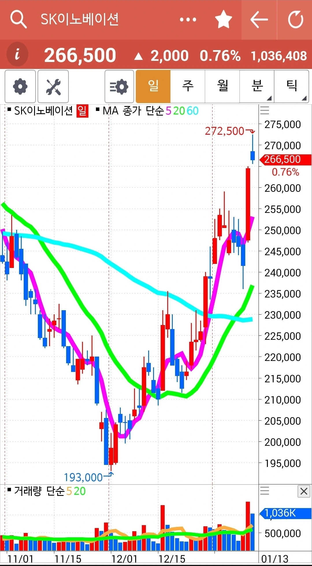 이것 역시 올라가는 전선에 이상 없다. 이 정도에선 수익을 챙겨야지? 하는 거 하지 않는다. 난 아무것도 모른다. 다만 5일선이 20일선 아래로 내려가면 가차 없이 매도한다. 그것만 할 뿐이다. 오늘도 씩씩하게 파이팅! 하하