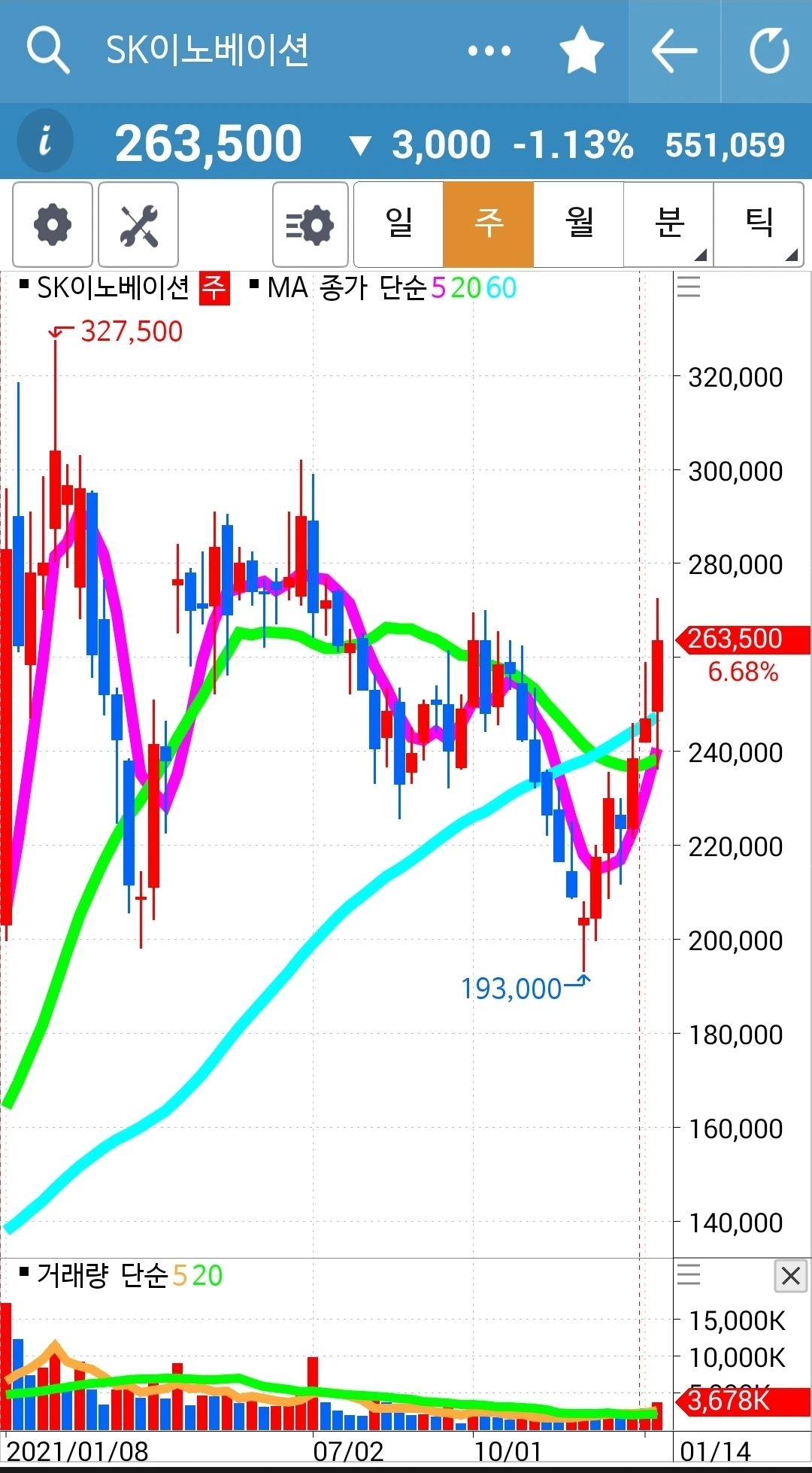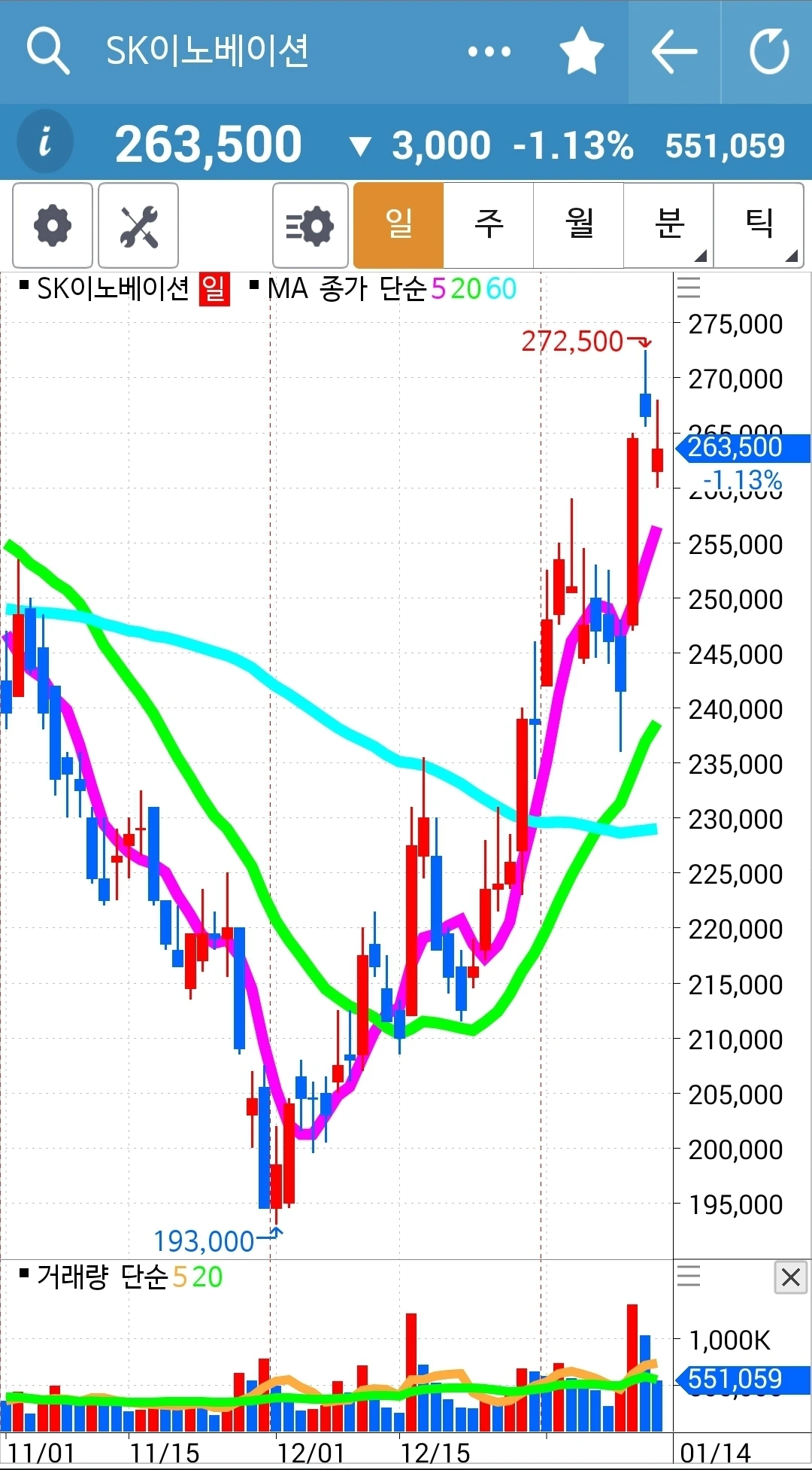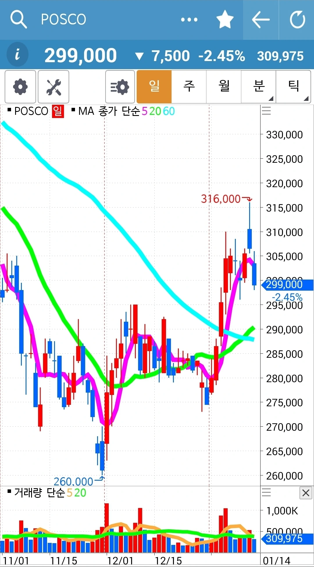 일봉의 5일선이 20일선 위에 있으므로 난 가만히 있는다. 와이? 난 요것만 할 줄 아니까. '난 아무것도 몰라요~ 5일선이 20일선 아래로 내려가면 매도할 뿐야요~' 파이팅!