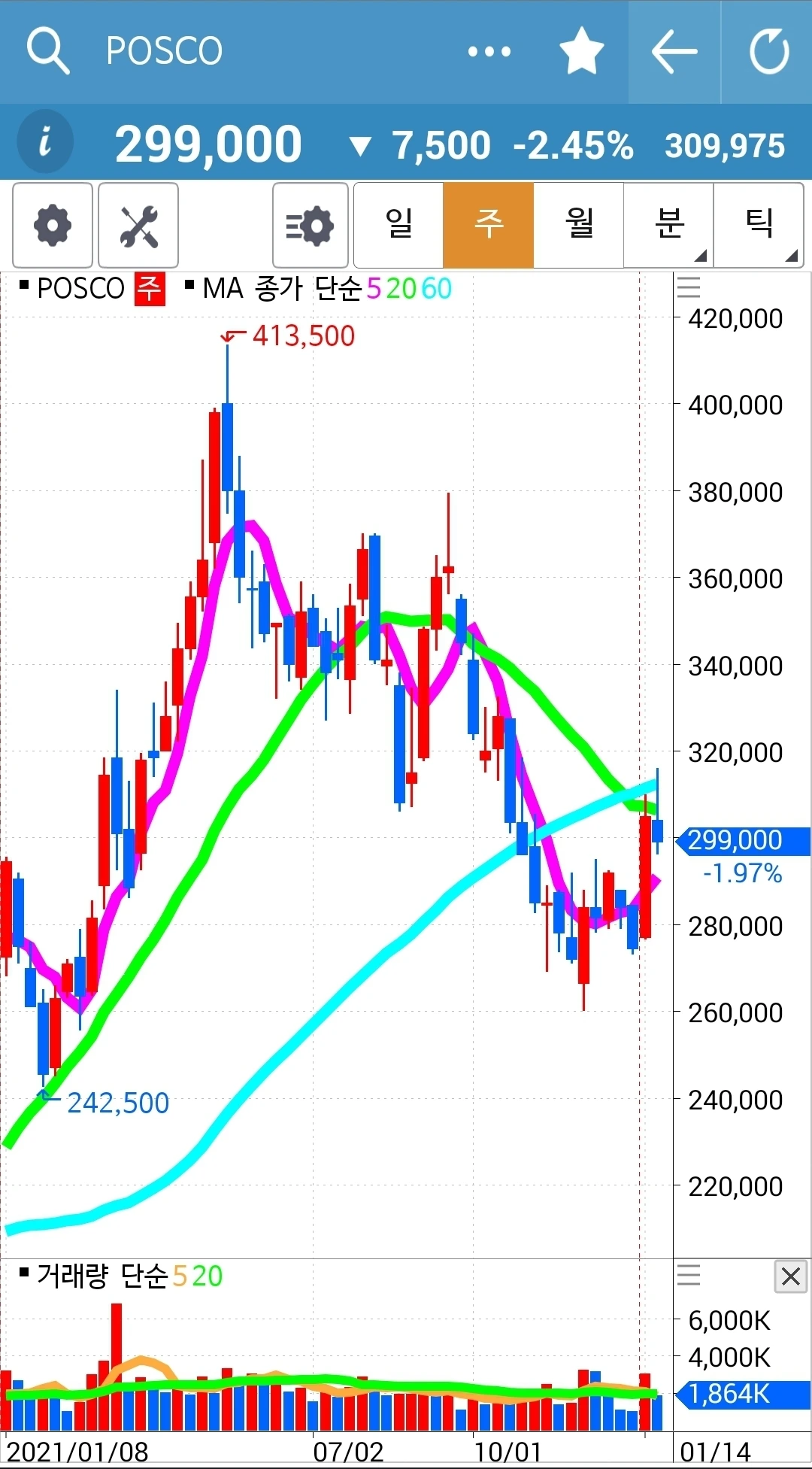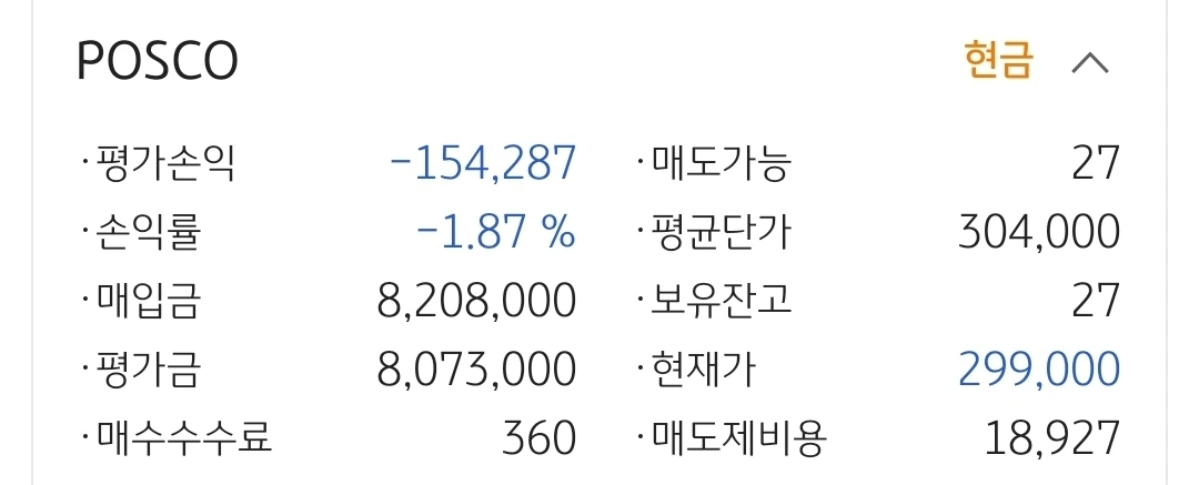 사진 3. POSCO. 15만 원 손실 중.