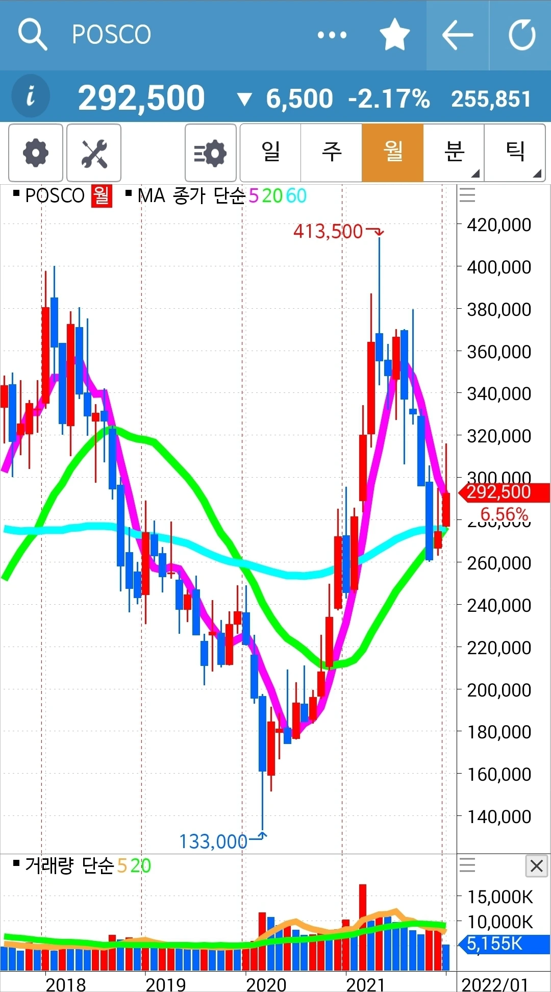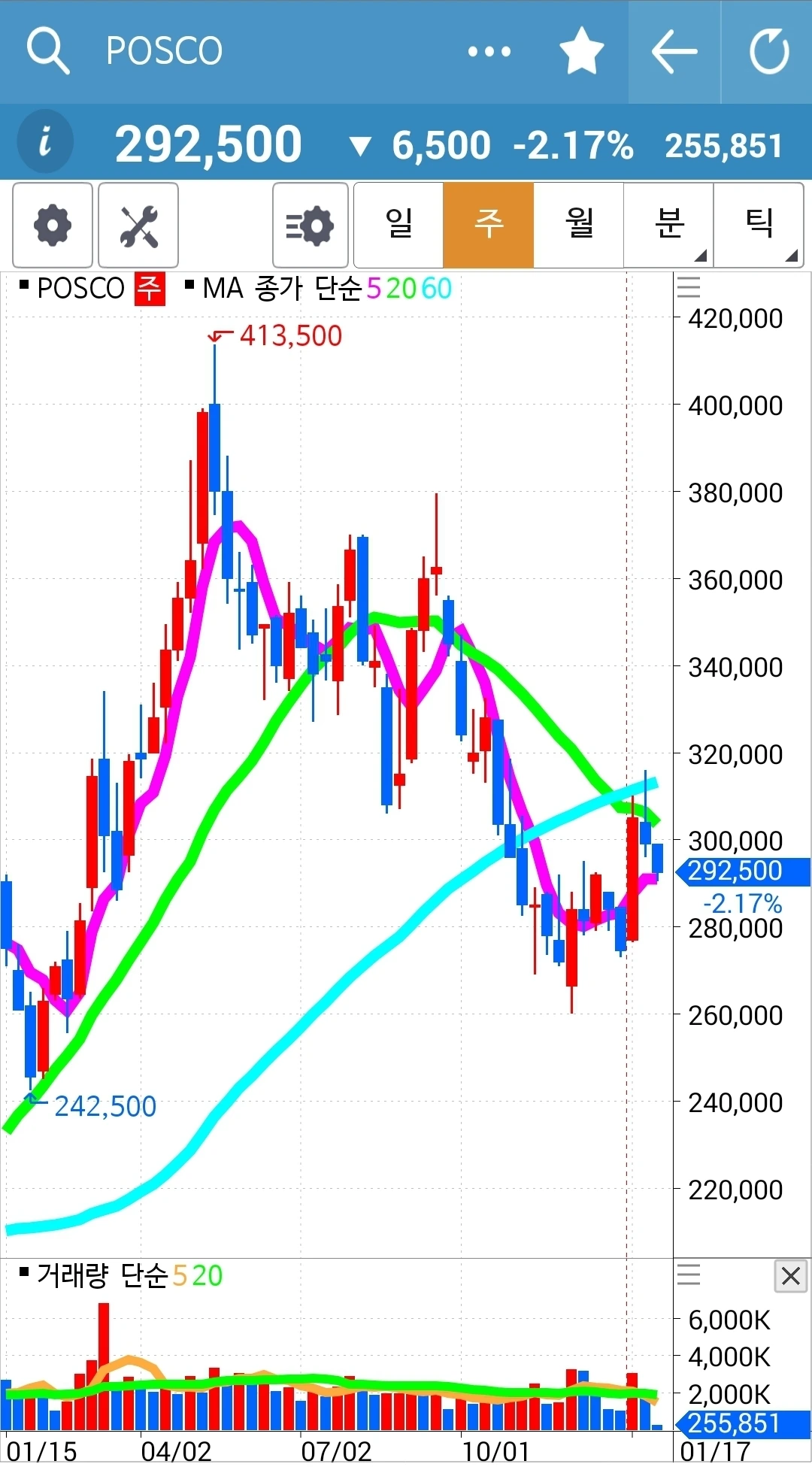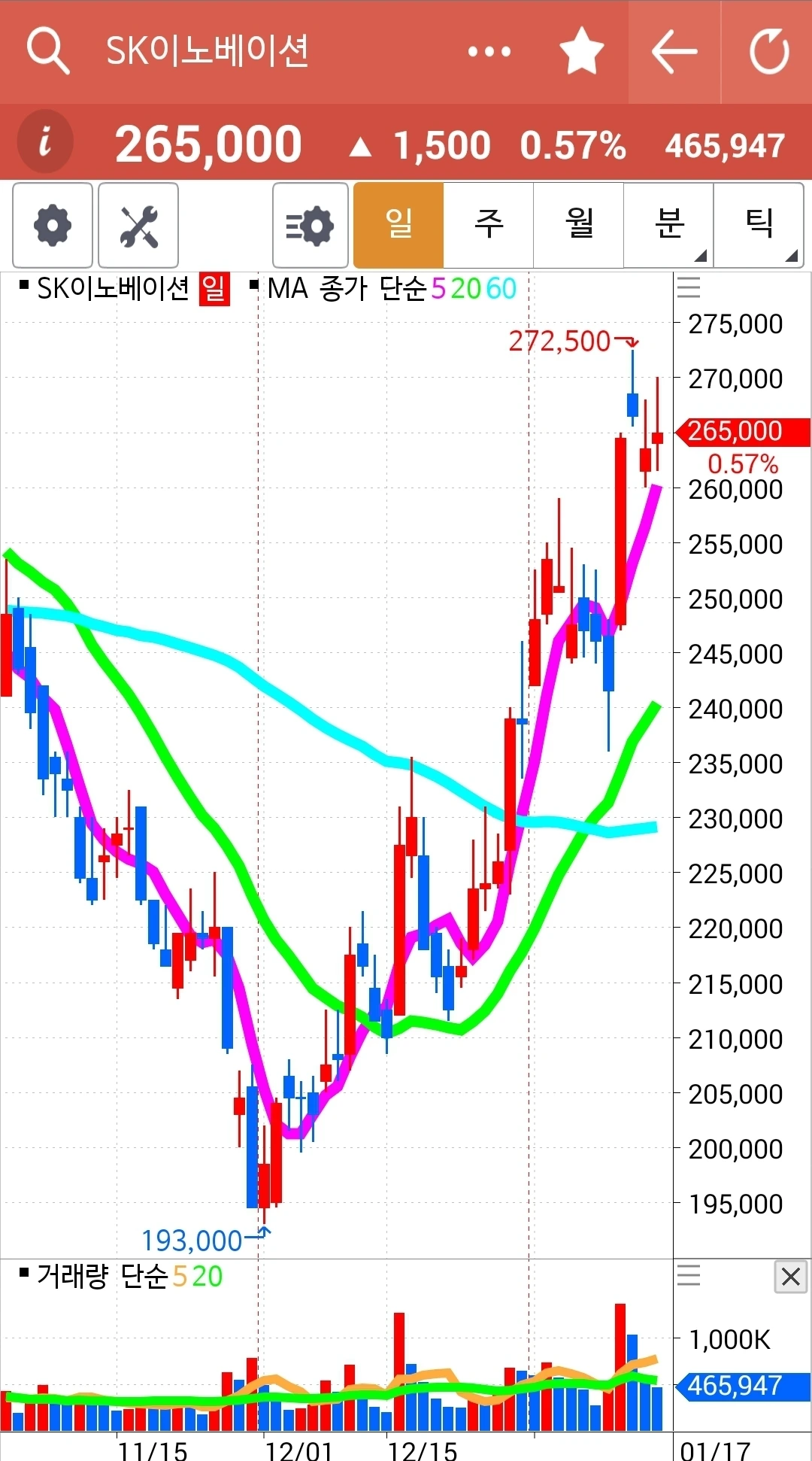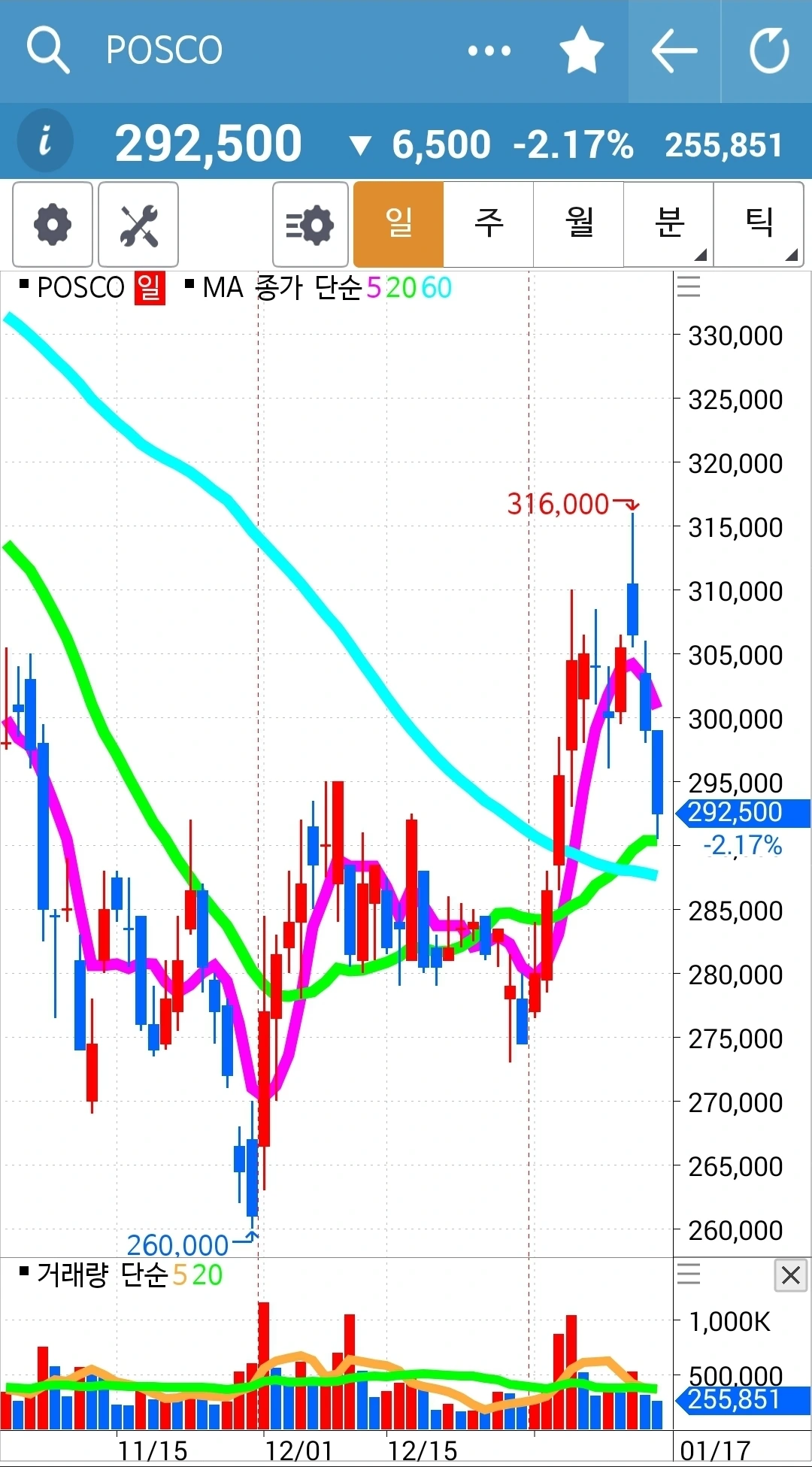 하이고 결국 20일선까지 가고야 말았다. 이미 5일선은 아래로 꺾인 상태. 내가 할 일이란? 눈 동그랗게 뜨고 5일선이 20일선 아래로 내려가느냐를 지켜볼 것. 내려가면? 즉시 매도! '난 아무것도 몰라요~ 5일선이 20일선 아래로 내려가면 매도할 뿐야요~' 하하 파이팅!