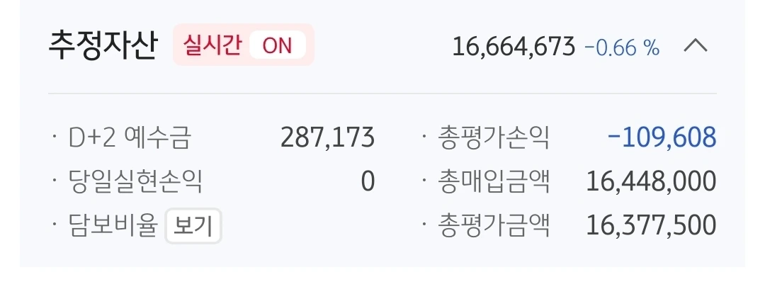 사진 1. 추정자산. 1666만 원. 334만 원 손실 중.