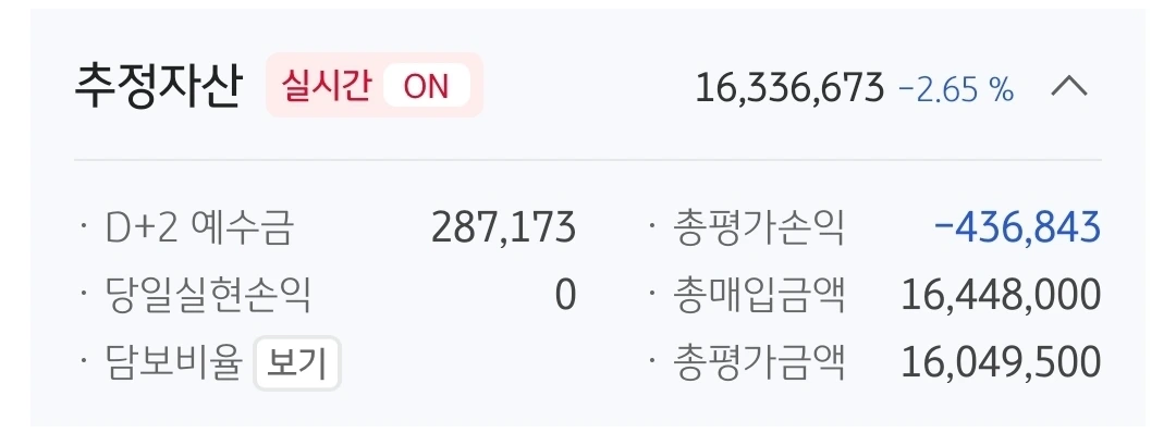 사진 1. 추정자산. 1633만 원. 367만 원 손실 중.