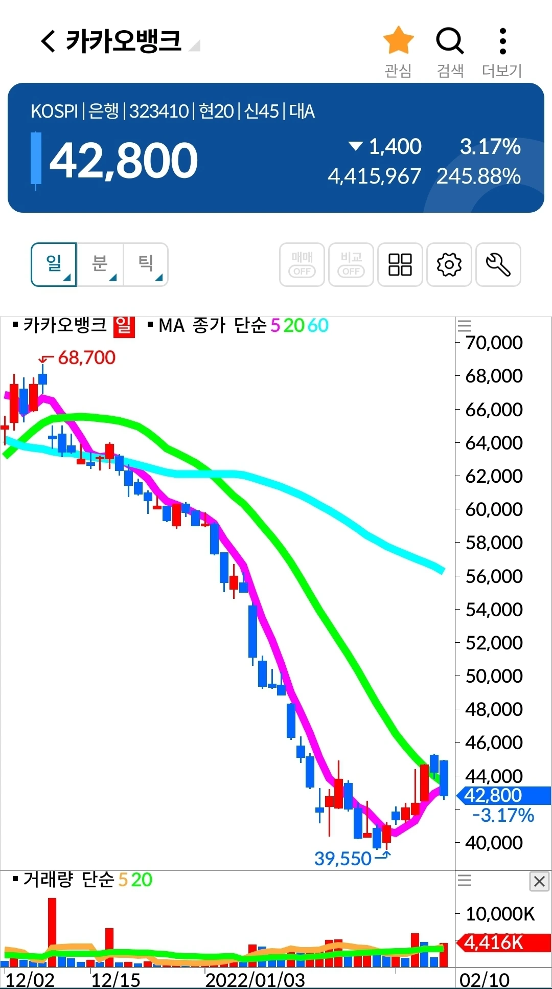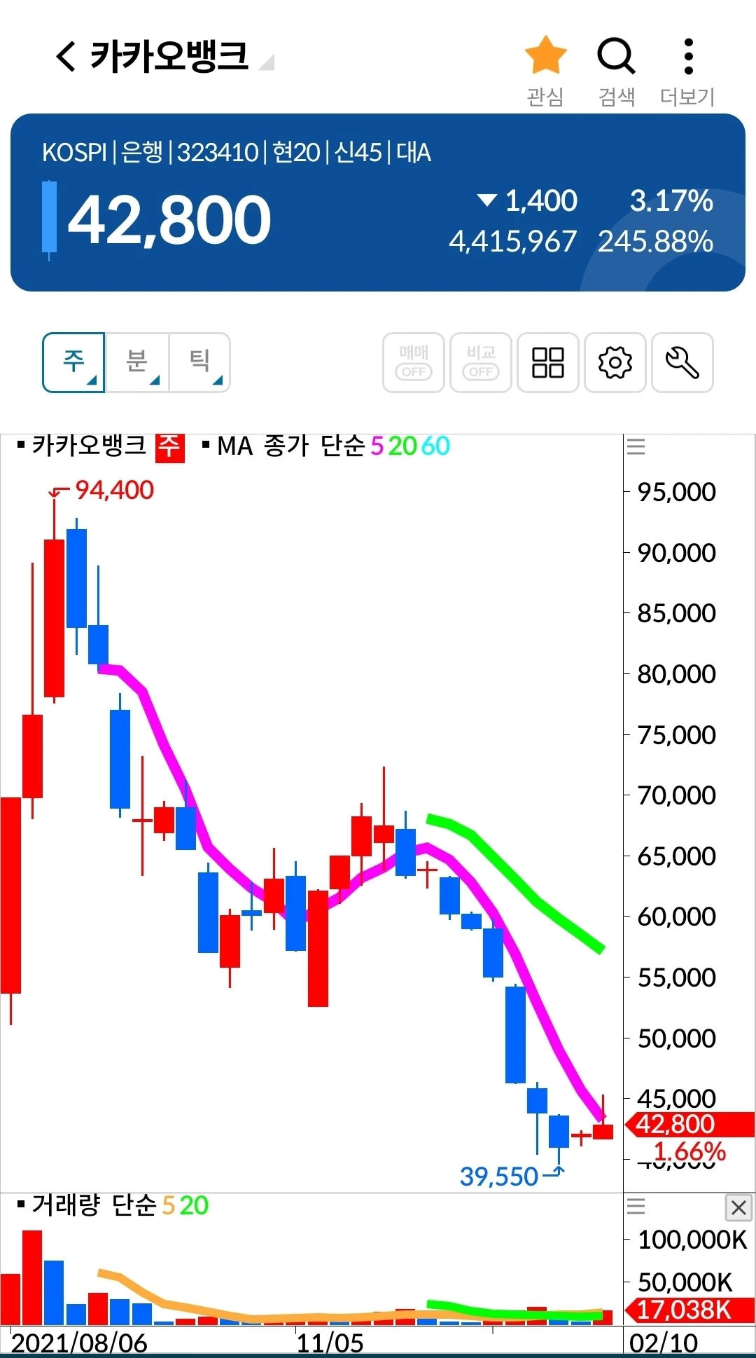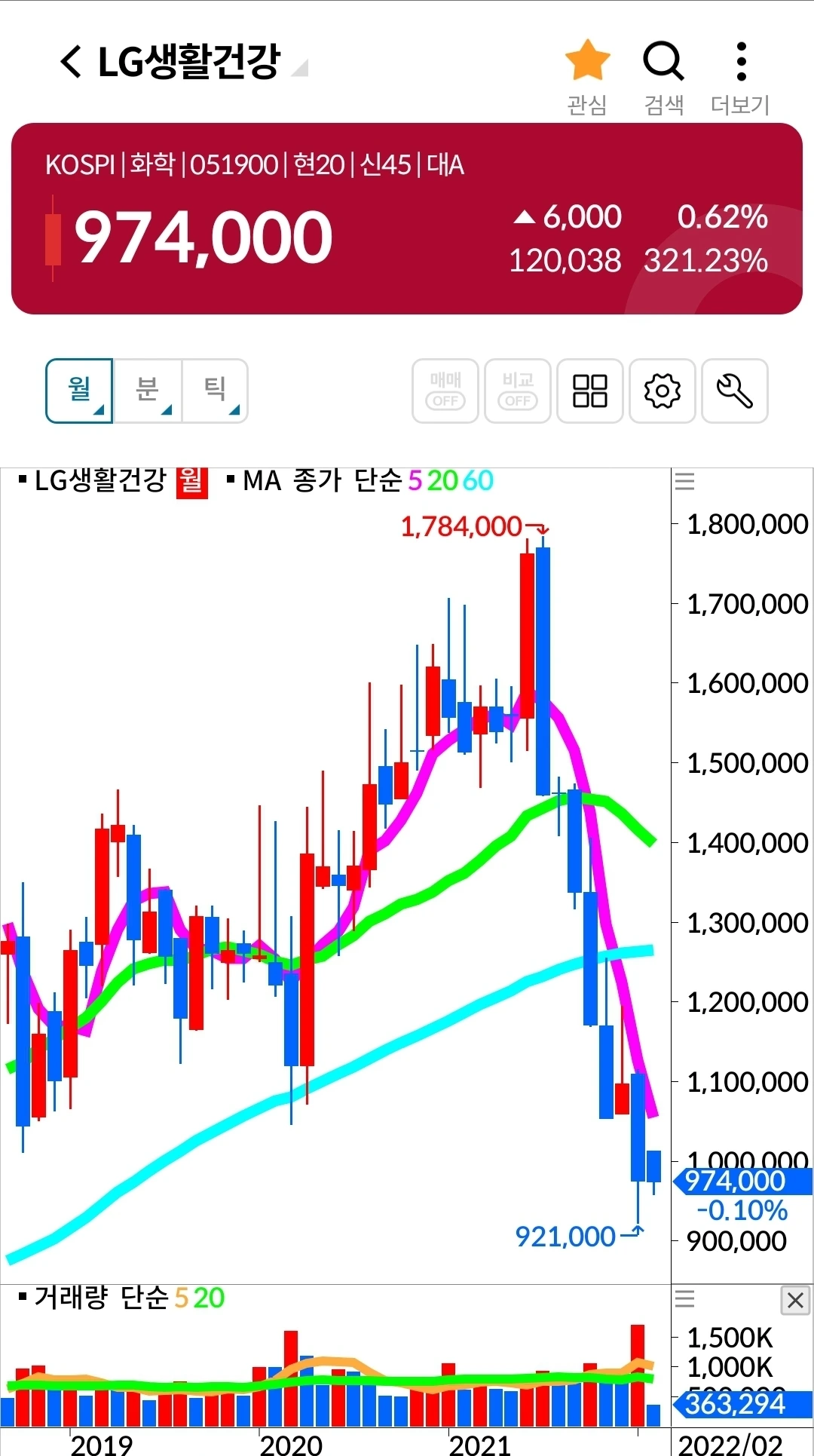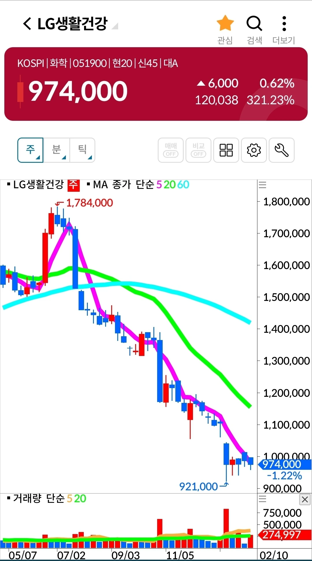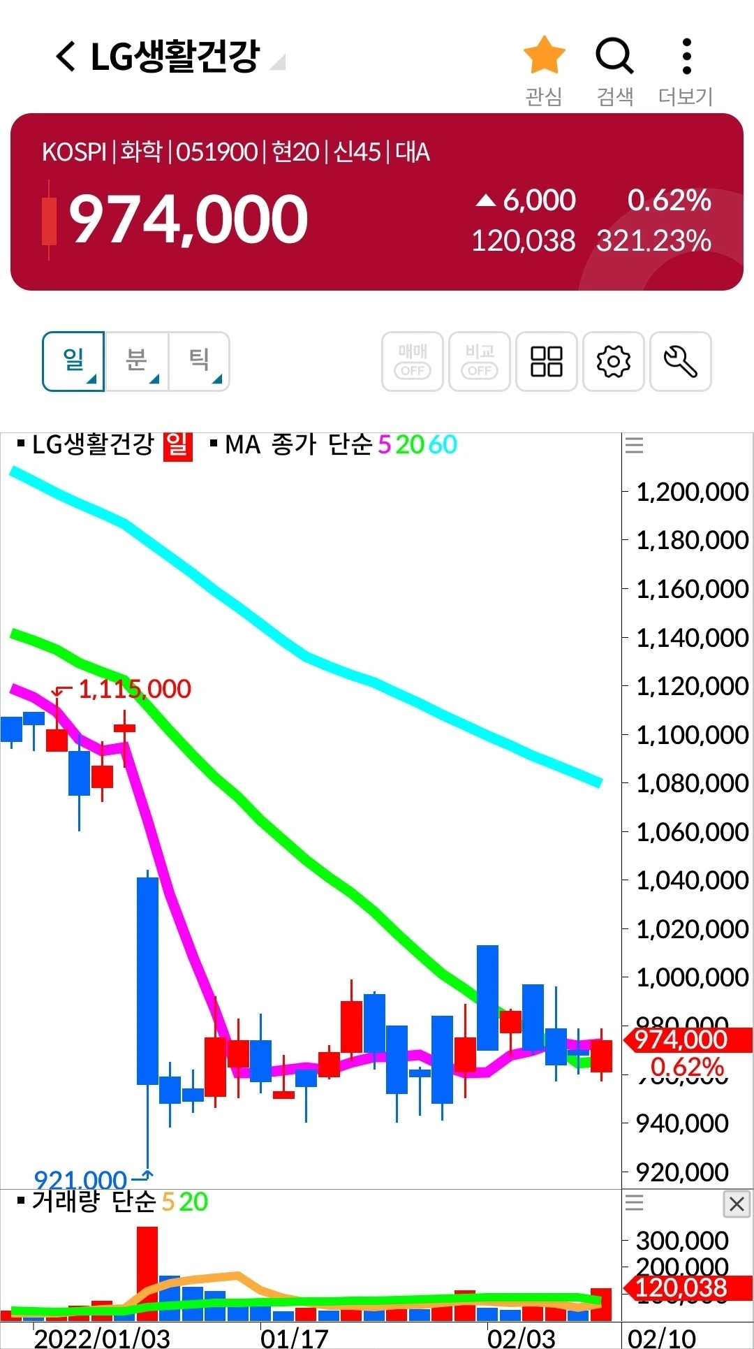 5일선 핑크빛이 20일선 연둣빛 위에 있다. 지켜볼 일만 남았다. 파이팅.