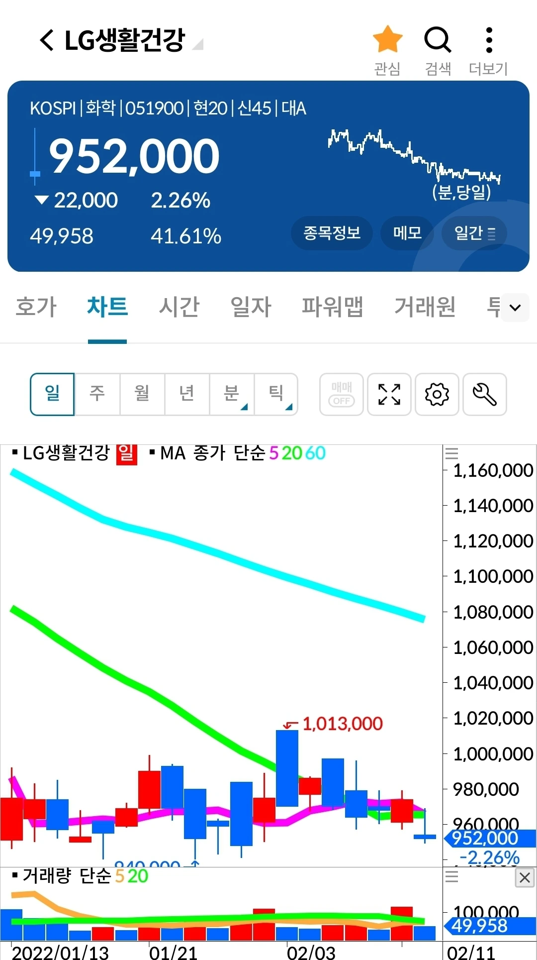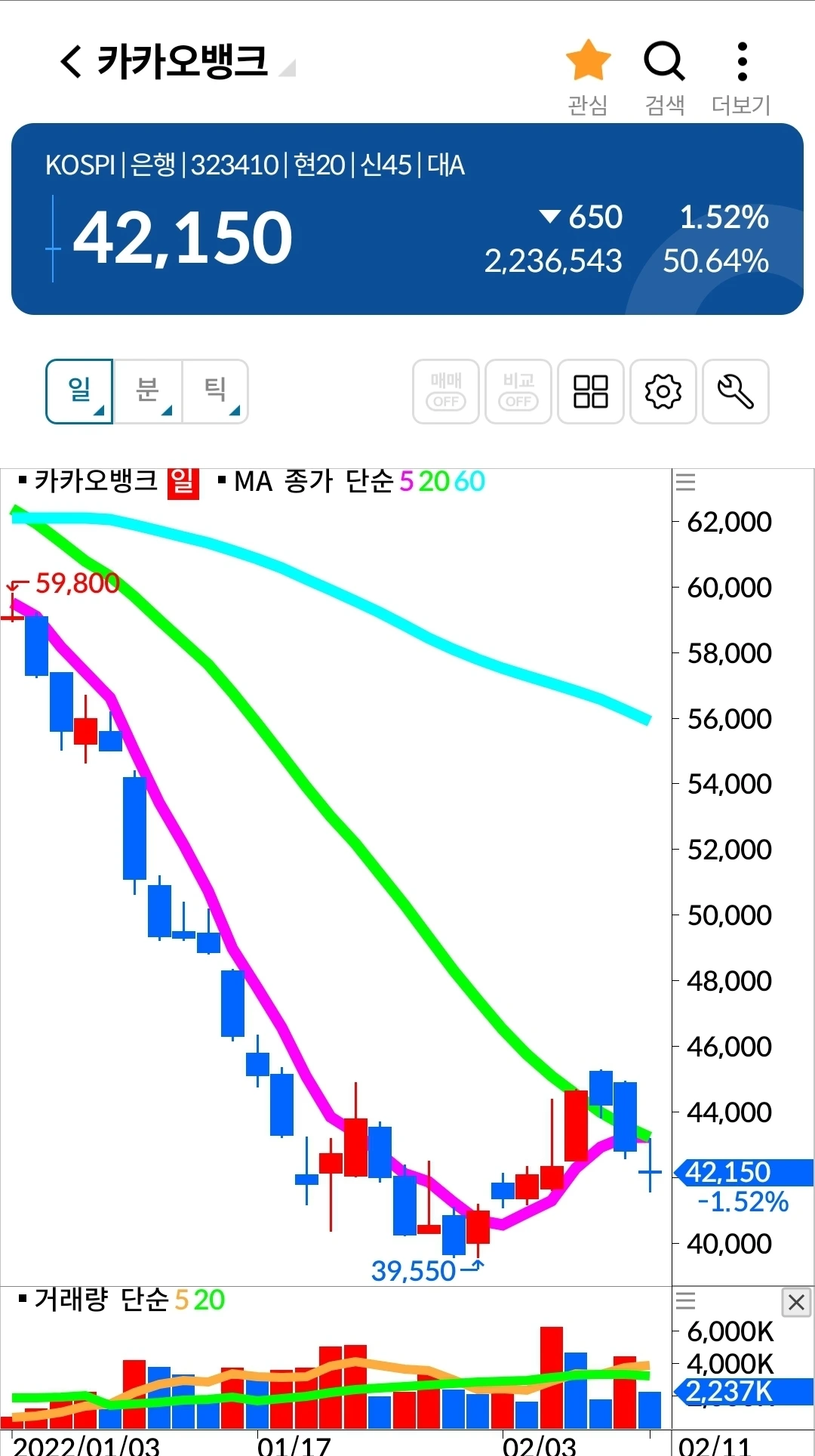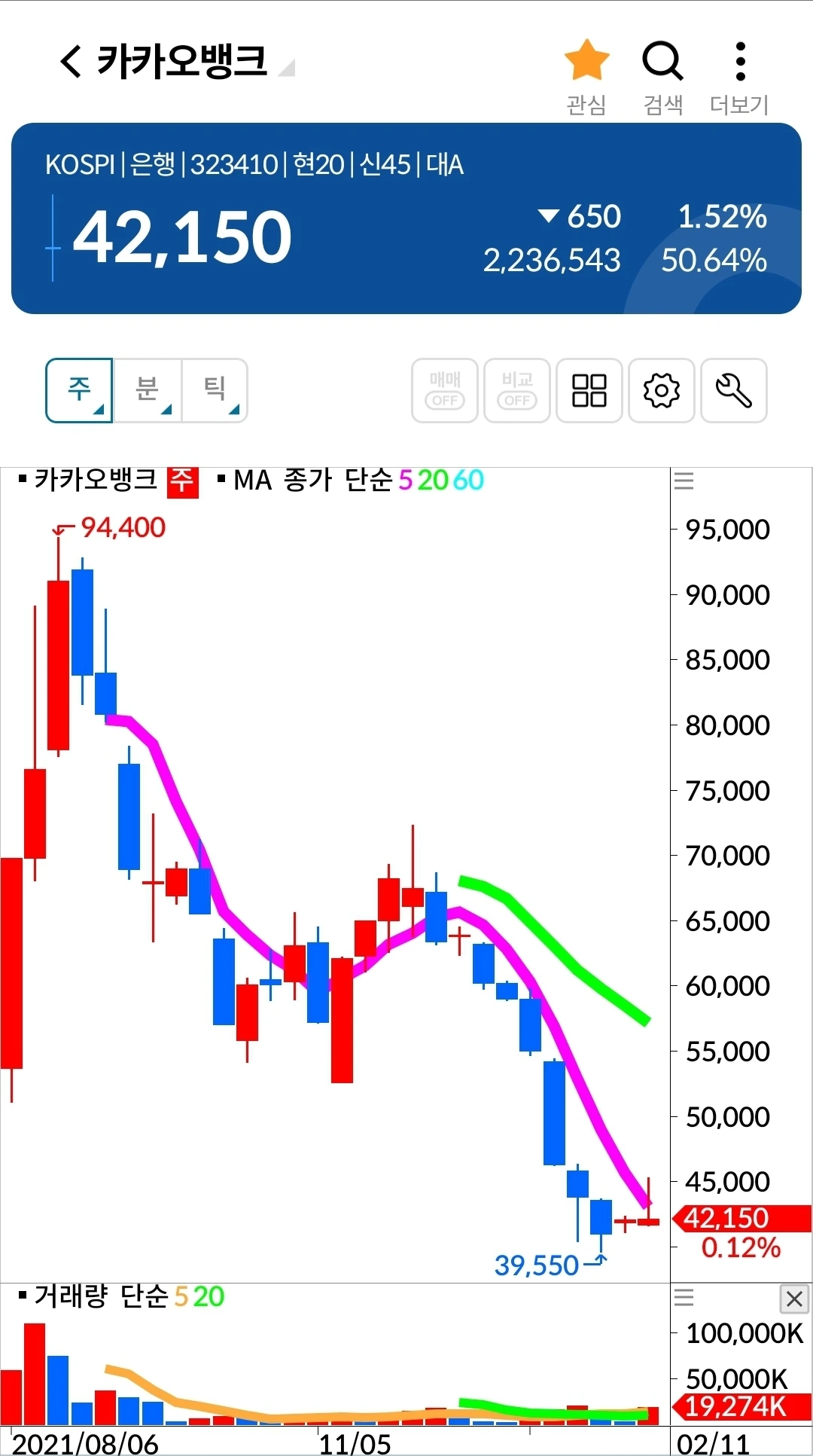 5일선이 20일선을 뚫지 못하고 아래로 쳐지려나보다. 하염없이 떨어진 것이니 단번에 올라갈 수는 없겠지. 기다려주리라. 파이팅!