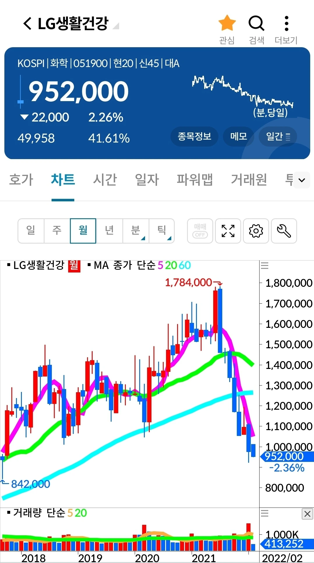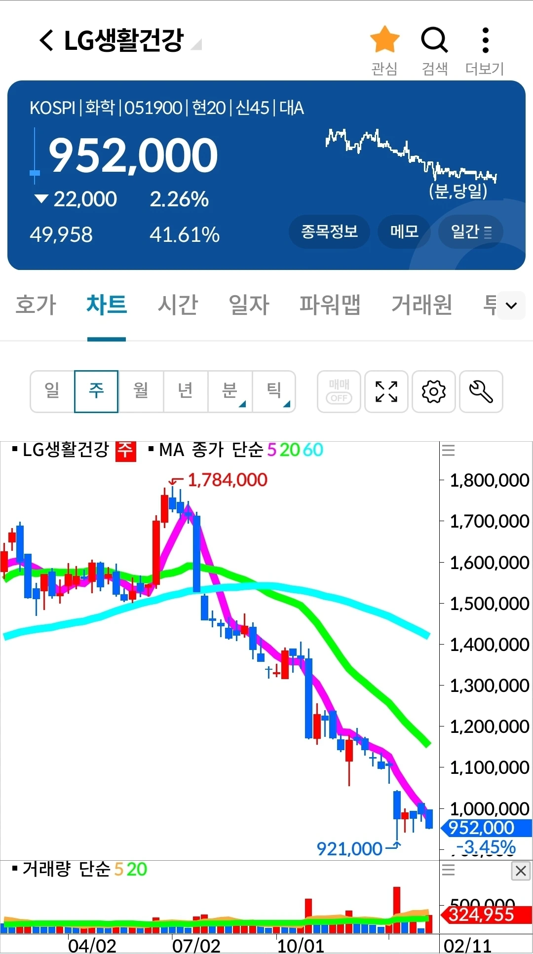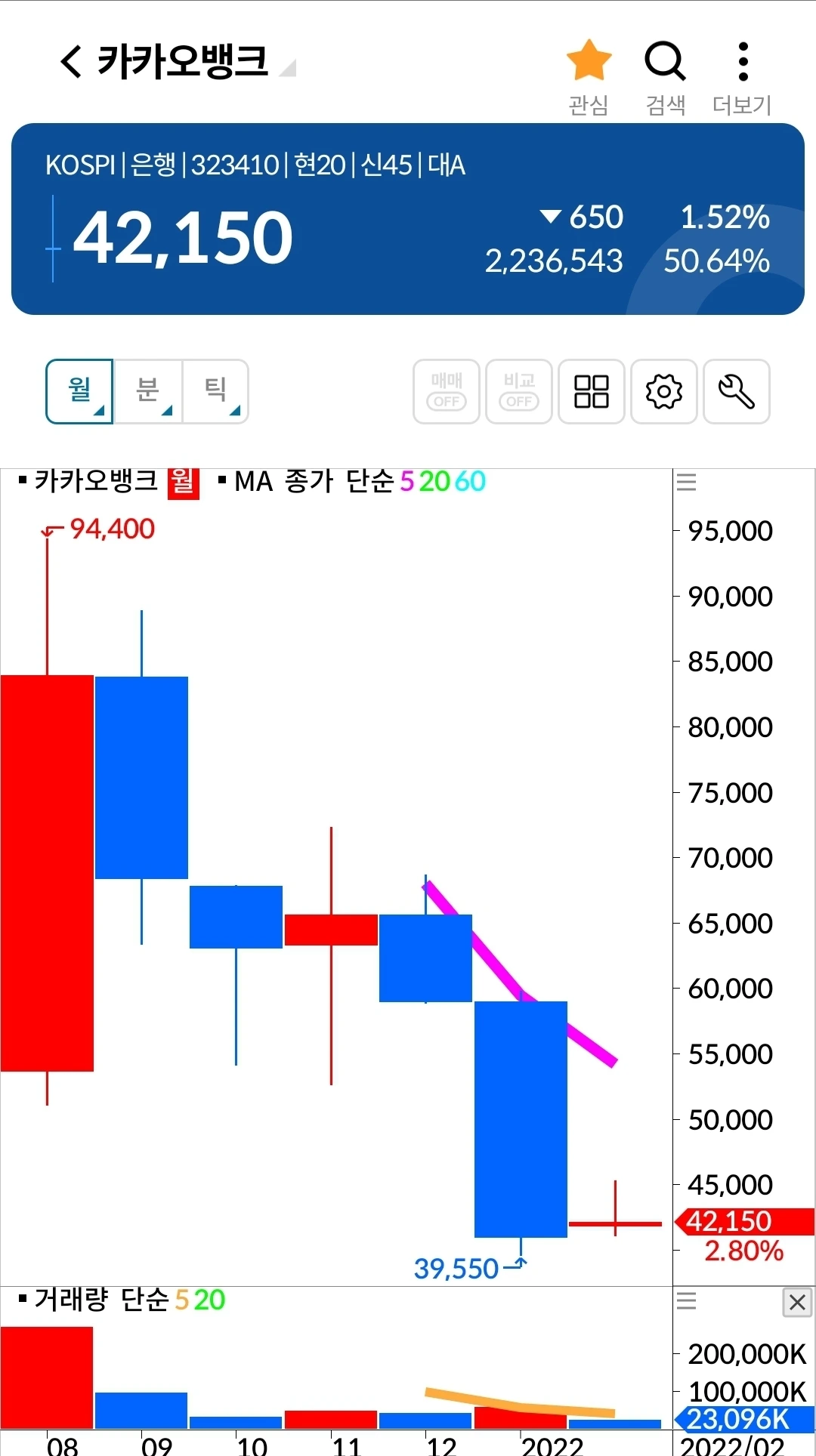 5일선이 20일선을 뚫지 못하고 아래로 쳐지려나보다. 하염없이 떨어진 것이니 단번에 올라갈 수는 없겠지. 기다려주리라. 파이팅!