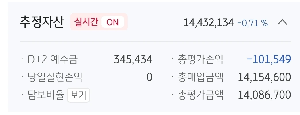 사진 1. 추정자산. 1443만 원. 557만 원 손실 중.