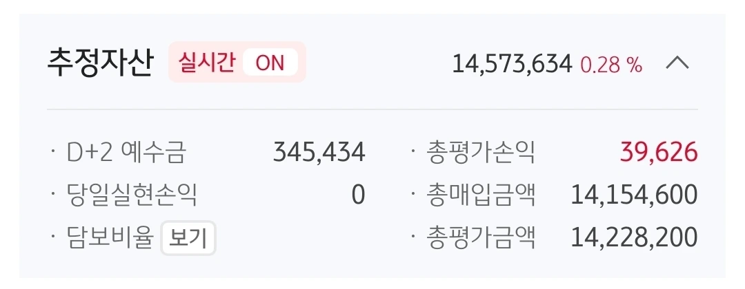 사진 1. 추정자산. 1457만 원. 543만 원 손실 중.