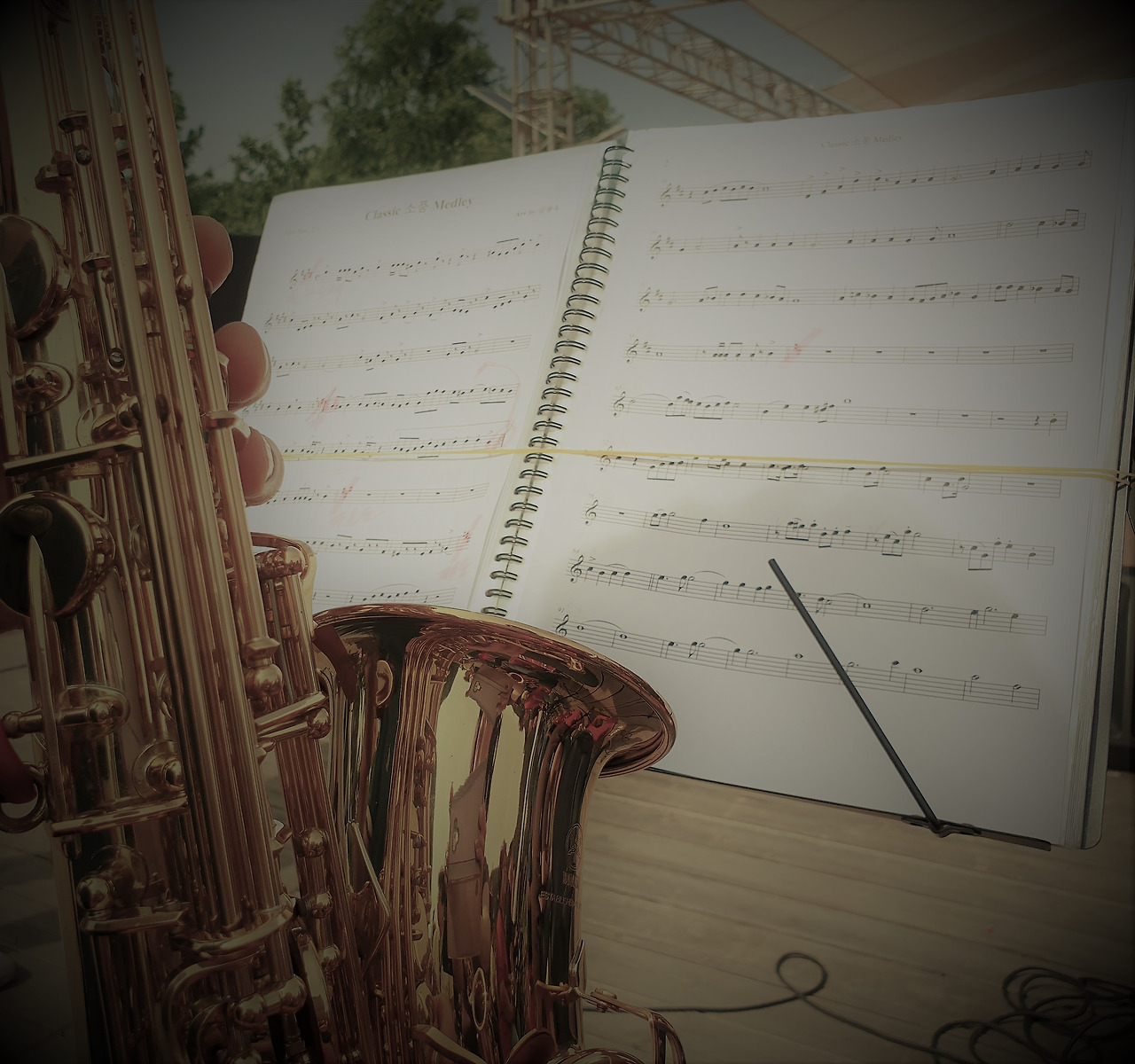 휘리링 겨우 보면대에 받쳐놓은 악보가 바람에 그대로 날아간다. 옆에 분이 노란 고무줄을 껴준다. 조심조심 악보를 고무줄에 고정시킨다. 넘길 때가 문제다. 이리저리 연구한다. 객석에 관중이 모여 온다. 빈 의자가 빽빽이 사람들로 가득 찬다. 오며 가며 빵빵 번쩍번쩍 색소폰들을 들고 설쳐대니 호기심 발동인가 보다. 어린이도 어른도 더 어른도 모두 모두 몰려온다.