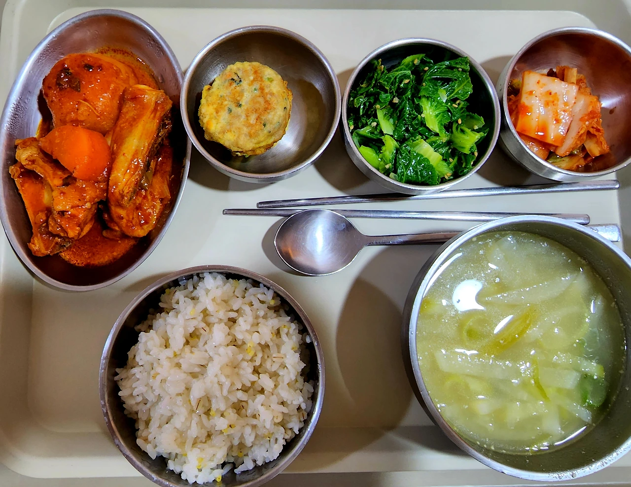 드디어~ 저녁이 왔다. 오홋. 드디어 밥!!! 아 좋아라 푸하하하 재빨리 식사 기도를 마치고 뜨끈뜨끈한 그 모든 것 하나하나 뚜껑을 벗긴다. 아~ 맛있겠다. 와우. 먼저 뜨끈뜨끈 김이 모락모락 나는 국을 한 스푼~ 꿀꺽. 아, 맛있어. 꿀맛.
