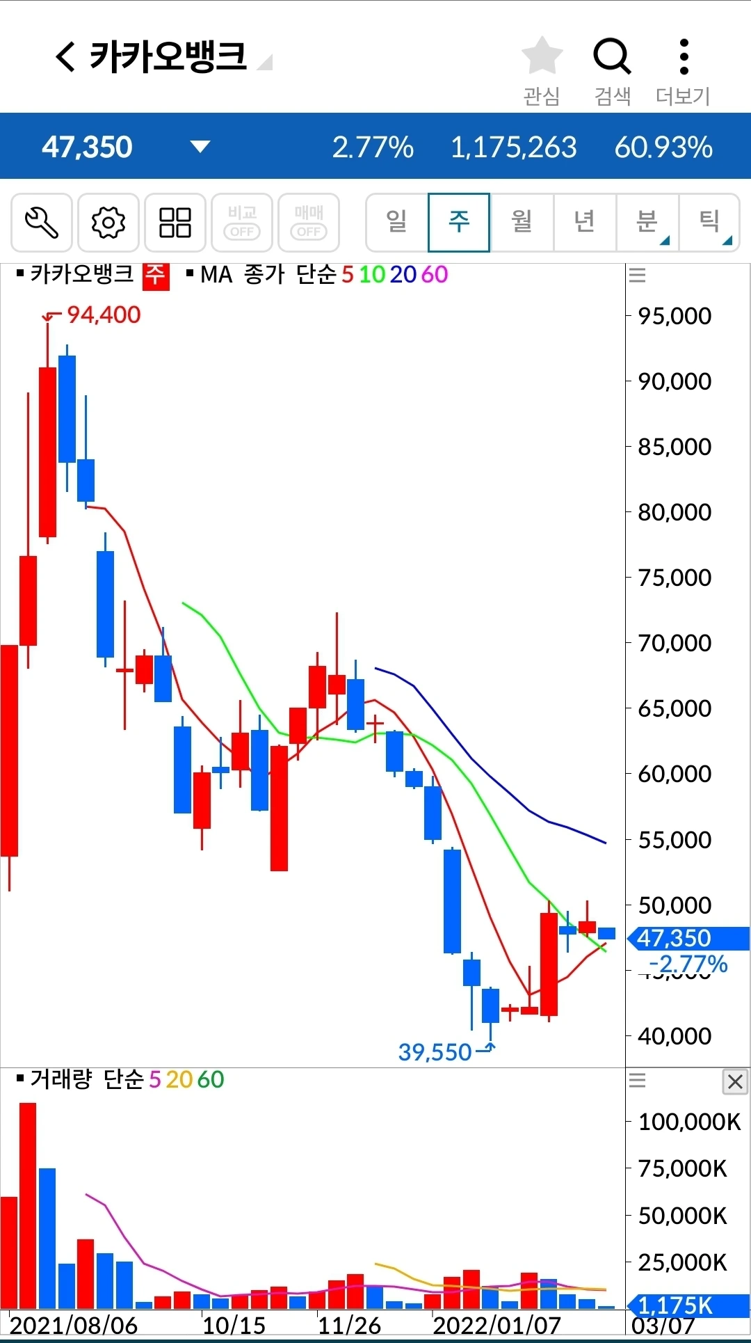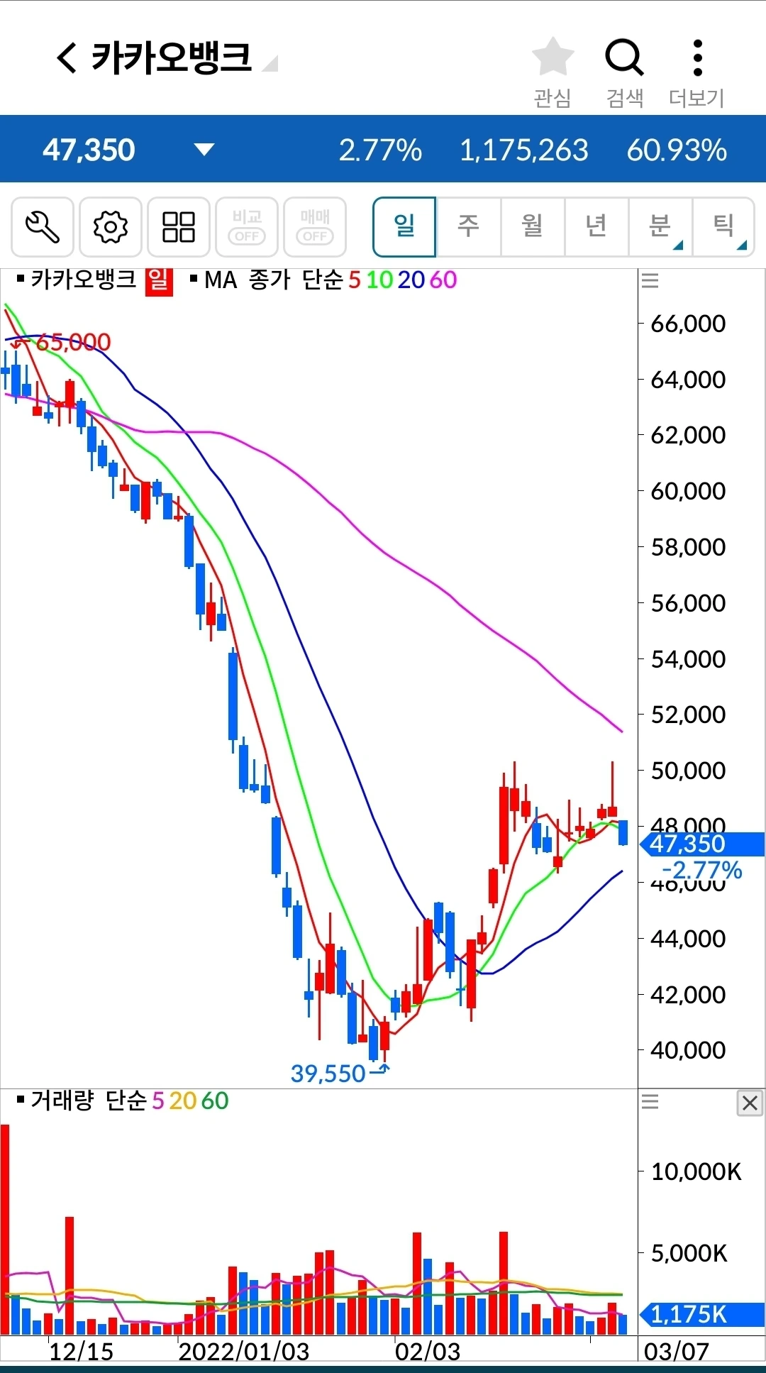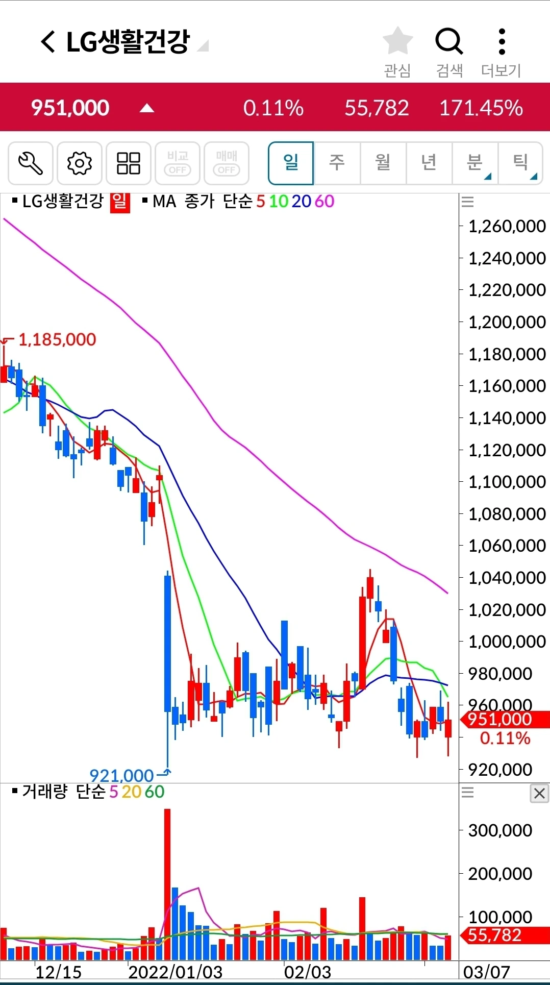 길게 음봉이 나왔다. 장 전체가 안 좋으니 그 와중에 이것만 날아갈 순 없겠지. 기다려주겠습니다. 파이팅!