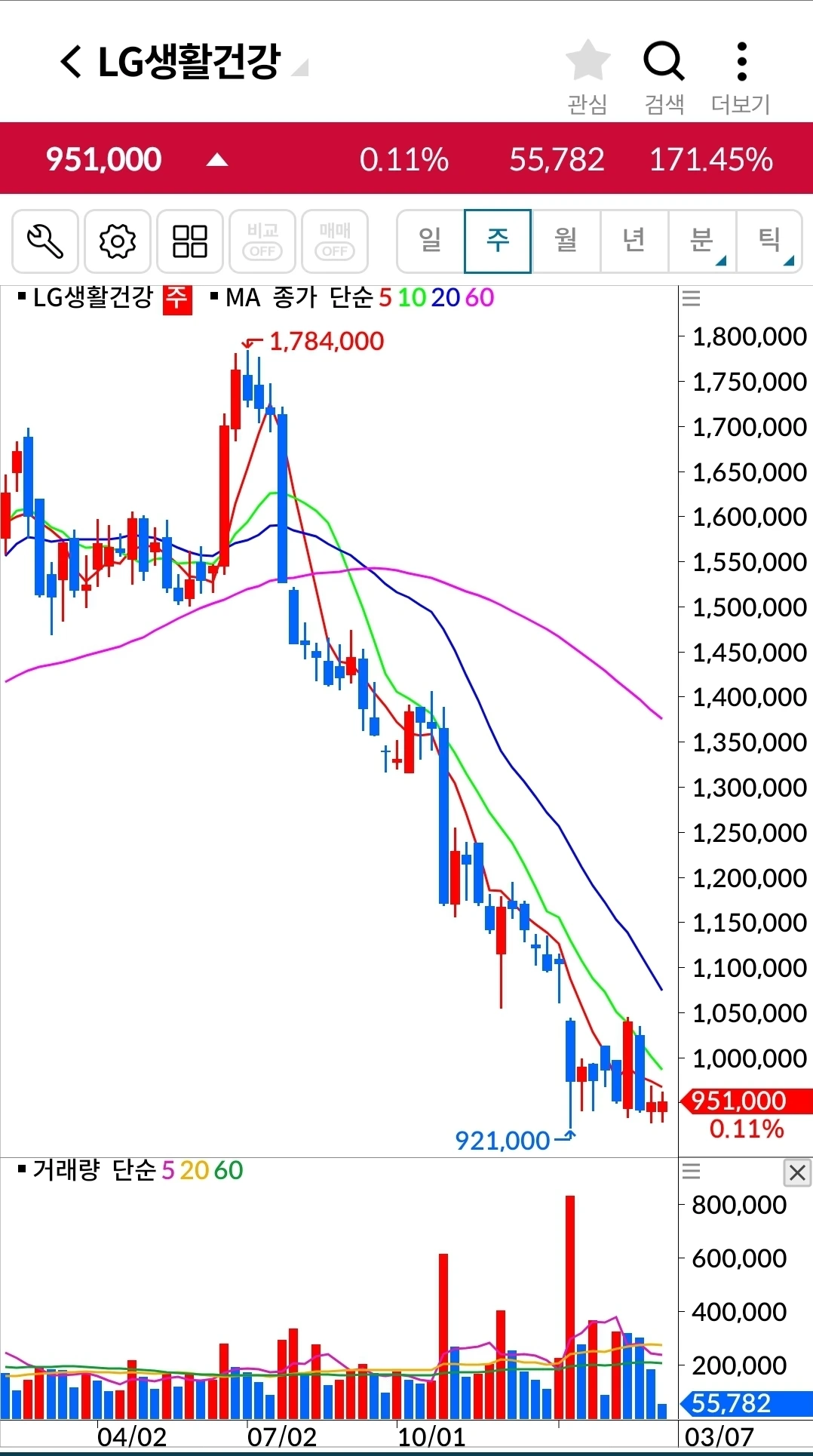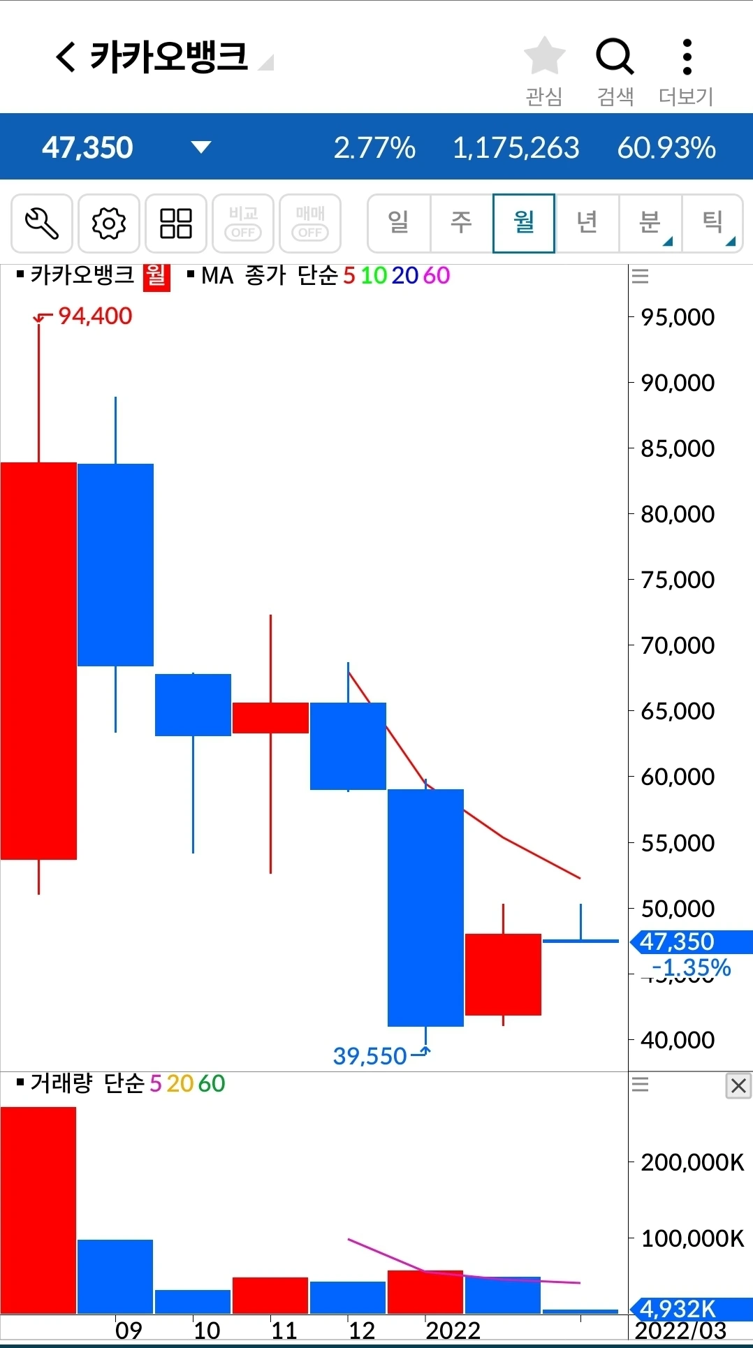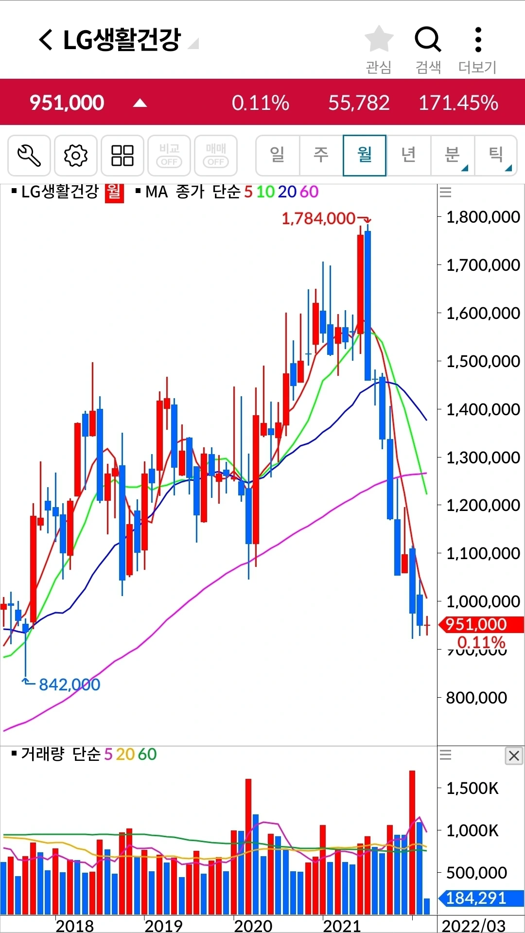 길게 음봉이 나왔다. 장 전체가 안 좋으니 그 와중에 이것만 날아갈 순 없겠지. 기다려주겠습니다. 파이팅!