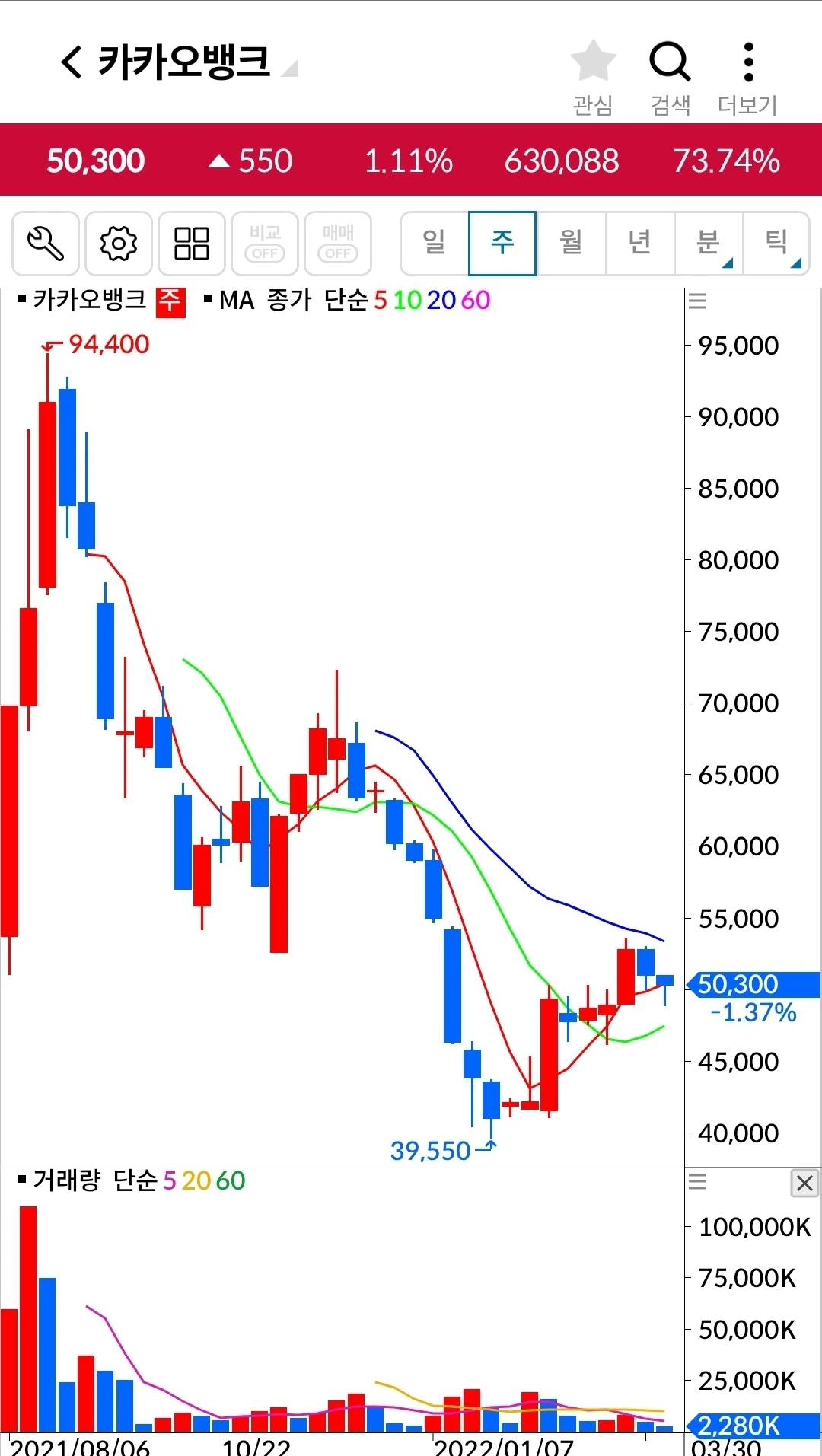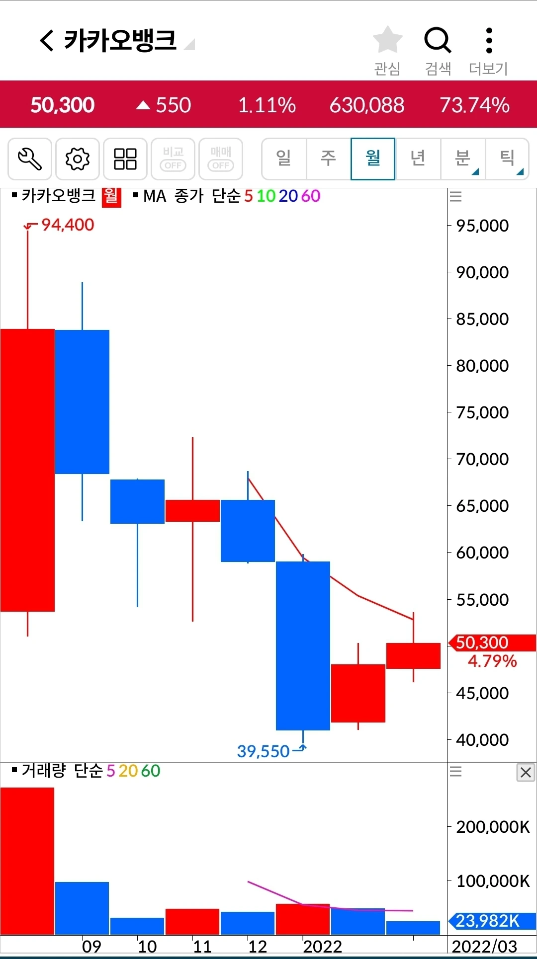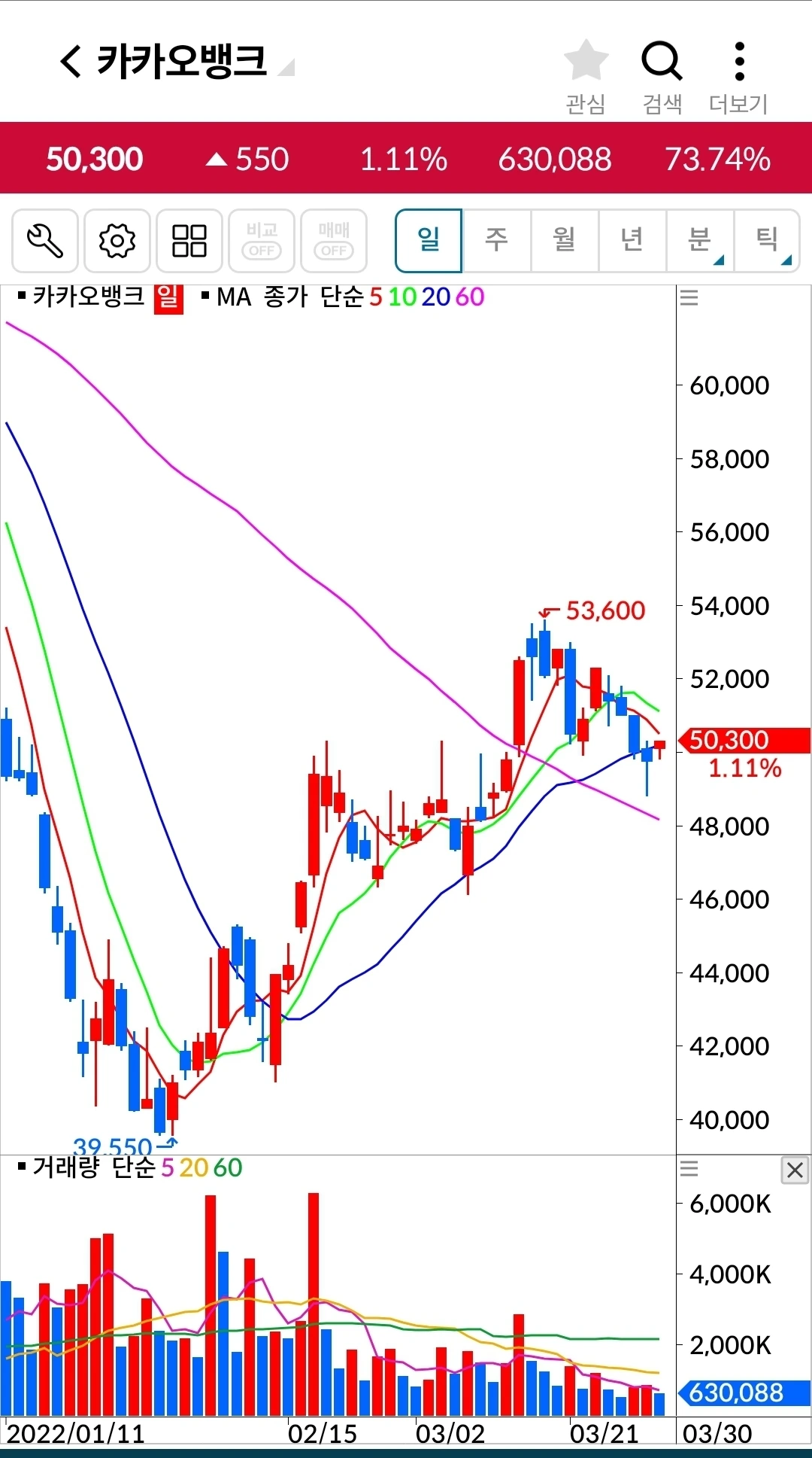 하하 5일선이 20일선을 뚫고 내려오기 직전 드디어 양봉이 나왔다. 너무 코딱지만 하긴 하지만 다행이다. 기다려보자. 파이팅!