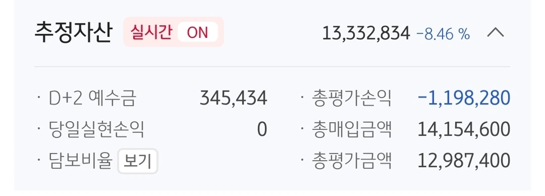 추정자산. 1,333만 원. 667만 원 손실 중.