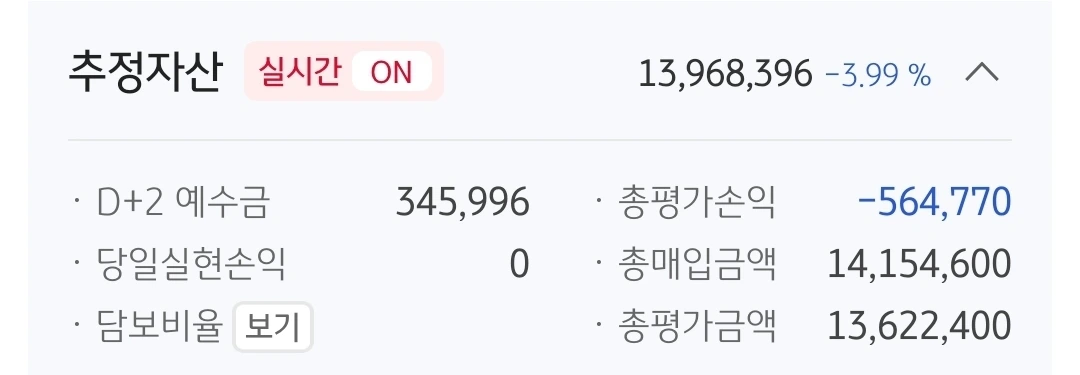 추정자산. 1,396만 원. 604만 원 손실 중.