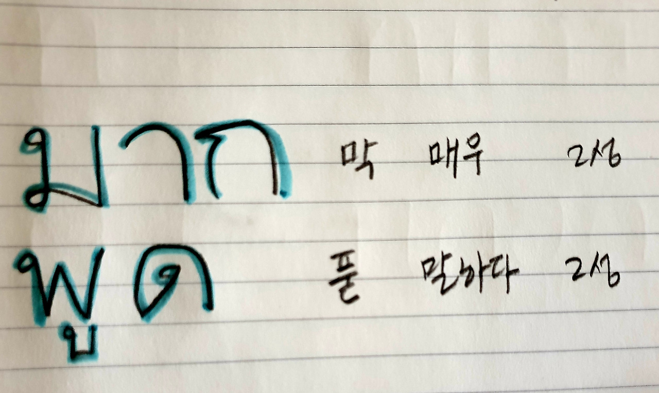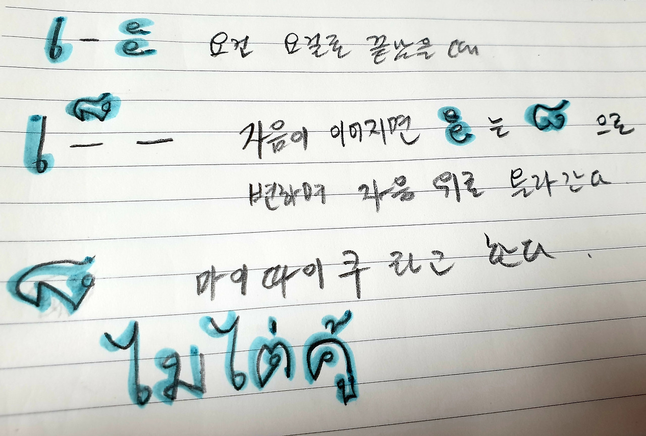 태국어는 무조건 왼쪽에서 오른 쪽으로 읽는 게 아니다. 항상 자음 주위를 살펴야한다. 그 자음에 어떤 모음이